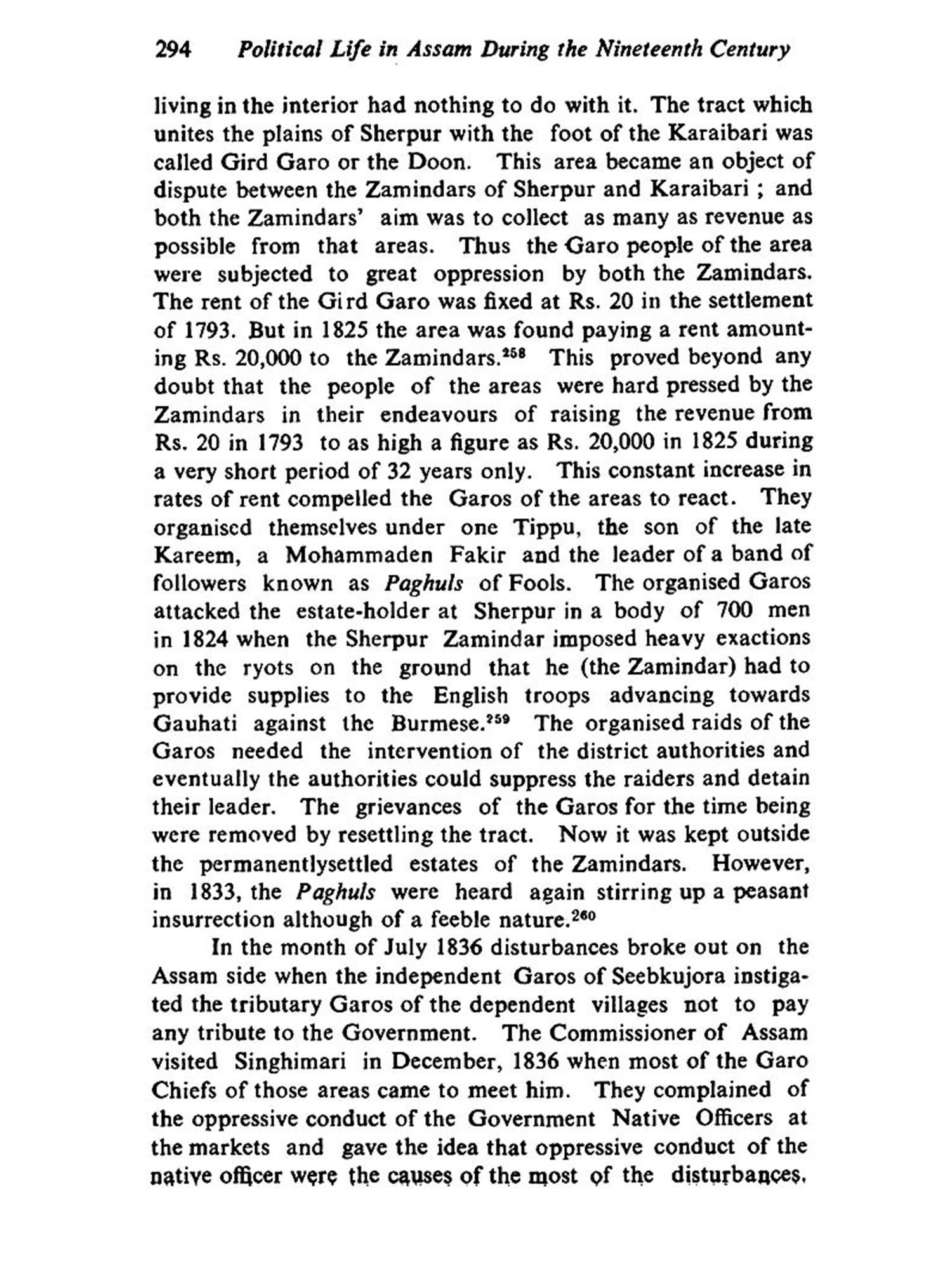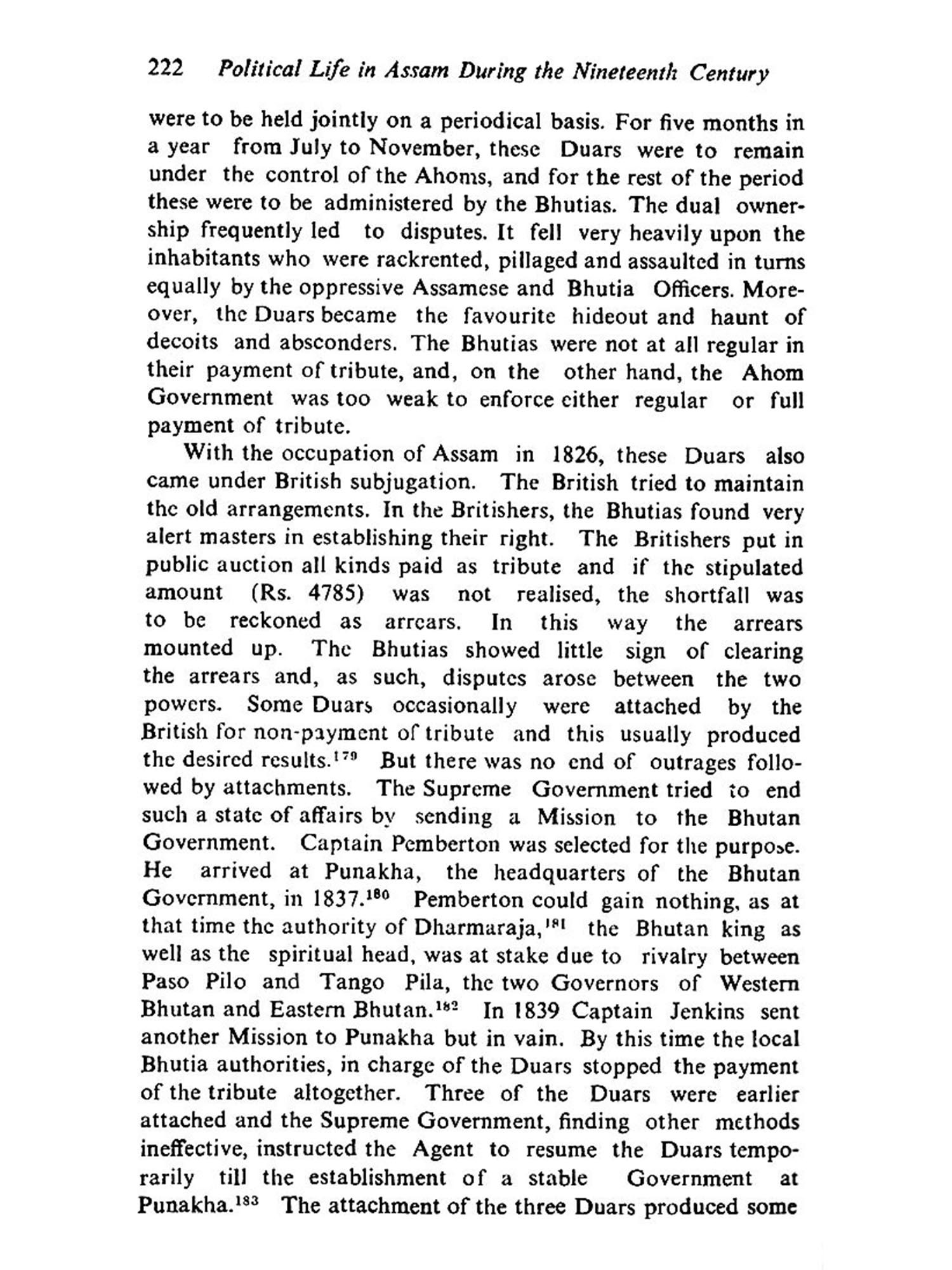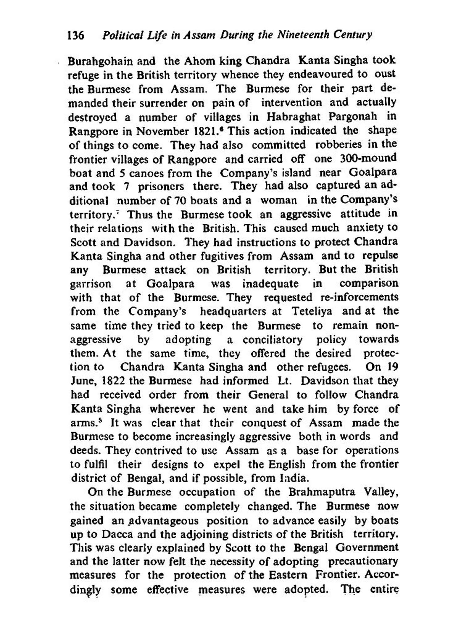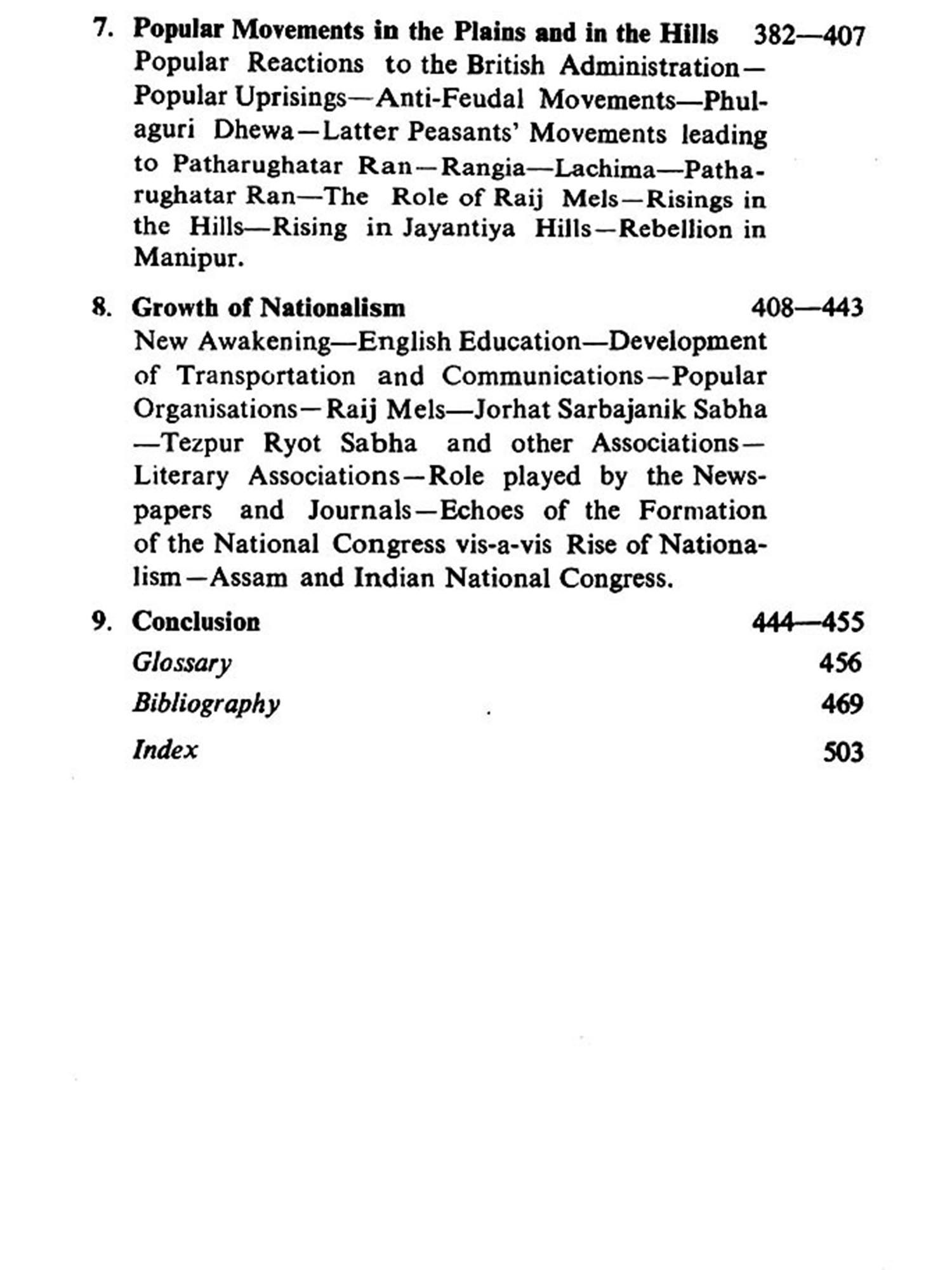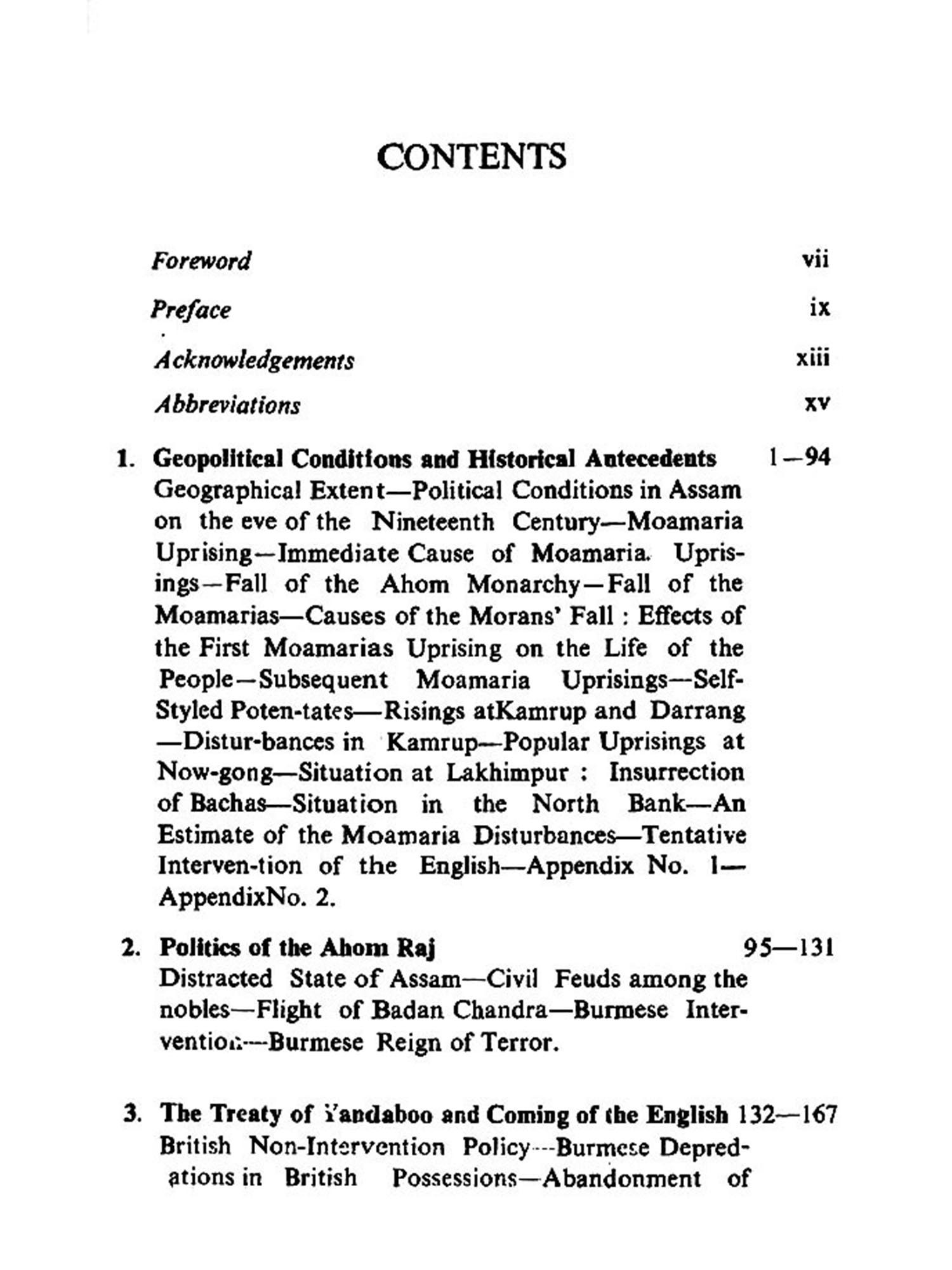 In the present study an endeavour has been made to describe chronologically the activities of a few Ahom princes in the early period of the British supremacy, establishment of the British administration in the province, popular reactions to it, and the impact of British administrative policies on the life and society in their varied aspects. An account of the origins, development and activities of various organs of popular and public opinion form important part of the present study.