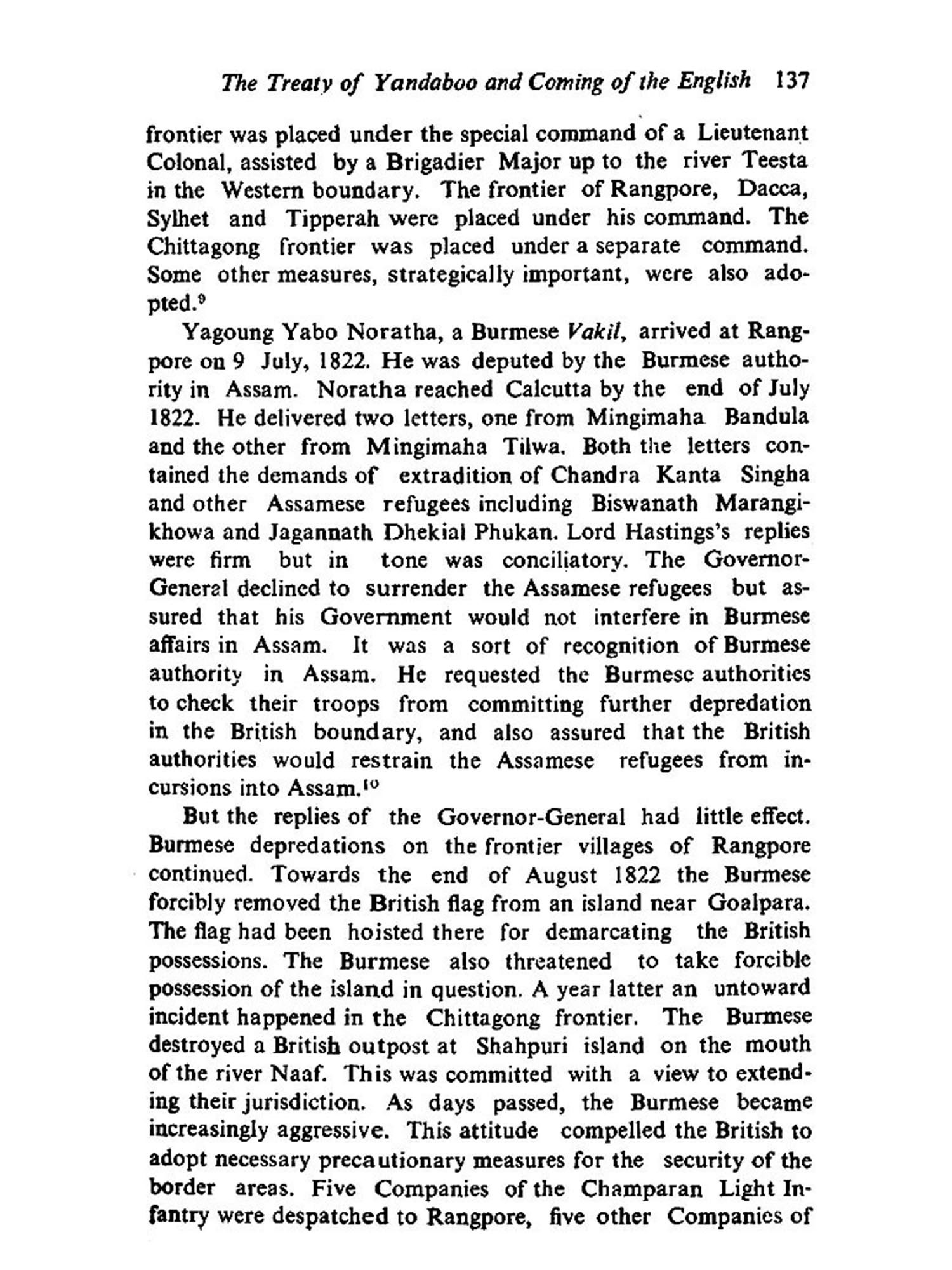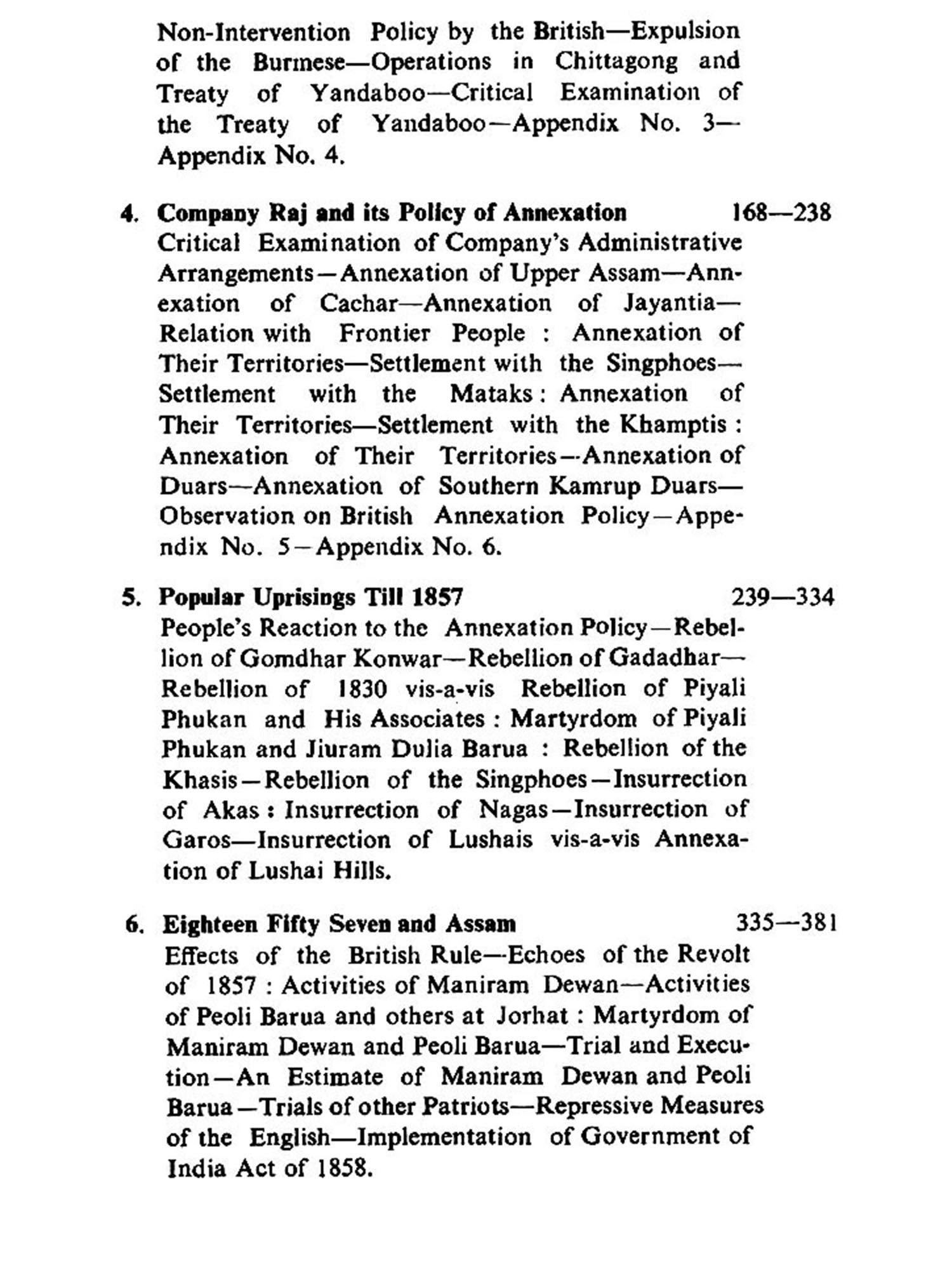 Chapter 3 is devoted to a study of the British role in expelling the Burmese from Ahom and their becoming the masters of the land under the Treaty of Yandaboo which con-cluded the Anglo-Burmese War. The effects of the Treaty on Assam and the kingdom of Cachar, Jayantia and Manipur have also been discussed.
