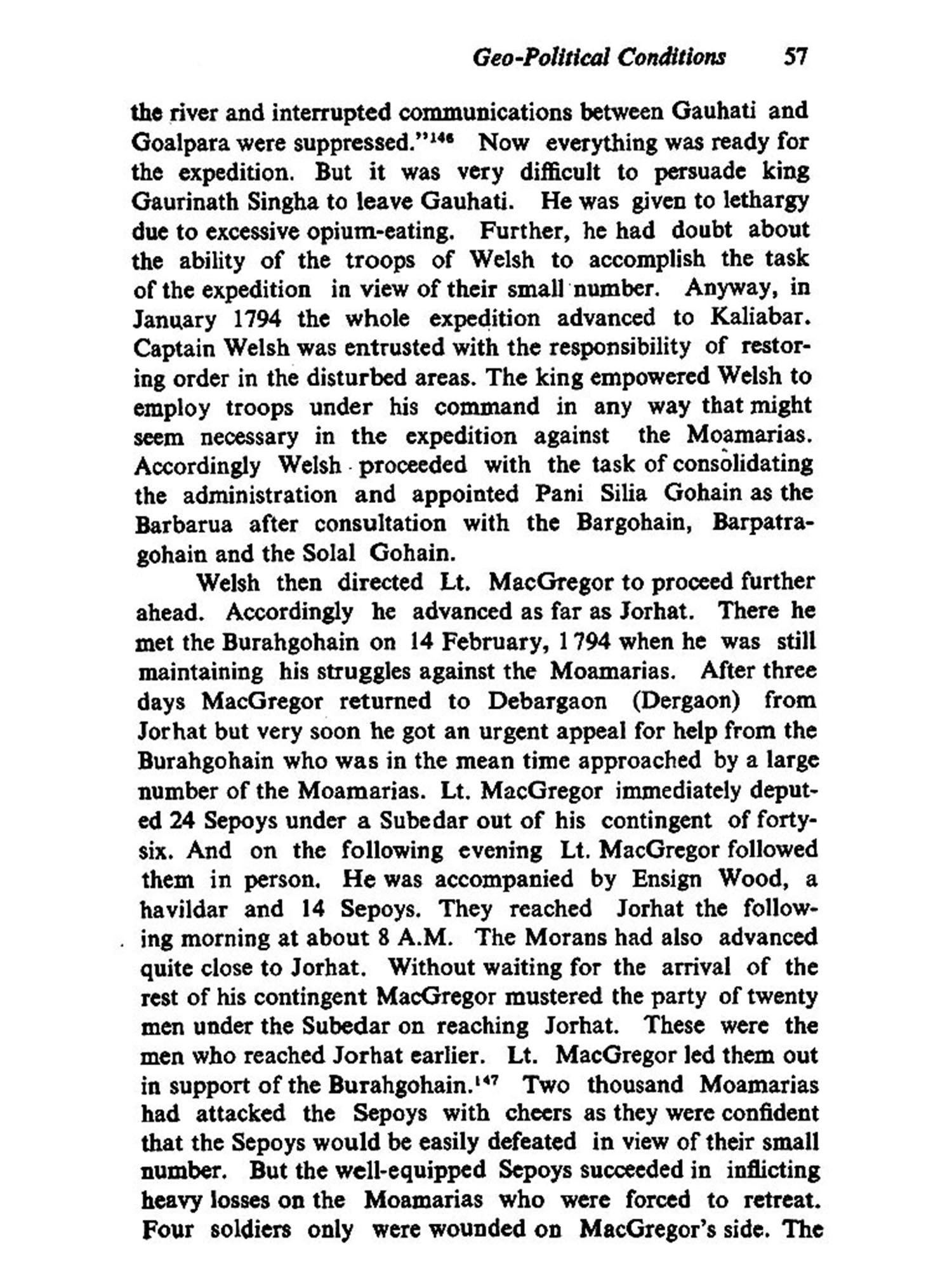 Chapter 1 deals with the geo-political conditions that marked the beginning of the nineteenth century in Assam. It is considered to be a useful introduction for reasons of a study of this nature. It also covers the historical background that led the Moamoria Uprisings and their impact on the Ahom monarchy.