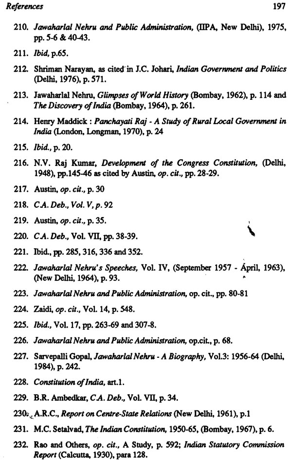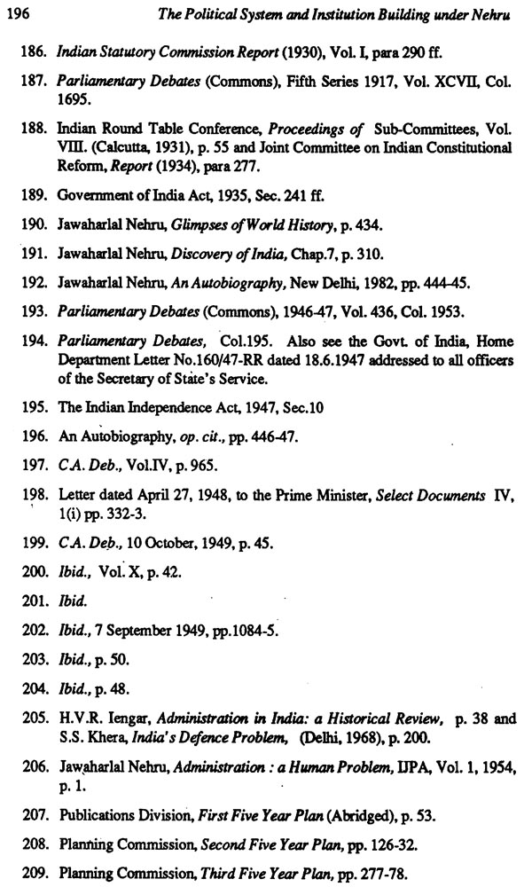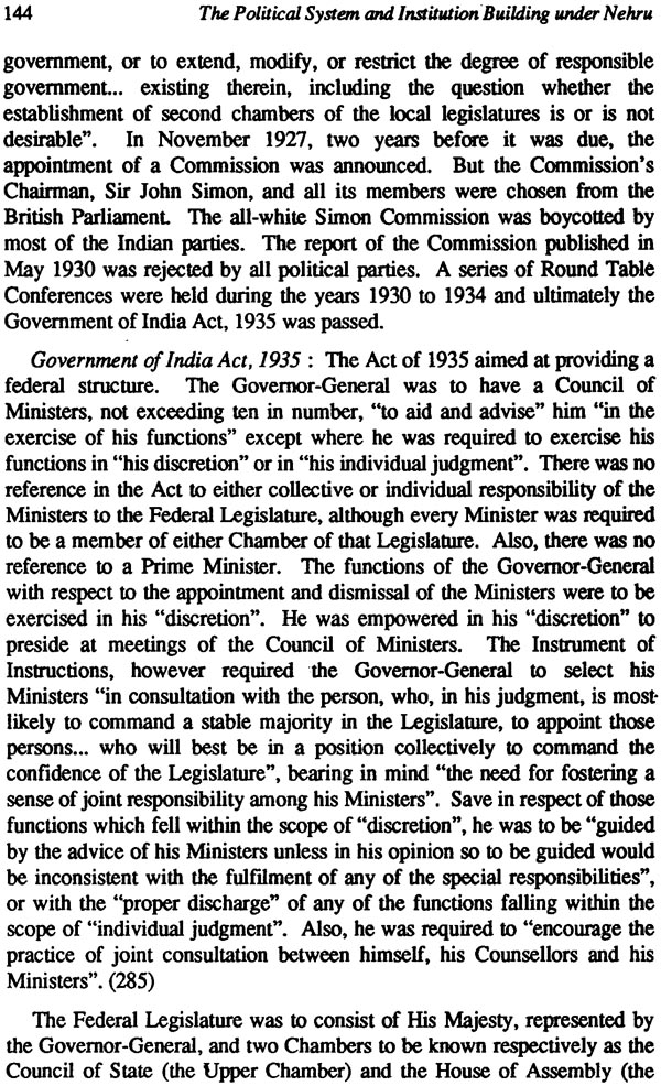 This study seeks to present the saga of the evolution of India's political system and to offer an analysis of institution-building in various areas and at different levels of polity. The Nehru phase in the history of the Indian political system (1946-1964) stands out as the period of democratic institutionalization par excellence. It was an era of great challenges and crises, full of excitement, endeavour and achievements. The concept of the Constituent Assembly was Nehru's brain child. The philosophy and guiding principles of the Constitution were conceived by him. The structure of the Constitution followed almost entirely the blueprint drawn by him as early as in 1939. He played the most significant part in establishing a representative parliamentary democracy with ministerial responsibility, Panchayati Raj institutions at the grassroots, a polity federal in structure and unitary in spirit with division of powers between the Union and the States, and a professional non-political civil service to implement the policies and programmes formulated by the government and approved by Parliament.