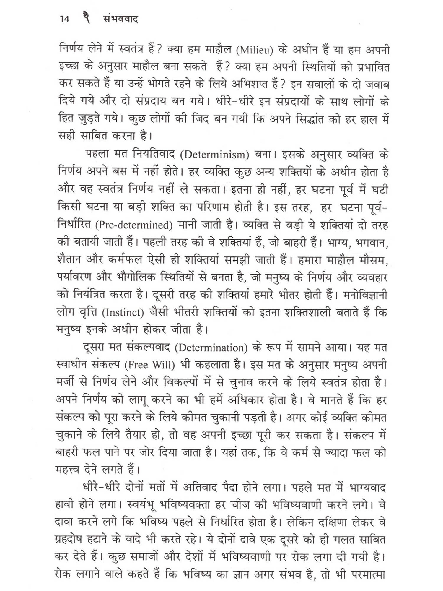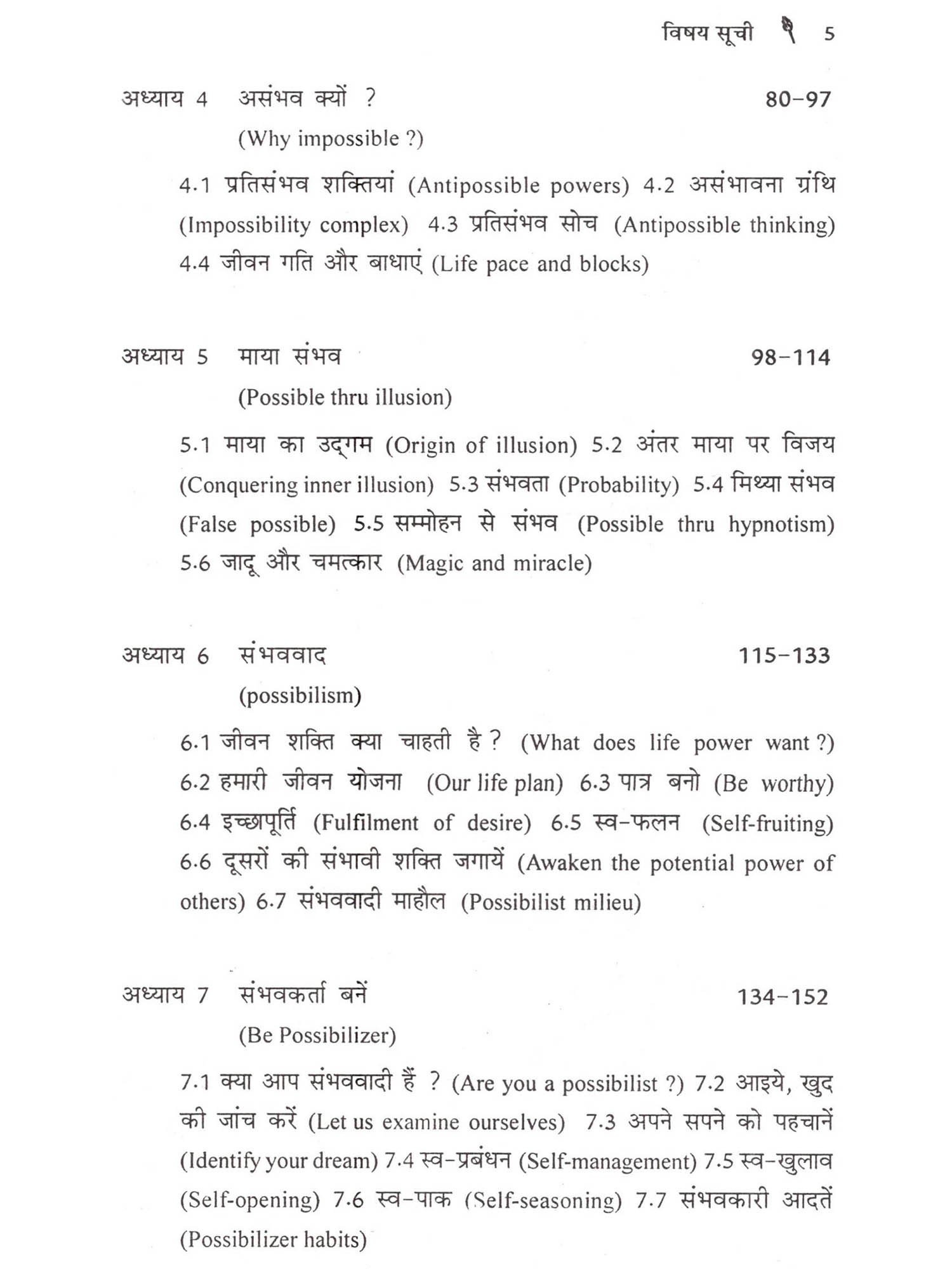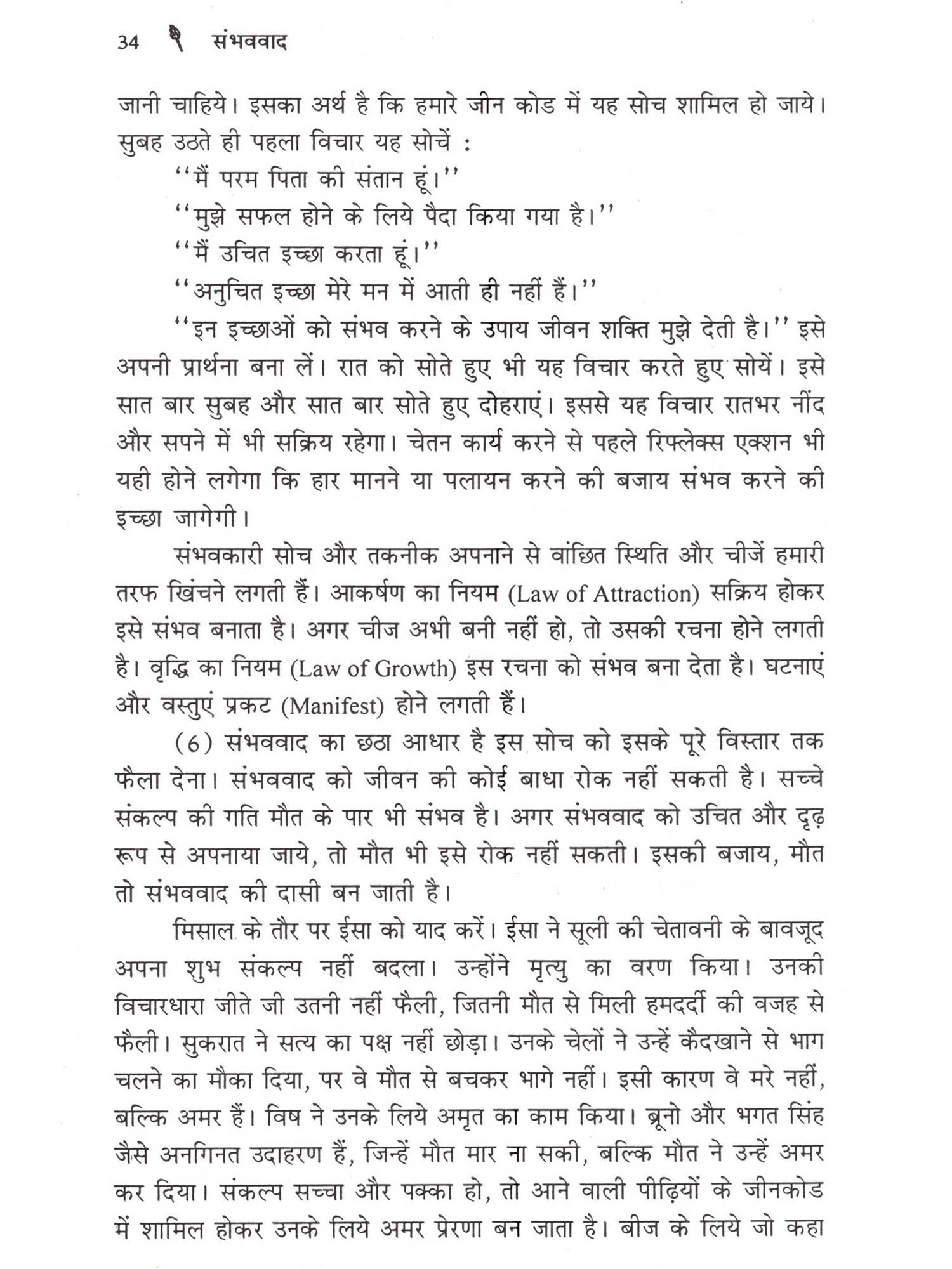 हमारे पूर्वज सभ्य होने से पहले पशुओं के साथ उन्हीं की तरह जीवन जीते थे। सभ्यता के साथ प्रकृति और स्थिति पर विजय पाने का संकल्प जोर पकड़ने लगा। दूसरी तरफ, यह विचार भी प्रभावी होने लगा कि भाग्य के लिखे को तो भोगना ही पड़ेगा। ईसा ने पाप क्षमा और कृष्ण ने कर्मयोग का आह्वान जरूर किया, लेकिन कर्म के दंड भोगने का भय हम पर हावी रहा। कम्युनिस्ट लोगों ने क्रांति करके भेदभाव मिटाने की कोशिशें कीं। अमीरों से संपत्ति छीन ली गयी, पर गरीबों के दिल में अमीरी के प्रति घृणा भर दी गयी। शोषित और गरीब लोगों का अमीर बनना संभव नहीं हुआ। क्या असंभव में कोई संभावना छुपी होती है, जिसे तलाश करके हम उसे संभव बना सकें ? क्या पतित का उद्धार होना संभव है ? हमारे जीवन की बुनियाद इस विश्वास पर टिकी होती है कि जीवन और जगत का स्वभाव कैसा है! एक अनार और सौ बीमार की बुनियाद को सच मानें, तो छीनझपट, संघर्ष और दुख ही जीवन है। कुछ राहबरों ने जीवन और जगत को दुख बताया। हालांकि यह विश्वास सच नहीं था, पर विश्वास की शक्ति के कारण यह फलीभूत हो गया। अगर एक अनार के कुछ दाने बो दें, तो कई पौधे उगेंगे। इस तरह, सौ बीमारों के लिए हजारों अनार मिल सकेंगे। रचना धर्म की बुनियाद पर टिके जीवन और जगत में प्रचुरता और अनंत आपूर्ति मिलने लगेगी। हर रोज उठते ही हमारे सामने दो रास्ते होते हैं। या तो हम जाग कर भी सपने देखते रहें या उठ कर सपनों को संभव बनाने का प्रयास करें। जैसे बीज में पचासों फुट ऊंचा पेड़ छिपा होता है, वैसे ही हमारे जीन कोड में जीवन वृक्ष छिपा होता है, जो फलने-फूलने का इंतजार कर रहा है। नकारात्मक सोच सिर्फ विफलता और बुराई पर ध्यान केंद्रित रखती है। सकारात्मक सोच बुराई से बचते रहकर लाभ पर टिकी रहती है। संभववादी सोच बुराई में भी संभावना की तलाश करती है और कांटों का भी सम्मान करती है, क्योंकि वे फूलों की रक्षा करते हैं। जहर से ही सांप काटने की दवा बनती है। गरीबी सफलता को असंभव बना देती है, लेकिन सही उपाय करने पर गरीबी को भी असंभव बनाया जा सकता है। सिर्फ एक पुस्तक होने की बजाय, यह एक विचारधारा है। छिपी हुई संभावनाओं को संभव बनाने की विधियां इसमें बतायी गयी हैं। कई संभवकर्ता लोगों के सच्चे उदाहरण भी दिये गये हैं। संभवकारी अभ्यासों को हर कोई अपना कर संभवकर्ता बन सकता है। संभववाद व्यक्ति से लेकर परिवार, समाज, देश और दुनियाभर के लिए अपनाया जा सकता है। अंतिम अध्याय में संभवशास्त्र (Possibology) की बुनियाद रखी गयी है। साधनों की छीनझपट में उलझे रहने की बजाय, नये साधनों की रचना को संभव बनाना ही हमारा मूल मंतव्य है।