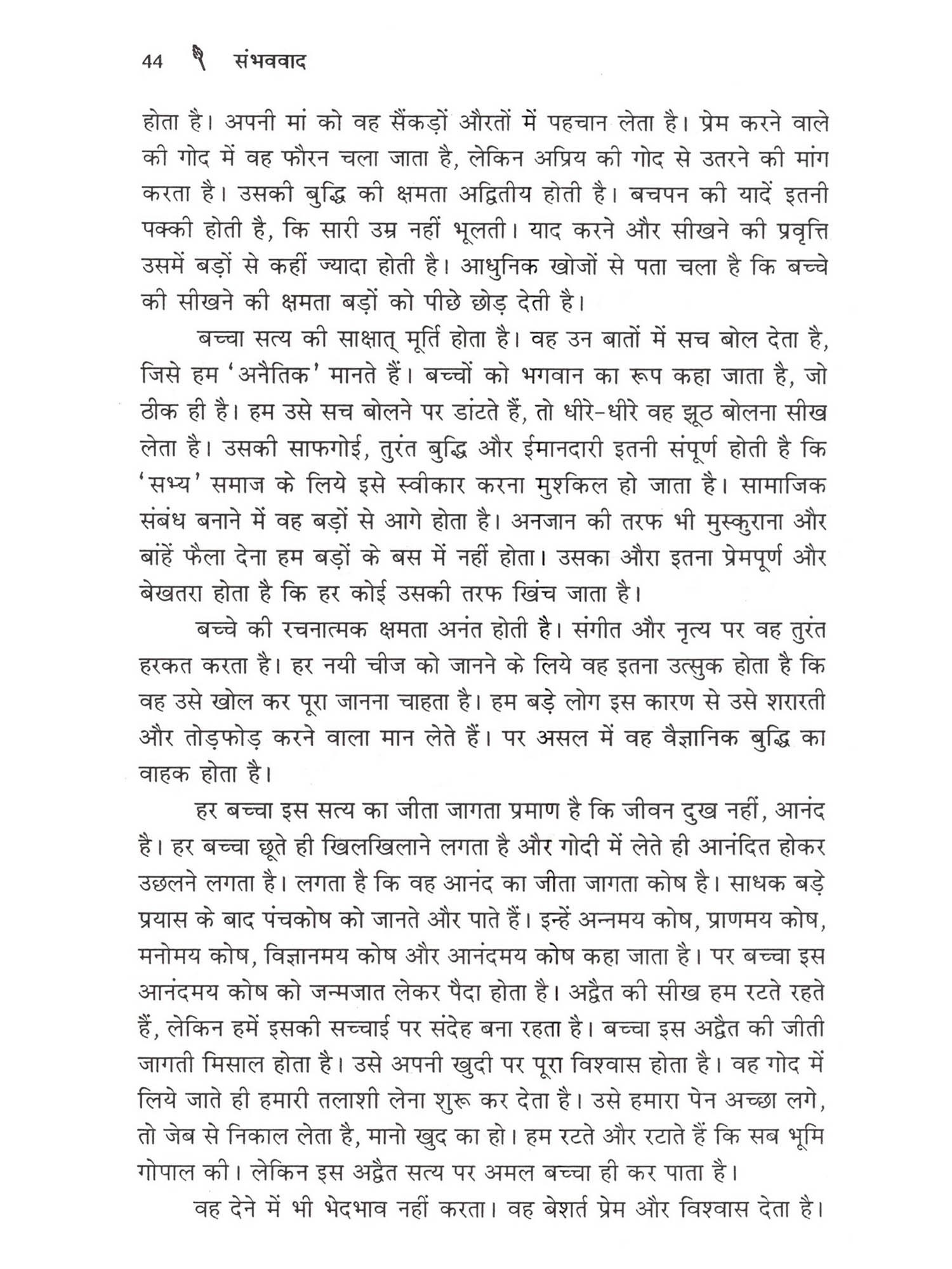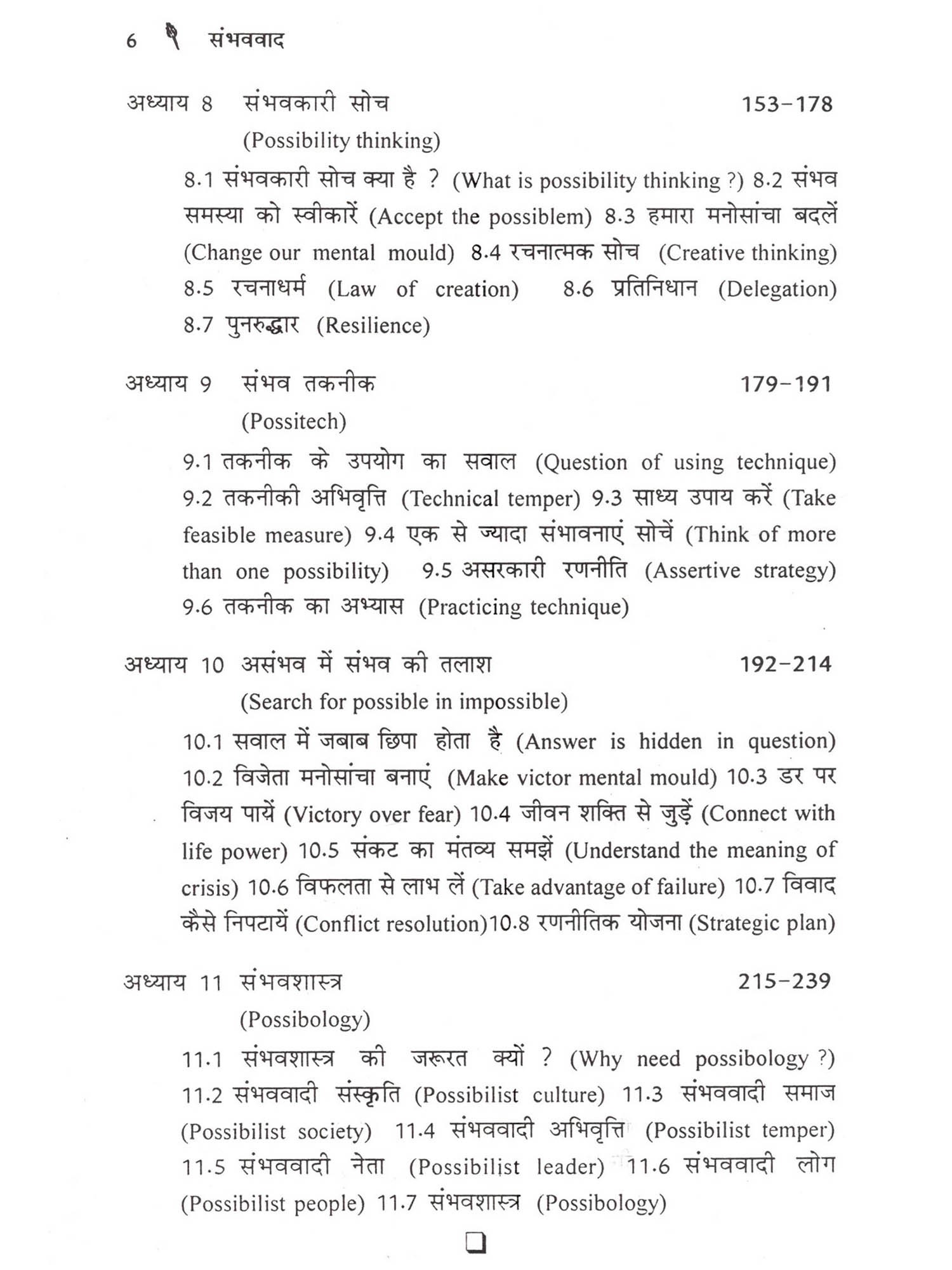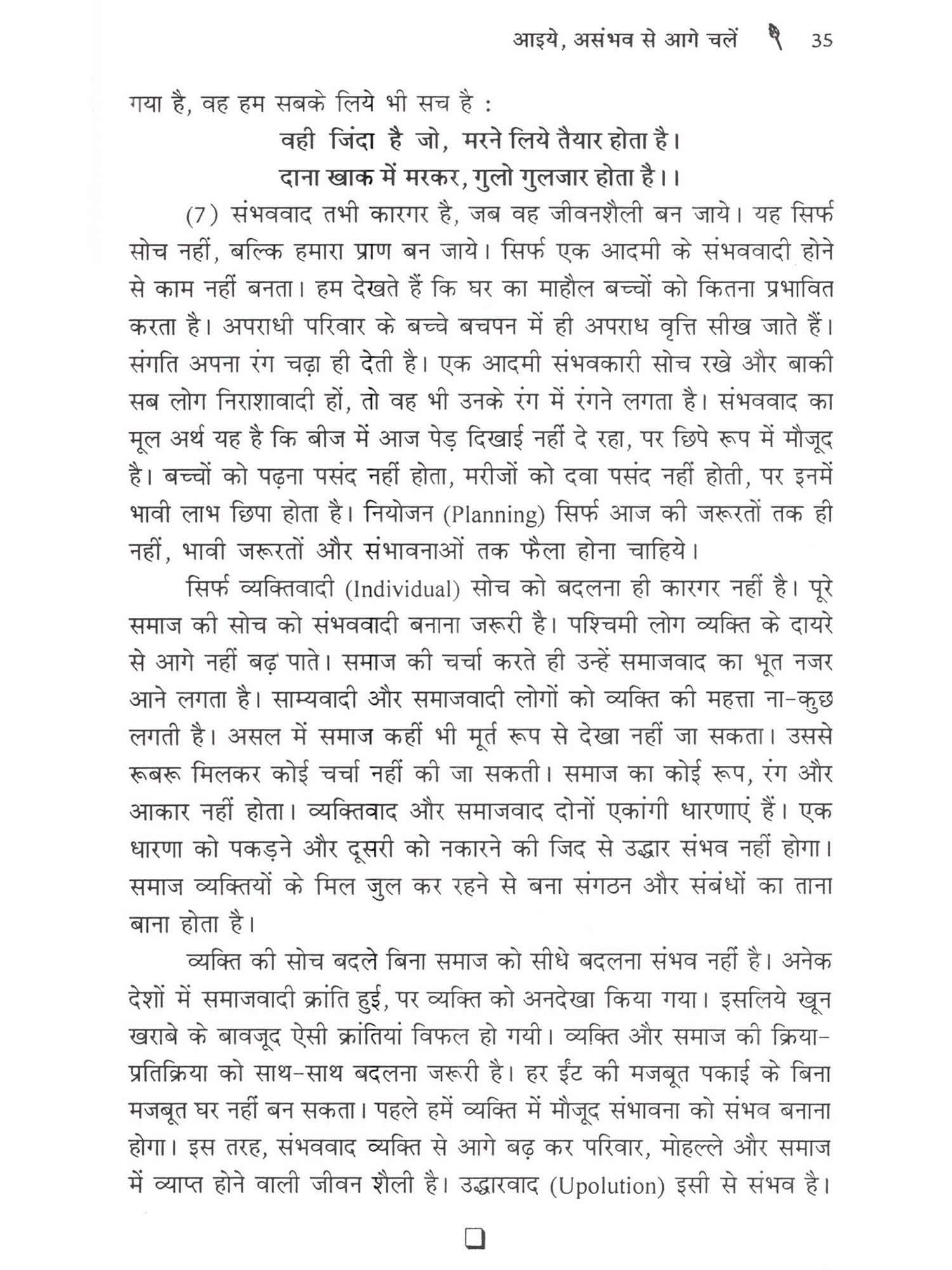 हमारे पूर्वज सभ्य होने से पहले पशुओं के साथ उन्हीं की तरह जीवन जीते थे। सभ्यता के साथ प्रकृति और स्थिति पर विजय पाने का संकल्प जोर पकड़ने लगा। दूसरी तरफ, यह विचार भी प्रभावी होने लगा कि भाग्य के लिखे को तो भोगना ही पड़ेगा। ईसा ने पाप क्षमा और कृष्ण ने कर्मयोग का आह्वान जरूर किया, लेकिन कर्म के दंड भोगने का भय हम पर हावी रहा। कम्युनिस्ट लोगों ने क्रांति करके भेदभाव मिटाने की कोशिशें कीं। अमीरों से संपत्ति छीन ली गयी, पर गरीबों के दिल में अमीरी के प्रति घृणा भर दी गयी। शोषित और गरीब लोगों का अमीर बनना संभव नहीं हुआ। क्या असंभव में कोई संभावना छुपी होती है, जिसे तलाश करके हम उसे संभव बना सकें ? क्या पतित का उद्धार होना संभव है ? हमारे जीवन की बुनियाद इस विश्वास पर टिकी होती है कि जीवन और जगत का स्वभाव कैसा है! एक अनार और सौ बीमार की बुनियाद को सच मानें, तो छीनझपट, संघर्ष और दुख ही जीवन है। कुछ राहबरों ने जीवन और जगत को दुख बताया। हालांकि यह विश्वास सच नहीं था, पर विश्वास की शक्ति के कारण यह फलीभूत हो गया। अगर एक अनार के कुछ दाने बो दें, तो कई पौधे उगेंगे। इस तरह, सौ बीमारों के लिए हजारों अनार मिल सकेंगे। रचना धर्म की बुनियाद पर टिके जीवन और जगत में प्रचुरता और अनंत आपूर्ति मिलने लगेगी। हर रोज उठते ही हमारे सामने दो रास्ते होते हैं। या तो हम जाग कर भी सपने देखते रहें या उठ कर सपनों को संभव बनाने का प्रयास करें। जैसे बीज में पचासों फुट ऊंचा पेड़ छिपा होता है, वैसे ही हमारे जीन कोड में जीवन वृक्ष छिपा होता है, जो फलने-फूलने का इंतजार कर रहा है। नकारात्मक सोच सिर्फ विफलता और बुराई पर ध्यान केंद्रित रखती है। सकारात्मक सोच बुराई से बचते रहकर लाभ पर टिकी रहती है। संभववादी सोच बुराई में भी संभावना की तलाश करती है और कांटों का भी सम्मान करती है, क्योंकि वे फूलों की रक्षा करते हैं। जहर से ही सांप काटने की दवा बनती है। गरीबी सफलता को असंभव बना देती है, लेकिन सही उपाय करने पर गरीबी को भी असंभव बनाया जा सकता है। सिर्फ एक पुस्तक होने की बजाय, यह एक विचारधारा है। छिपी हुई संभावनाओं को संभव बनाने की विधियां इसमें बतायी गयी हैं। कई संभवकर्ता लोगों के सच्चे उदाहरण भी दिये गये हैं। संभवकारी अभ्यासों को हर कोई अपना कर संभवकर्ता बन सकता है। संभववाद व्यक्ति से लेकर परिवार, समाज, देश और दुनियाभर के लिए अपनाया जा सकता है। अंतिम अध्याय में संभवशास्त्र (Possibology) की बुनियाद रखी गयी है। साधनों की छीनझपट में उलझे रहने की बजाय, नये साधनों की रचना को संभव बनाना ही हमारा मूल मंतव्य है।