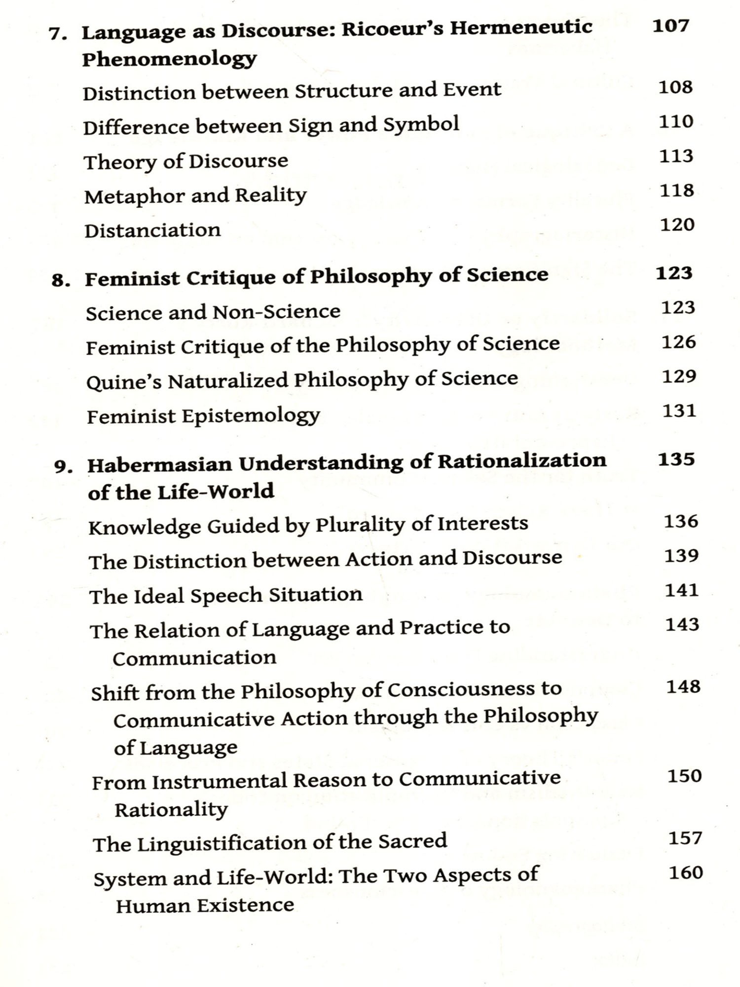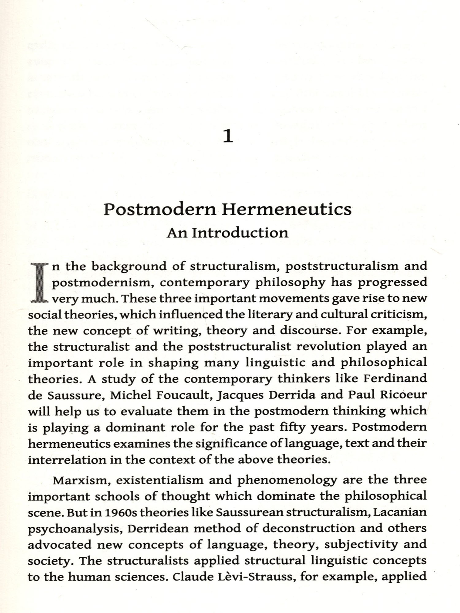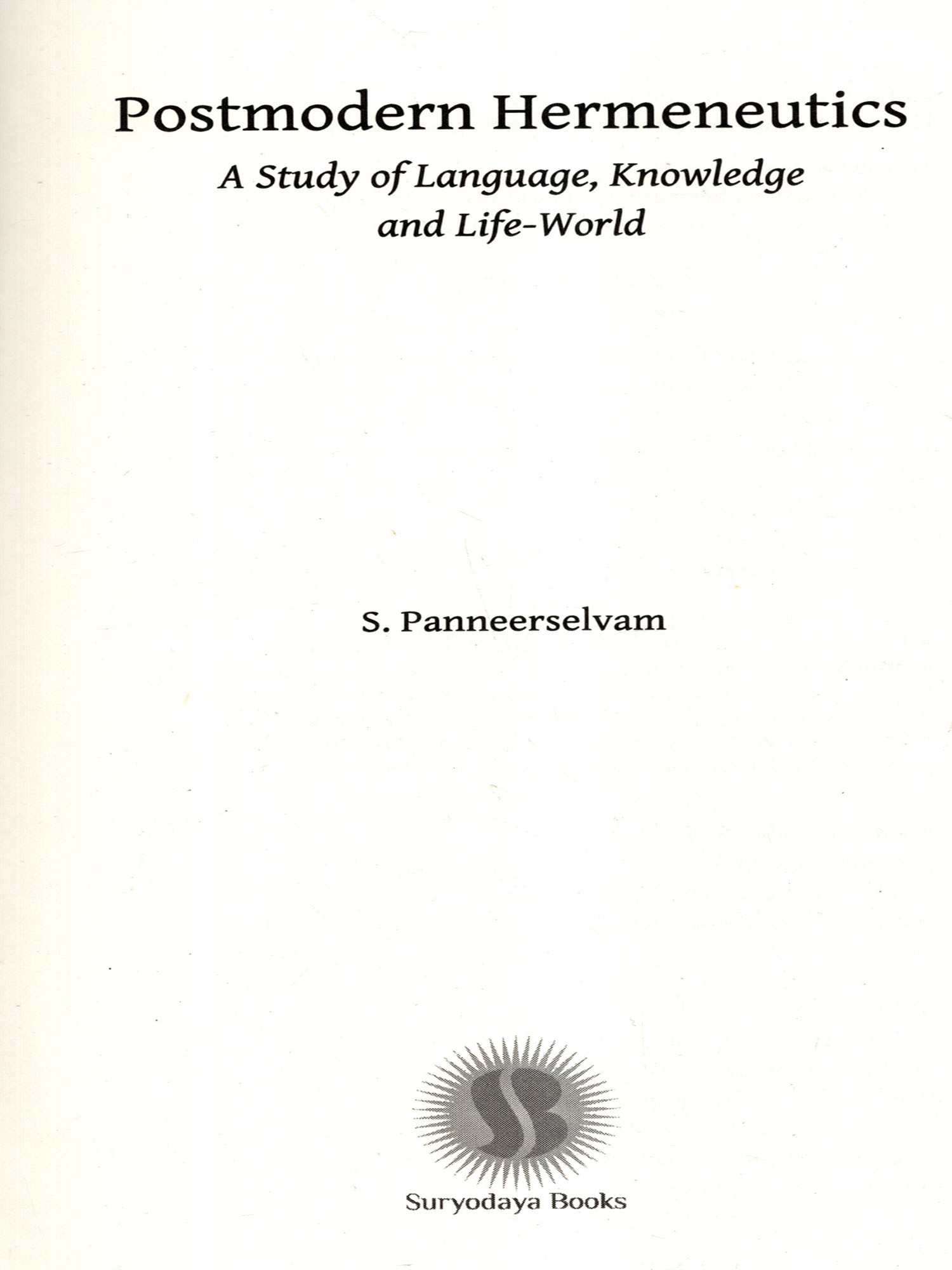 THE BOOK is an attempt to apply postmodern hermeneutics in the study of language, i.e. the theory of meaning and interpretation of the life-world in human knowledge and understanding. Four types of hermeneutics such as, philosophical hermeneutics (Gadamer), radical hermeneutics (Ricoeur), critical hermeneutics (Habermas), and deconstructive hermeneutics (Derrida) are discussed under postmodern hermeneutics. All the above thinkers have been influenced and at the same time critiqued the contributions made by the great phenomenological masters like, Husserl and Heidegger.