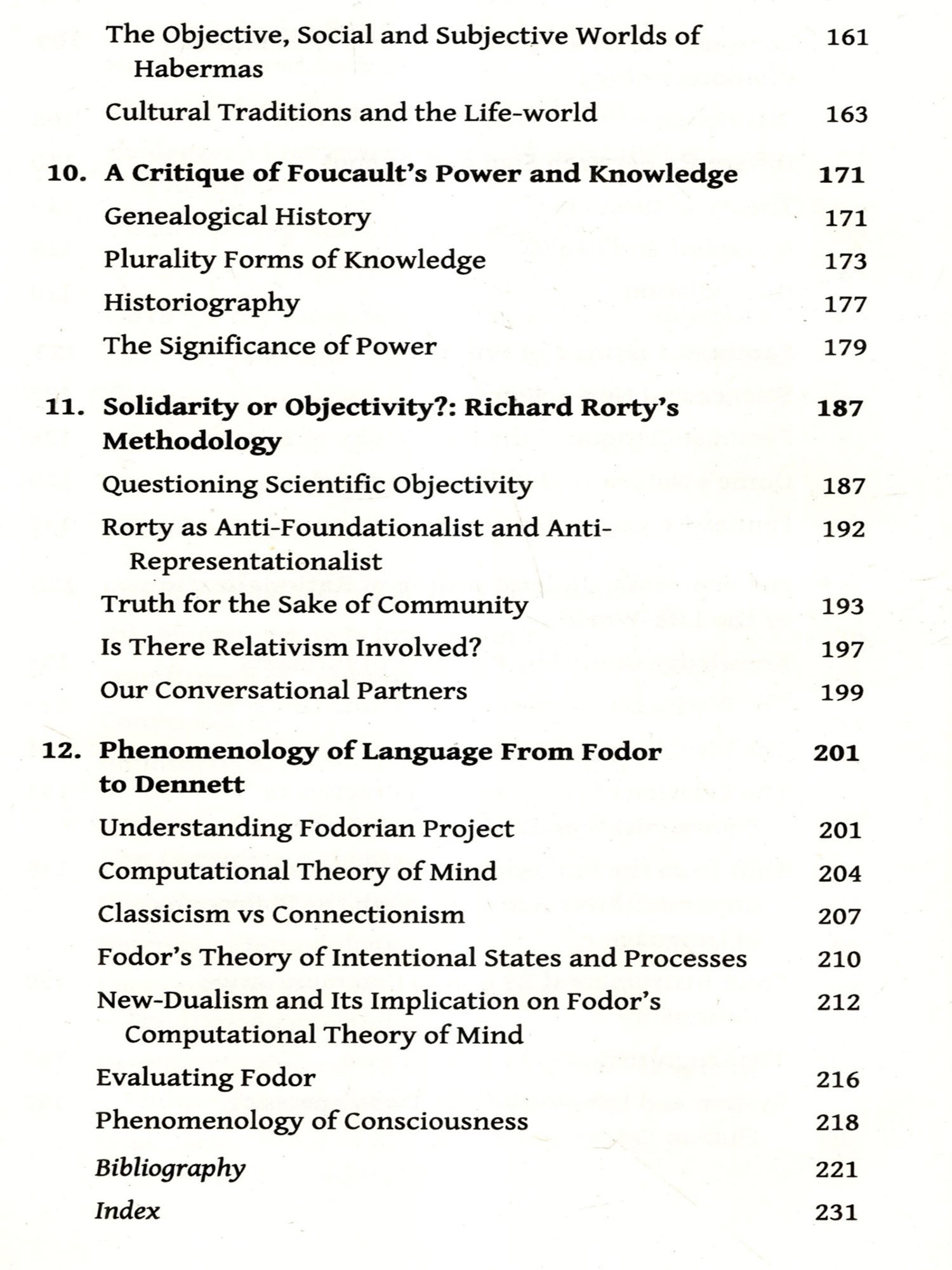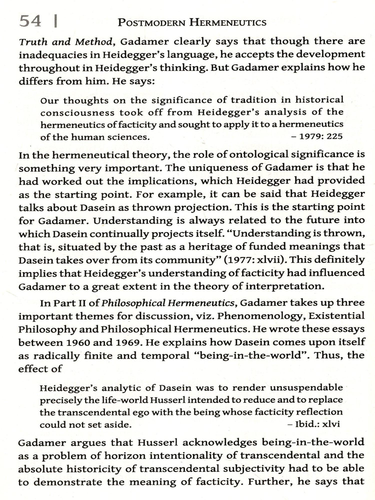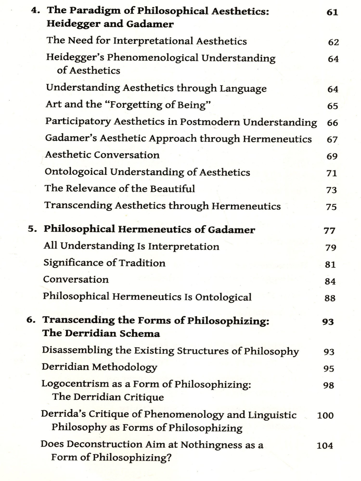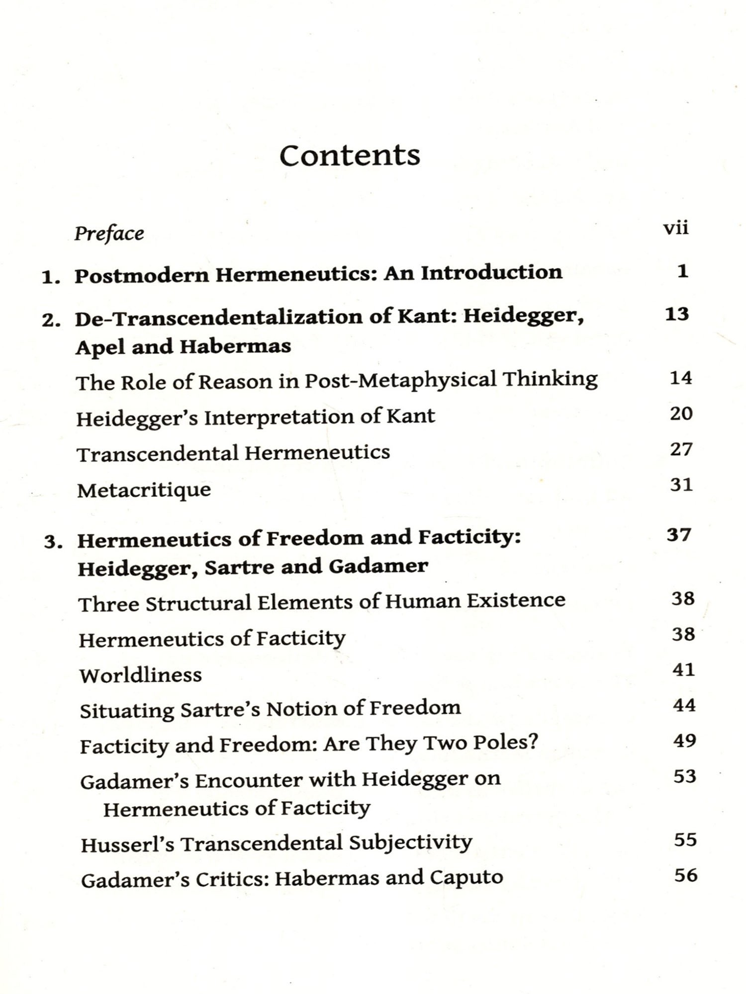 THE BOOK is an attempt to apply postmodern hermeneutics in the study of language, i.e. the theory of meaning and interpretation of the life-world in human knowledge and understanding. Four types of hermeneutics such as, philosophical hermeneutics (Gadamer), radical hermeneutics (Ricoeur), critical hermeneutics (Habermas), and deconstructive hermeneutics (Derrida) are discussed under postmodern hermeneutics. All the above thinkers have been influenced and at the same time critiqued the contributions made by the great phenomenological masters like, Husserl and Heidegger.