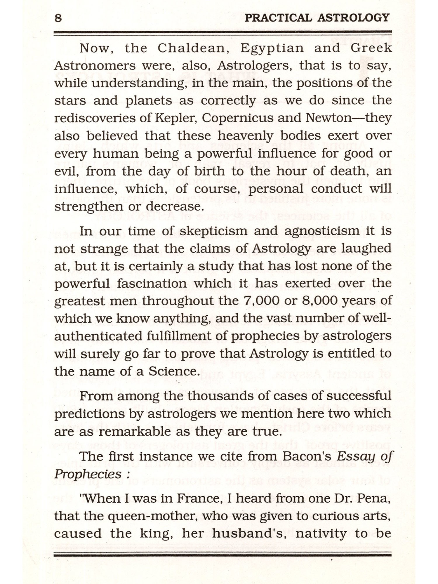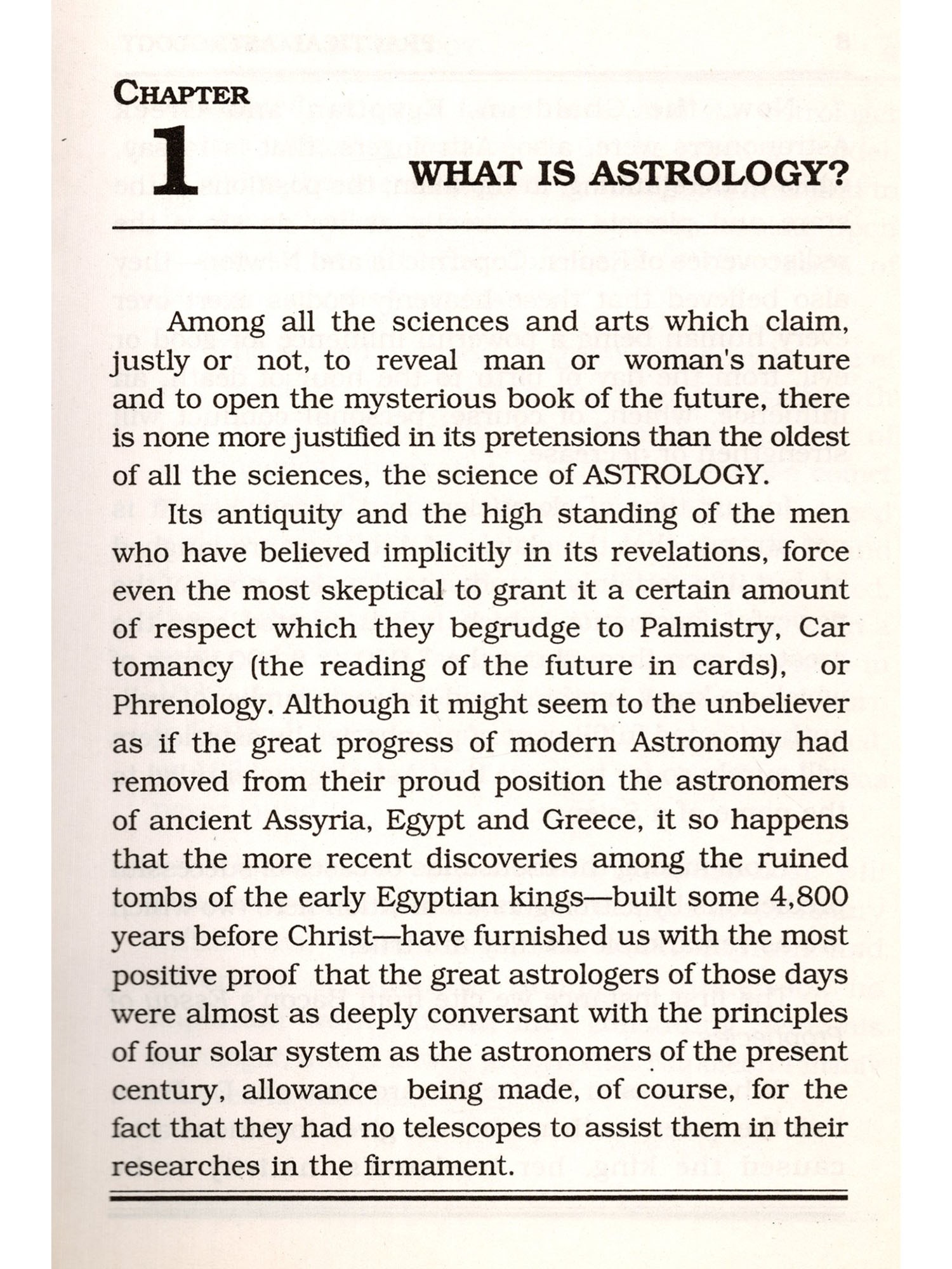 Astrology is the ancient art or science of divining the fate and future of human beings from indications given by the positions of the sun, moon, planets, and the stars. The study of astrology and the belief in it, as part of astronomy, is found in a developed form among the ancient Babylonians. Directly or indirectly. through the Babylonians, it spread to other nations. It came to Greece about the middle of the fourth century B.C., and reached Rome before the opening of the Christian Era. In India and China, astronomy and astrology are largely reflections of Greek theories and speculations. Astrology was actively cultivated in the region of the Nile during the Hellenistic and Roman periods. Astrology was further developed by the Arabs from the seventh to the thirteenth century, and in the Europe of the fourteenth and fifteenth centuries, astrologers were dominating influences at Court. Starting with the indisputable fact that man's life and happiness are largely dependent upon phenomena in the heavens, that the fertility of the soil is dependent upon the sun shining in the heavens as well as upon the rains that come from the heavens and that, on the other hand, the mischief and damage done by storms and inundations are to be traced likewise to the heavens - small wonder is it that a perfect theory has been developed, a theory of a complete accord between phenomena observed in the heavens and occurrences on earth. Such a theory is here developed, and made applicable to the individual. Indeed the latter half of the book is so simply and clearly written that the reader may cast his own horoscope. This book renders a further service by giving the reader a greater knowledge of the twelve types of people, their qualities and their faults. By knowing these characteristics, one can be more tolerant with his fellow-men appreciate their virtues and have patience with their weaknesses. Personally practiced, astrology assists one to reach his goal.