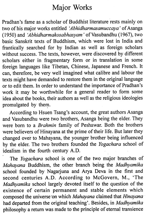 It was also difficult to collect the published works of Professor Pradhan. Fortunately the last copy of the Abhidharmasamuccaya was available at the Research Publication Section of Visva-Bharati to purchase. The Abhidharmakosabhasya and the Sahityayana were available at the Central Library of Visva-Bharati. Some issues of the magazine Caturanga containing Pradhan's articles were also available there. But the second edition of the Kosabhasya was not found either at the Central Library or its sectional libraries. It was, however, available with Professor Suniti Pathak, an eminent scholar of Tibetology, who also apprised me of Pradhan's contribution to Buddhist study. The introduction to this second edition by Dr. (Mrs.) Aruna Haldar was very useful to me.