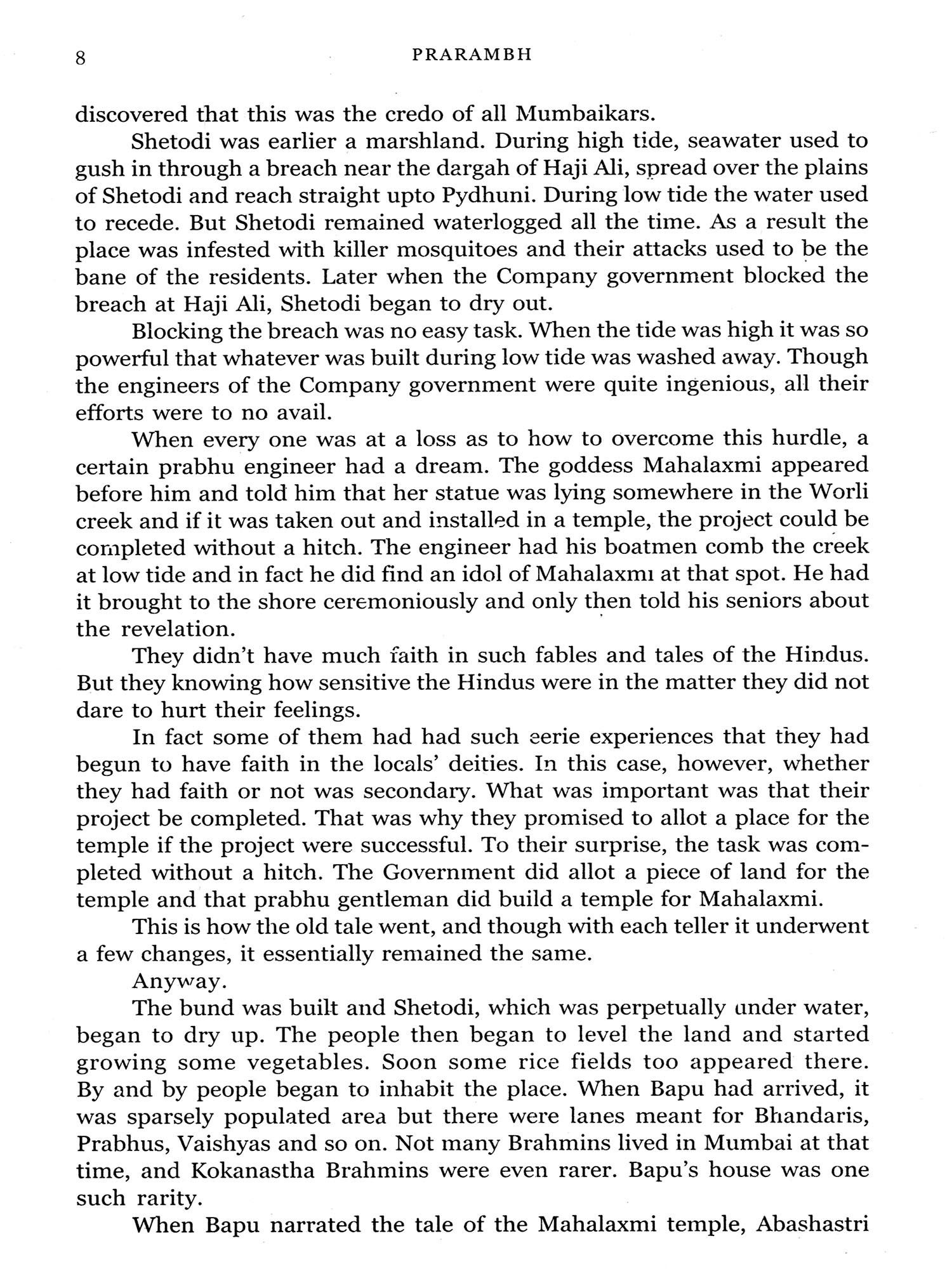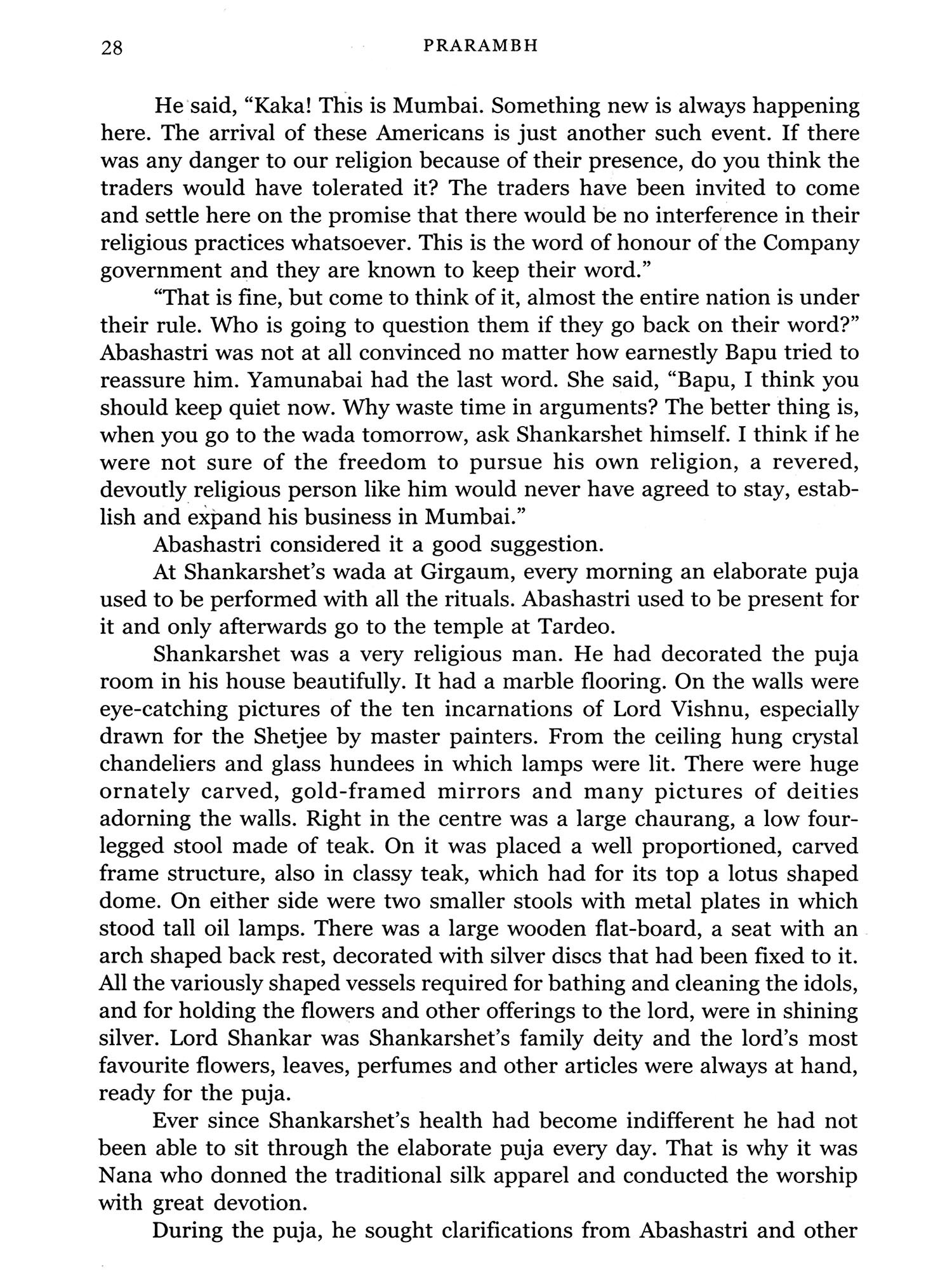 The present novel Prarambh seems to be Gadgil's conscious reply to his carping critics. This biographical novel, although it deeply deals with one of the architects, indeed the chief architect of modern Mumbai, Jagannath Shankarshet, popularly known as Nana Shankarshet, is in my opinion, essentially a biography of Mumbai itself. The twe are closely interwoven. For, even if Gadgil set out initially to write a novelized version of Jagannath Shankarshet's life, considering the wide backdrop of the newly emerging cosmopolitan centre of commercial and educational activity, it has turned out to be the biography of Mumbai itself. And this time Gadgil appears to be on a firmer ground. Born and brought up in Mumbai, and having now lived in Mumbai for almost eight decades, Gadgil has been a witness to the growth of Mumbai into a megapolis. Ile loves the city and has written extensively on various aspects of the history of Mumbai, its institutions and the builders of those institutions. Being a trained economist, he always found the success of Mumbai as a commercial capital of India, a fascinating subject. Proud Mumbaikar that he is, Gadgil has studied well the lives and works of those who have made Mumbai, the most advanced and progressive cosmopolitan city in the country a true urbs prima in Indes as it was called in the British Raj. The British always dreamt of making Mumbai the London of the East.