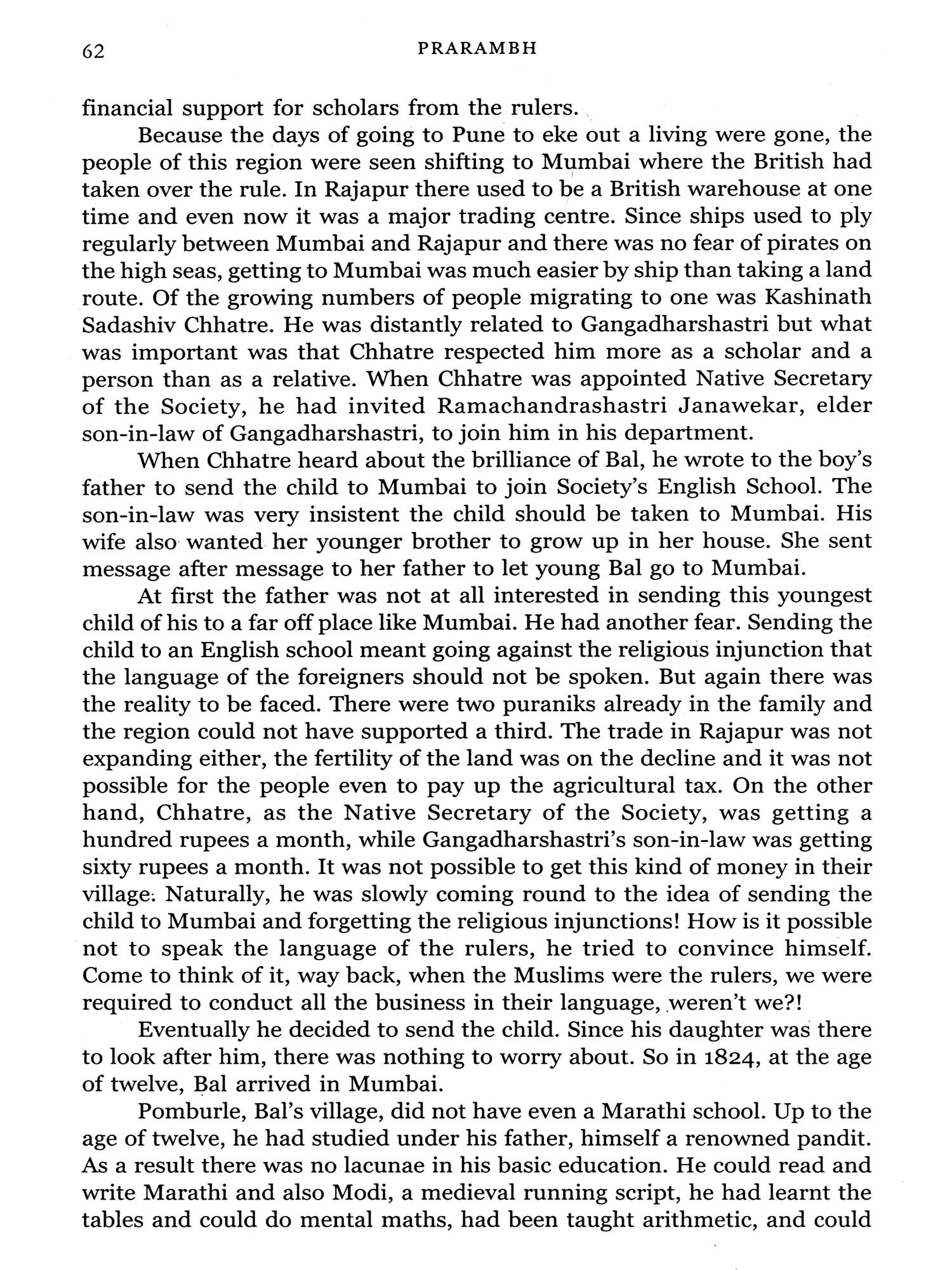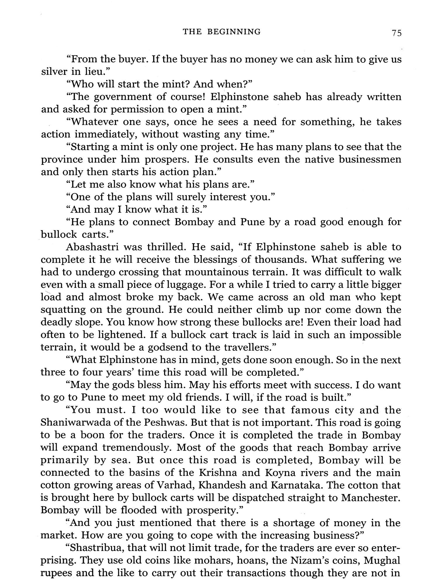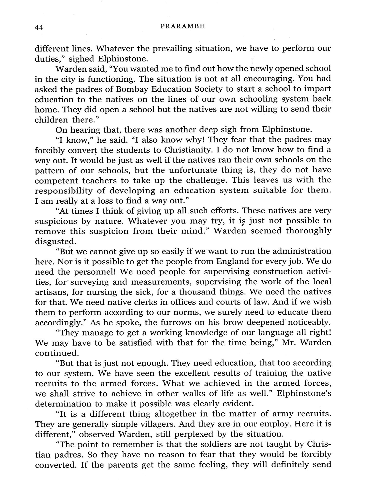 Mumbai was singularly fortunate in having Mountstuart Elphinstone, a visionary, as the first governor (1819-1827) of the newly created Bombay Presidency. He heralded a new age in Mumbai and dreamt of a better land and educated, civilized society. Taking cue from him, those who followed him continued his liberal policy and soon Mumbai started attracting people not only from the hinterland of the Deccan, but also from other parts of the country. A society that was reduced to dust due to internecine wars and infighting was rising anew in Mumbai and under enlightened administration was making progress in all walks of life. The shortcomings in local religions and traditions did not matter much in the beginning. The demoralized society was learning new lessons in corporate living. That was surely the beginning of a new era, which gave Gadgil the title of his ambitious novel Prarambh, which means 'the beginning'.