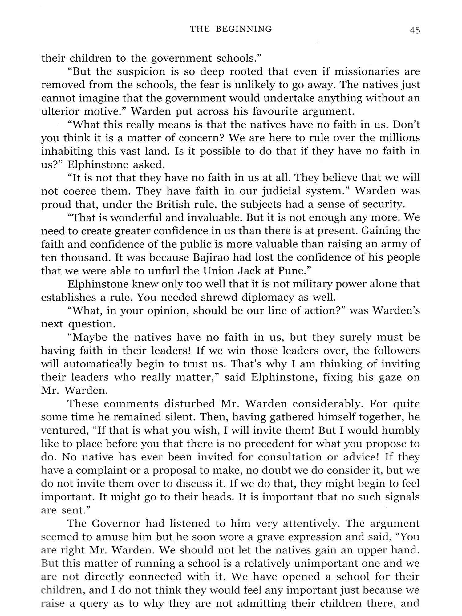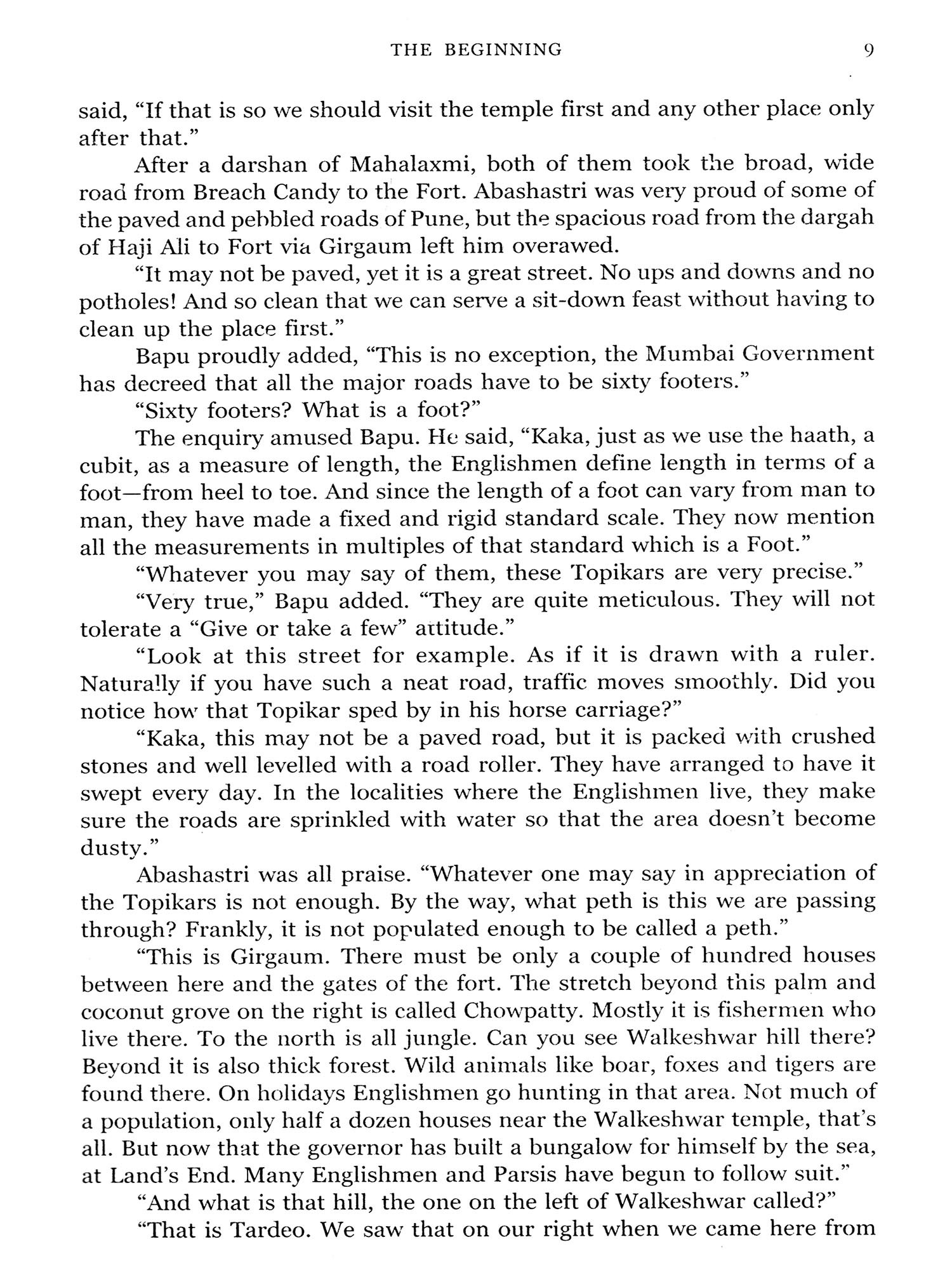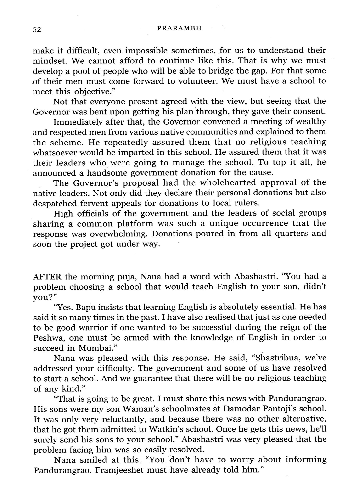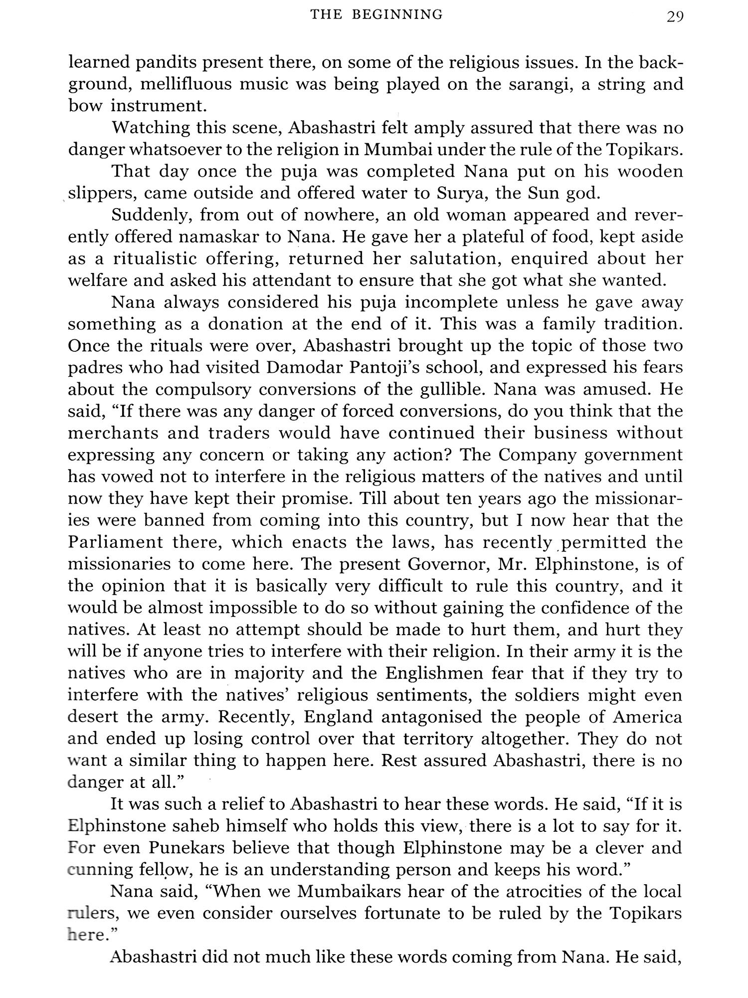 Mumbai was singularly fortunate in having Mountstuart Elphinstone, a visionary, as the first governor (1819-1827) of the newly created Bombay Presidency. He heralded a new age in Mumbai and dreamt of a better land and educated, civilized society. Taking cue from him, those who followed him continued his liberal policy and soon Mumbai started attracting people not only from the hinterland of the Deccan, but also from other parts of the country. A society that was reduced to dust due to internecine wars and infighting was rising anew in Mumbai and under enlightened administration was making progress in all walks of life. The shortcomings in local religions and traditions did not matter much in the beginning. The demoralized society was learning new lessons in corporate living. That was surely the beginning of a new era, which gave Gadgil the title of his ambitious novel Prarambh, which means 'the beginning'.