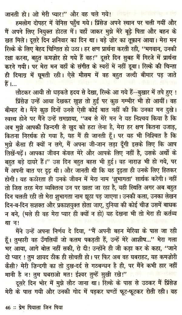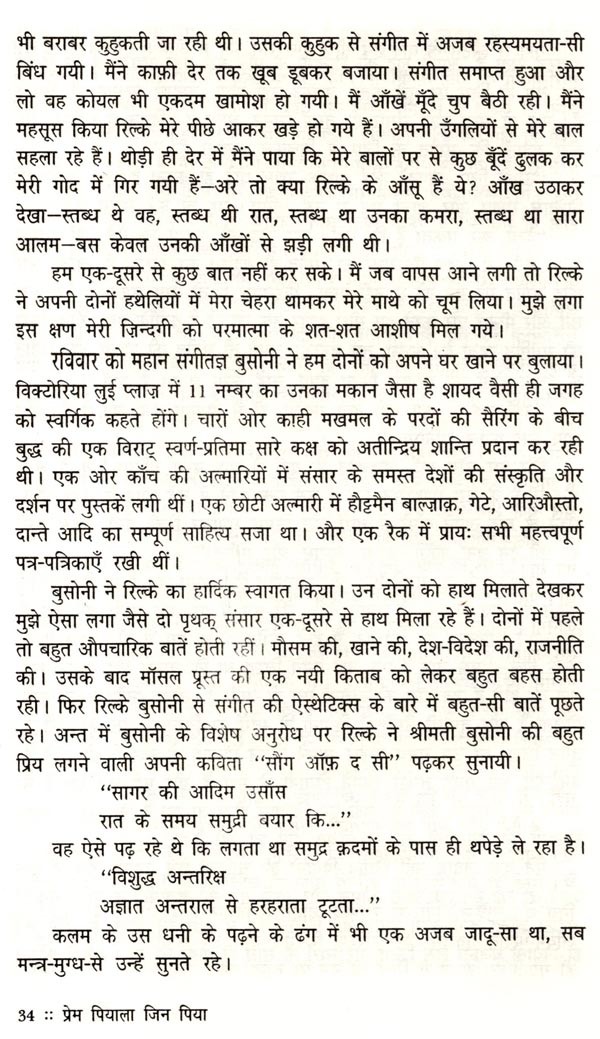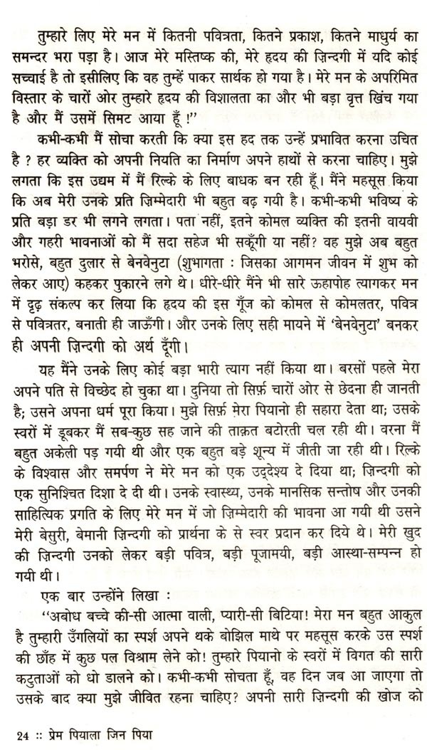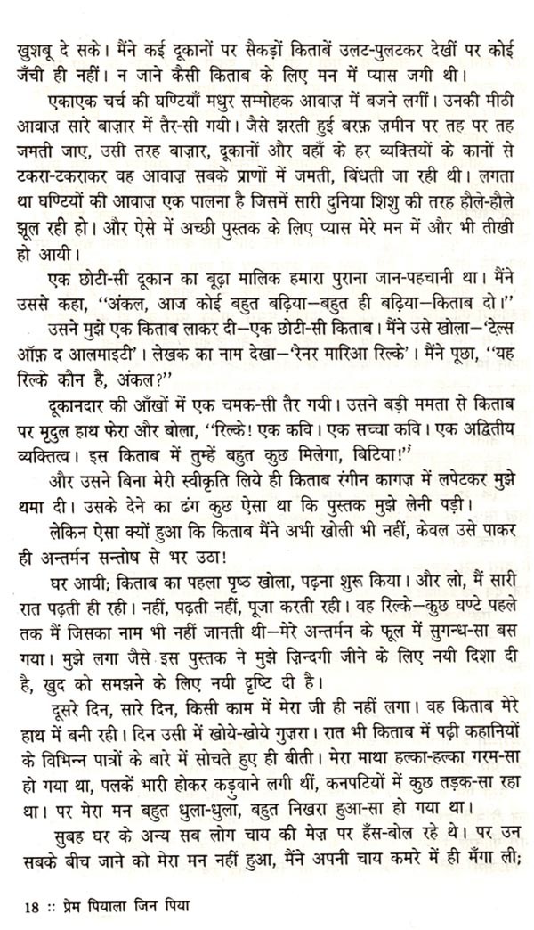 प्रेम पियाला जिन पिवा चेखव की मर्मभेदी कहानियाँ, डिकेन्स के मानवतावादी उपन्यास, वेल्स की रोमांचक वैज्ञानिक कथाएँ और रिल्के की अद्भुत कविताएँ - विश्व-साहित्य के इन अमर हस्ताक्षरों की प्रेरणा का उद्गम कहाँ है? इनके कृतित्व के पीछे, निजी जीवन की कौन सी पीड़ाएँ थीं, कौन से गोपन प्रणय या उजागर अनुराग बन्धन थे? यह सब आप बहुत ही रोचक और कलात्मक रूप में जानेंगे प्रेम पियाला जिन पिया में। प्रामाणिक तथ्यों और अन्तरंग आत्मीय विश्लेषणों के कारण पुष्पा भारती के ये कथा-निबन्ध ऐसे बन पड़े हैं जिन्हें एक बार पढ़कर आप कभी भूल नहीं पायेंगे और फिर-फिर पढ़ना चाहेंगे, जीवन की अनेक उद्वेलित, प्रगाढ़, तन्मय और उदासीन मनःस्थितियों में। इन कथा-निबन्धों को पढ़कर बच्चन ने लिखा था कि 'भावभीनी, चित्रात्मक, साथ ही परिनिष्ठित शैली में गद्य लिखने की पुष्पा भारती की क्षमता अद्वितीय है।' शिवमंगल सिंह 'सुमन' का कहना था-'मैं मन्त्रमुग्ध-सा पुष्पा भारती की लेखनी