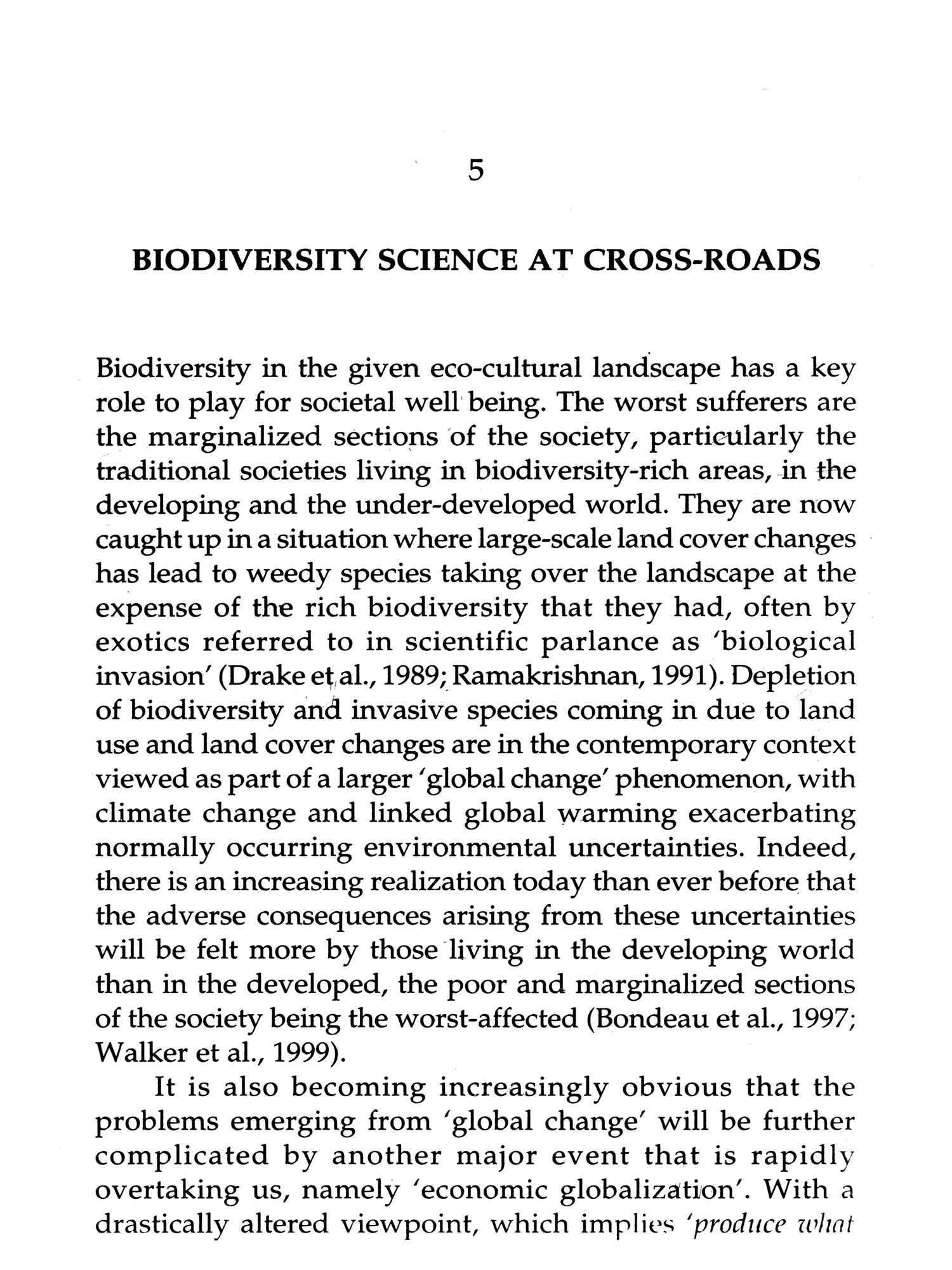 For the highly marginalized sections of the societies those living biodiversity-rich situation, and therefore closely connected with 'Nature' and natural resources around (henceforth referred to as 'traditional societies'), who constitute about 20 per cent of the Indian population. The basic livelihood needs have come under threat because of biodiversity depletion, a resource which is the driving force for sustaining their traditional agricultural systems; the key drivers for this depletion of biodiversity and linked-land degradation being external forces such as market pressures and policy formulation, both national and international (Ramakrishnan, 1992a; Indian National Science Academy et al., 2001).