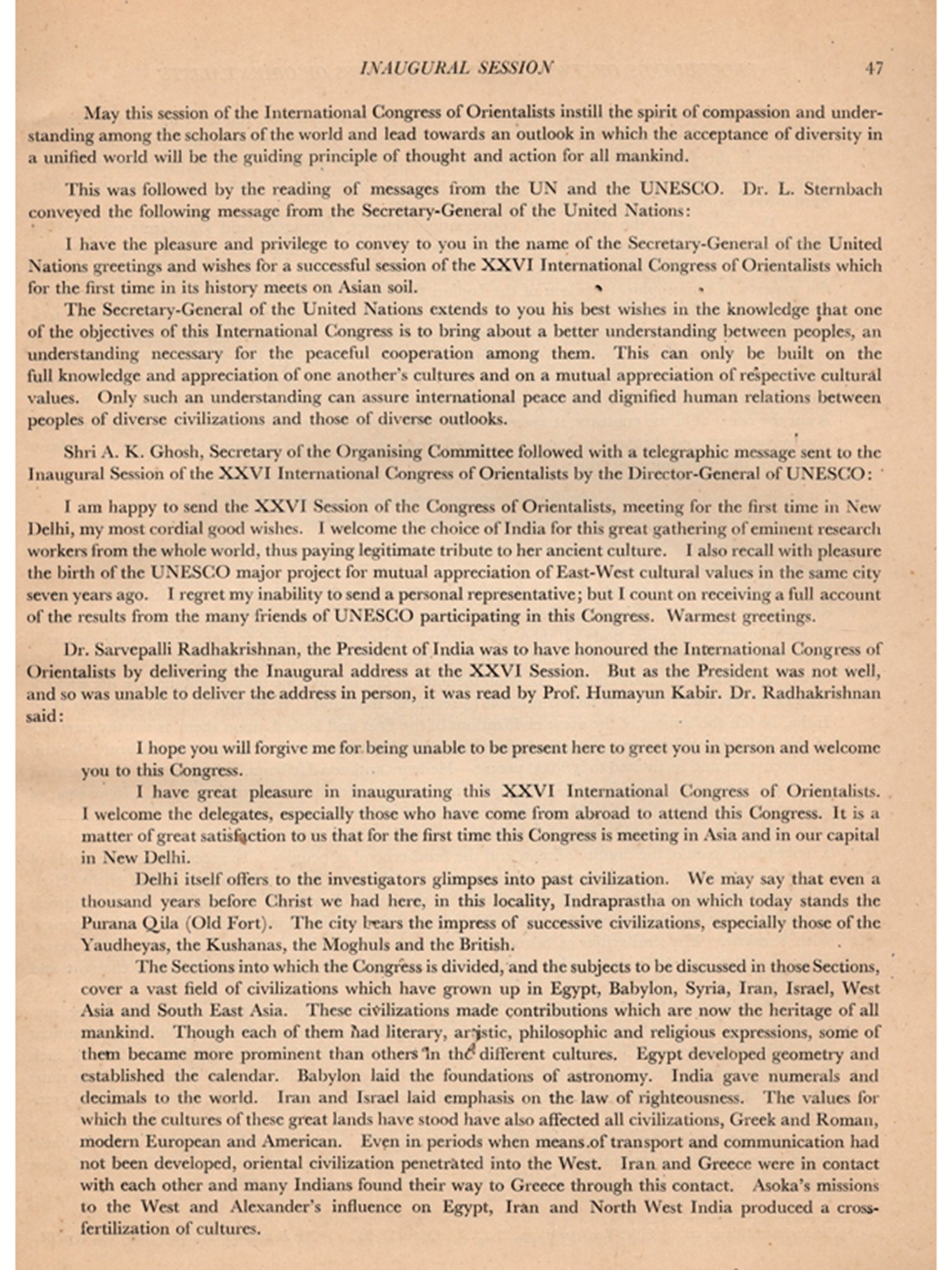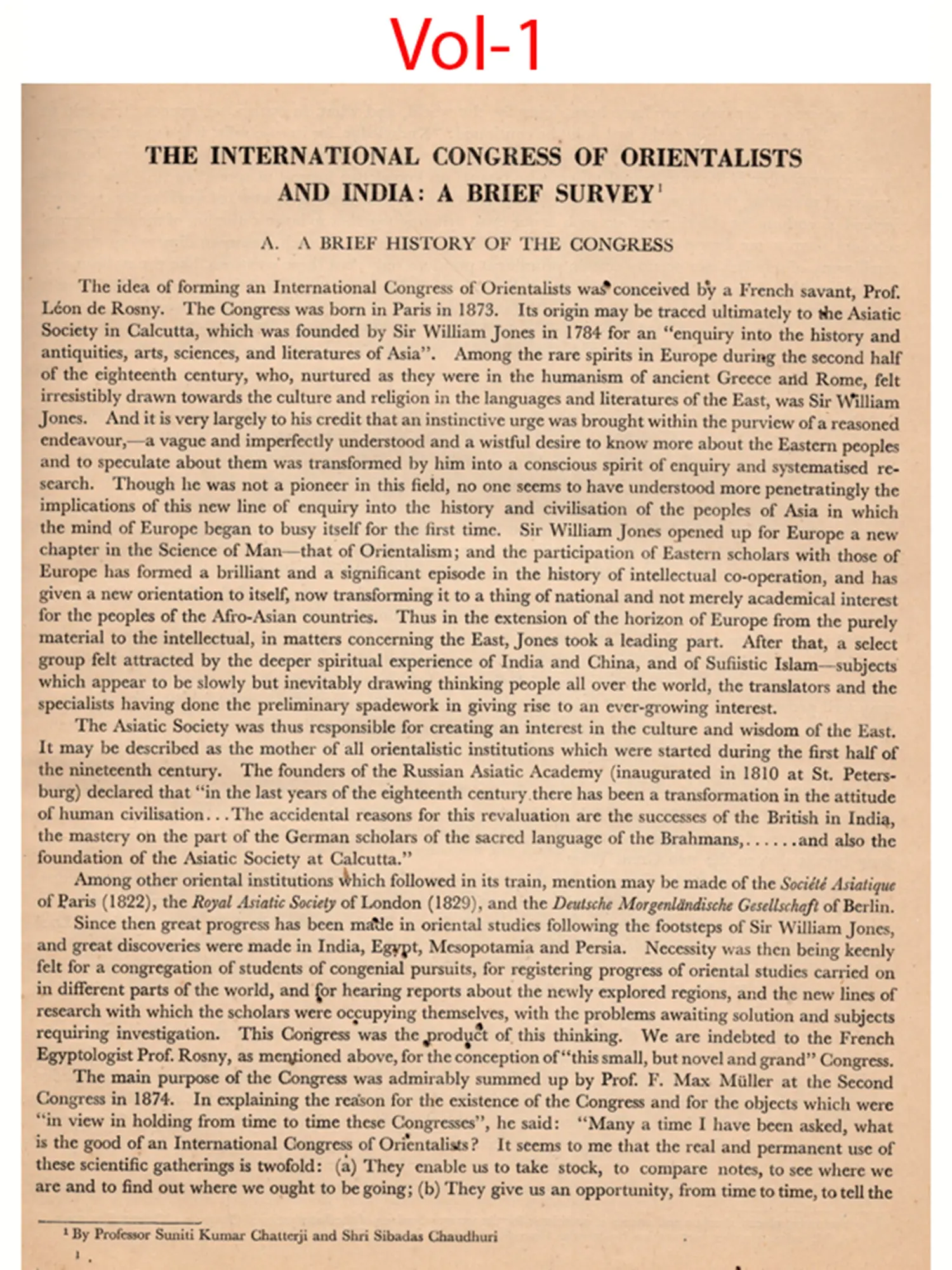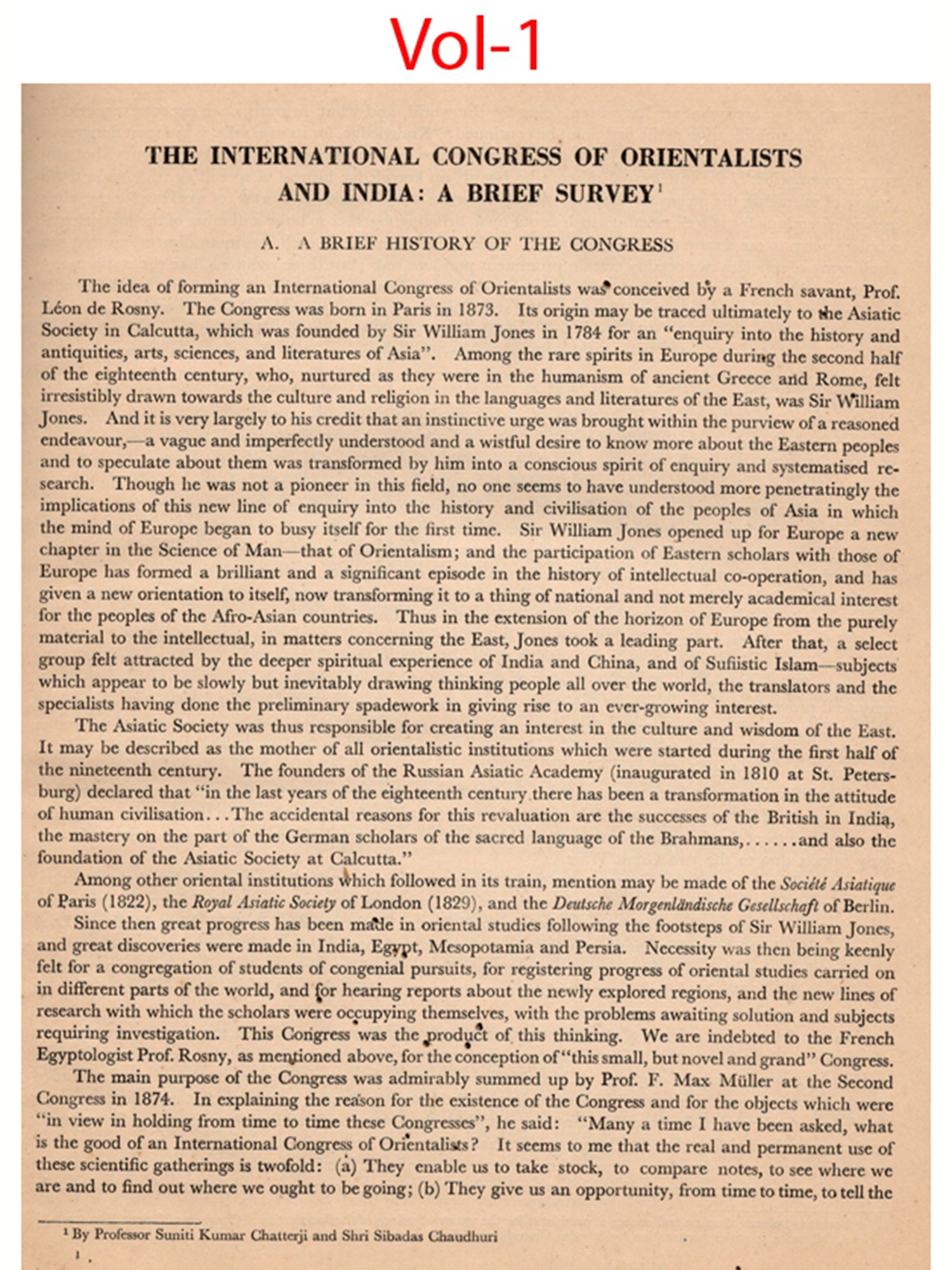 The XXVI session of the Congress had certain features which distinguish it from earlier sessions. It was mainly the initiative of Sir William Jones and the then Royal Asiatic Society of Bengal which started a sustained and scientific interest in Oriental lore. Indology was perhaps the core of these studies in their initial stages and as such the session of the congress in India was like a long awaited homecoming Another.