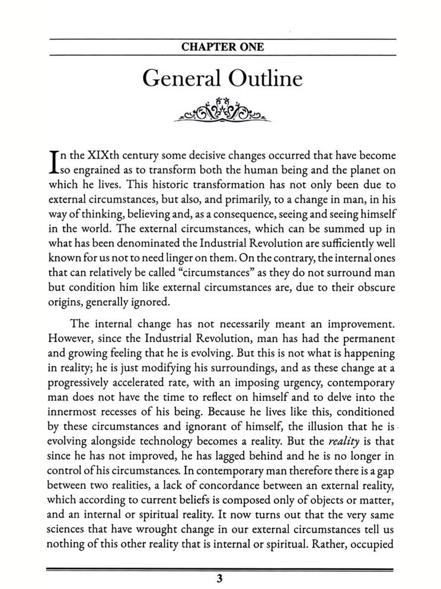 Although it does not appeal only to reason, this book inclines, like all philosophical essays, towards clarity. This means that it avoids all obscurantism or "esotericism". If the reader is searching for immediate or "magical", solutions he need not take the trouble to read these pages.