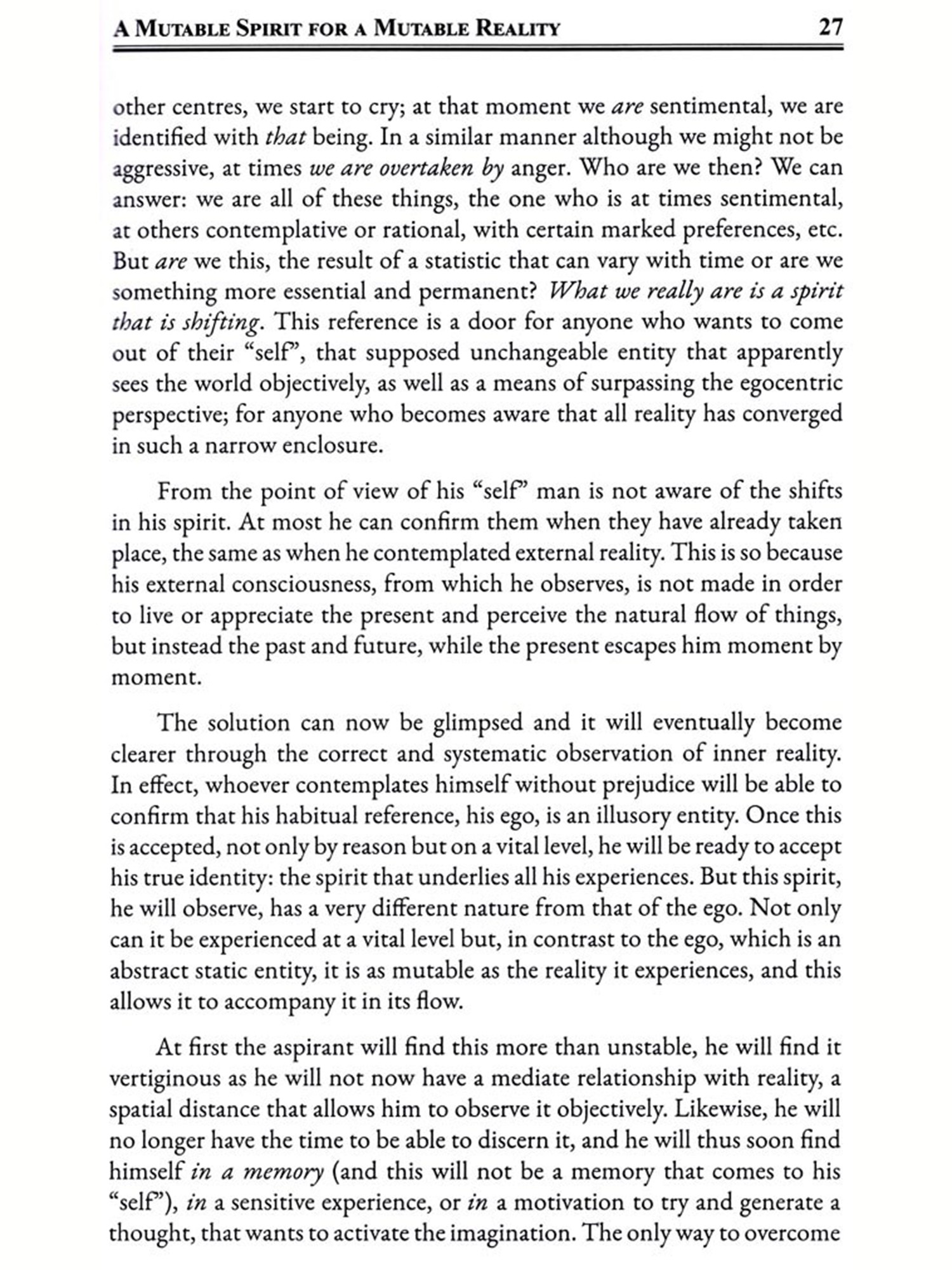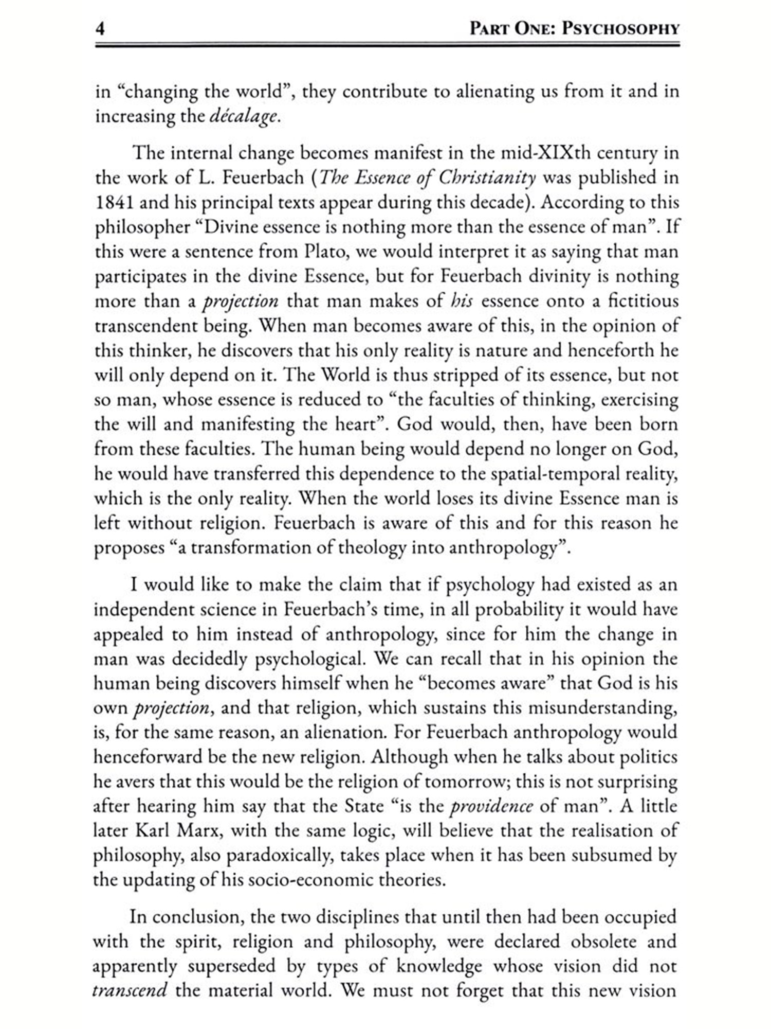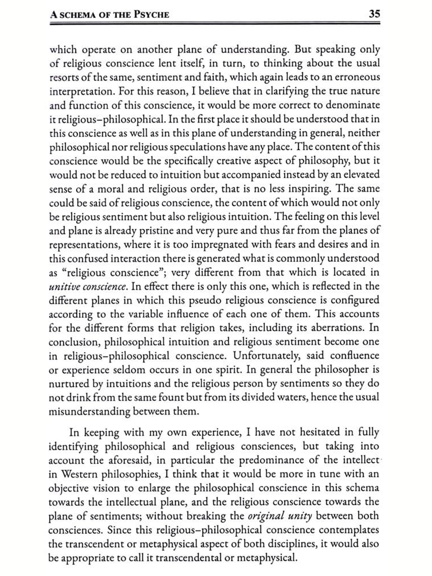 Besides this, the work has all the elements that constitute a true philosophy. The spiritual experience laid out in the First Part allows for a critique that, to my knowledge, has no precedents. The Second Part marks a milestone in the critical history of psychoanalysis, and for this reason will surely become a classic text, not in the sense of a scholarly text, but in that of a masterpiece."