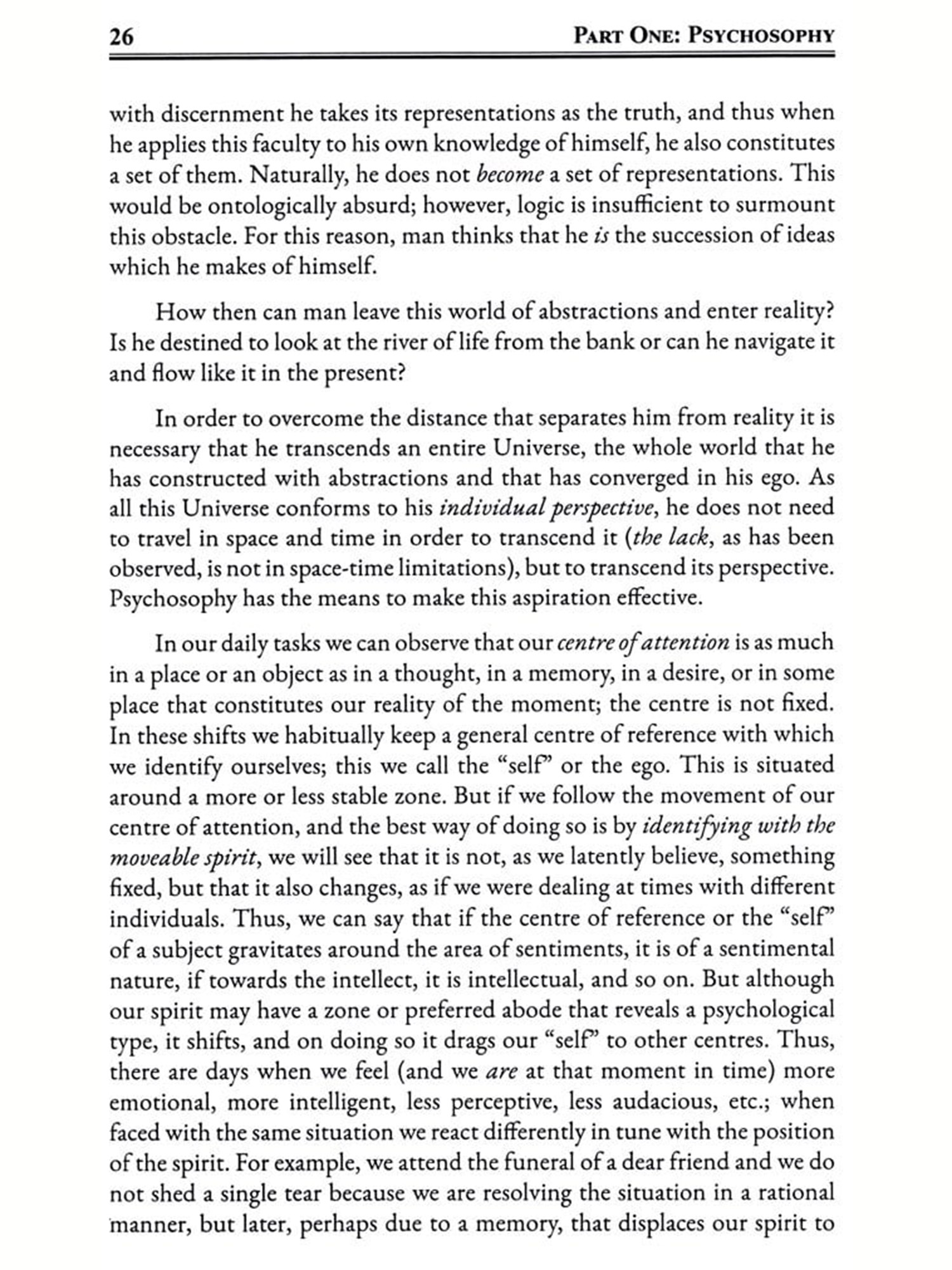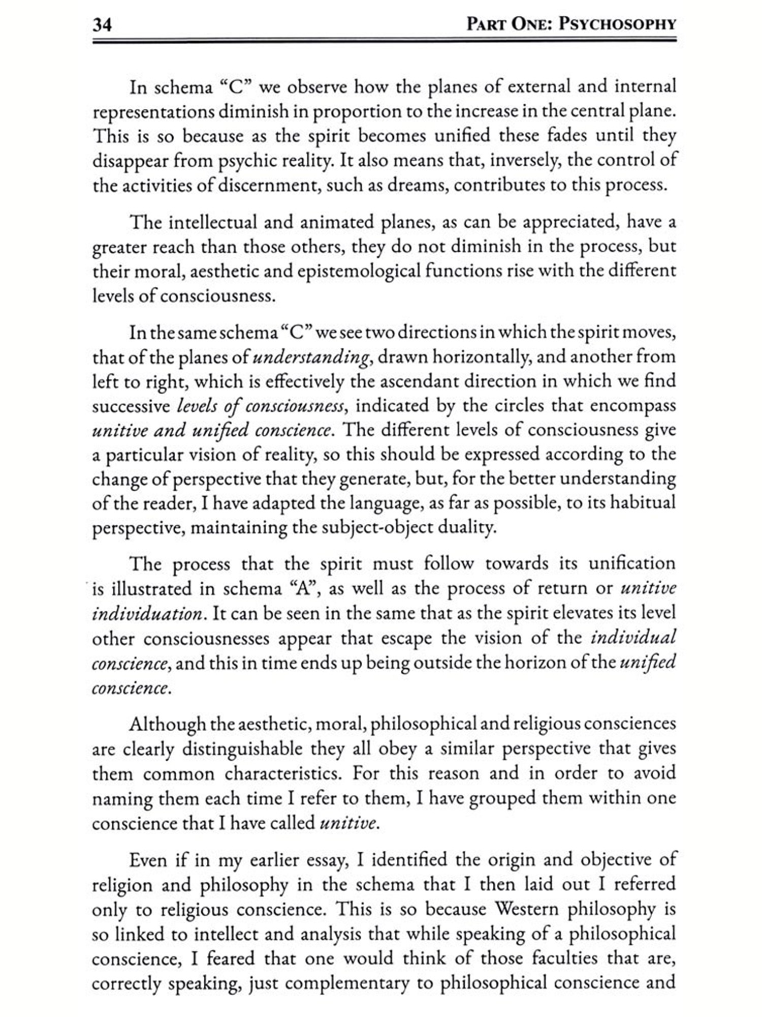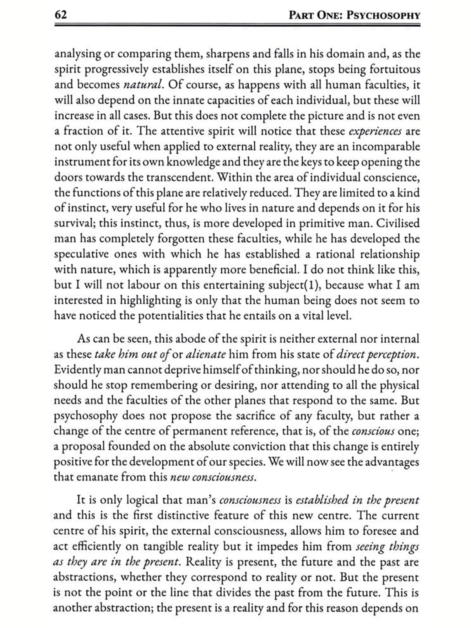 This work is one more call to spiritual life. By this I understand an artistic, ethical, contemplative, creative and harmonious life. In order to understand psychosophy it is indispensable to have an open and receptive spirit that is open to appreciating nuances. All fundamentalisms, religious and irreligious, including every fixed creed, will constitute an impediment to its understanding. This discipline is part of the direct knowledge of the essence of particular religions, and it maintains that the misuse and errors of the latter are a consequence of the lack of this knowledge. It is to avoid the deviations to which ignorance of this essence has led, that psychosophy induces wisdom.