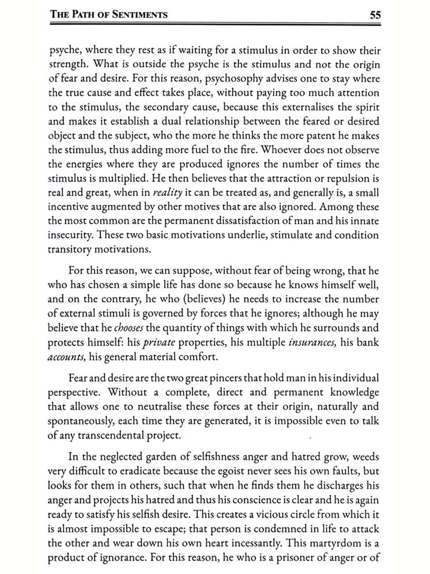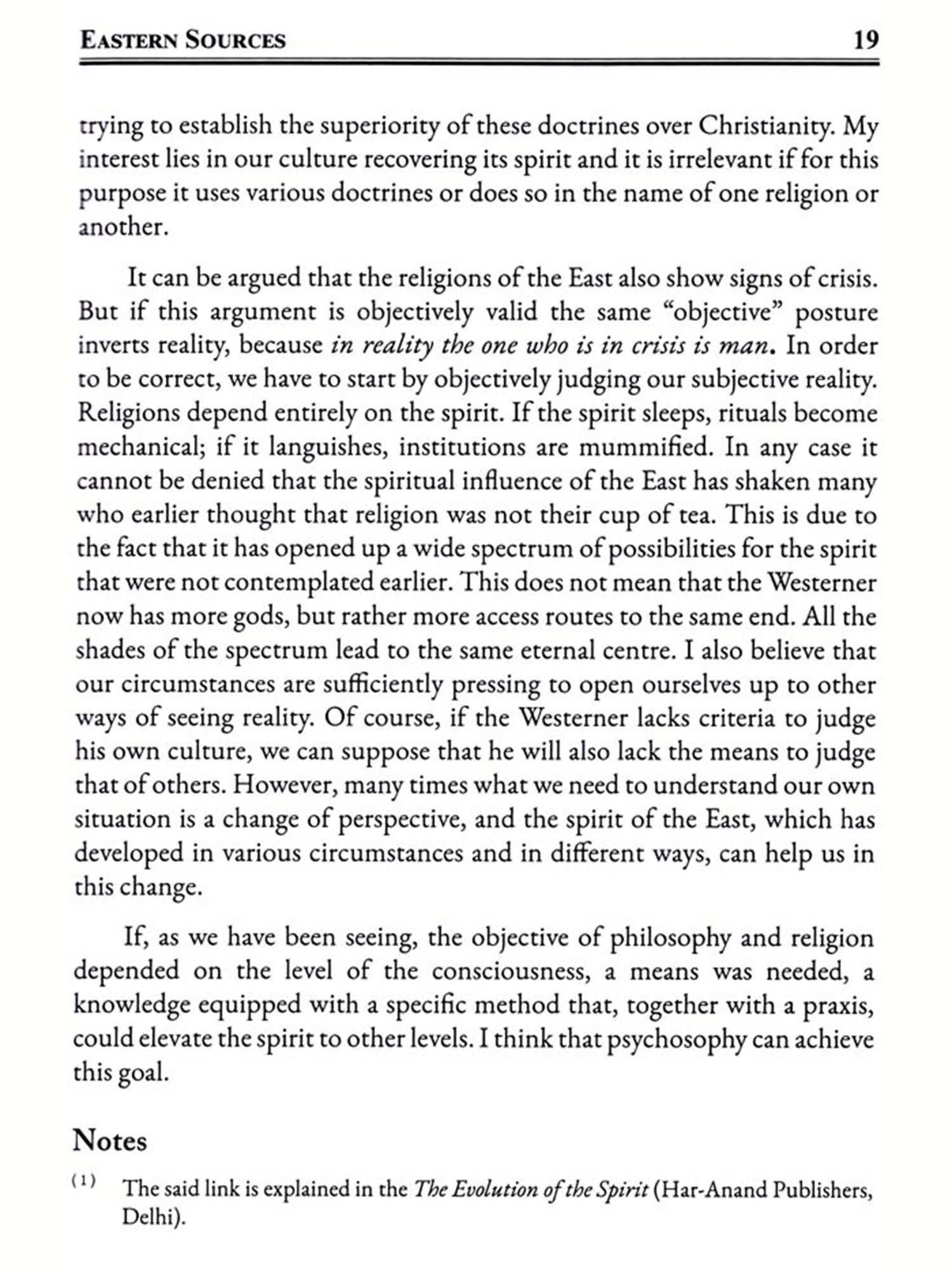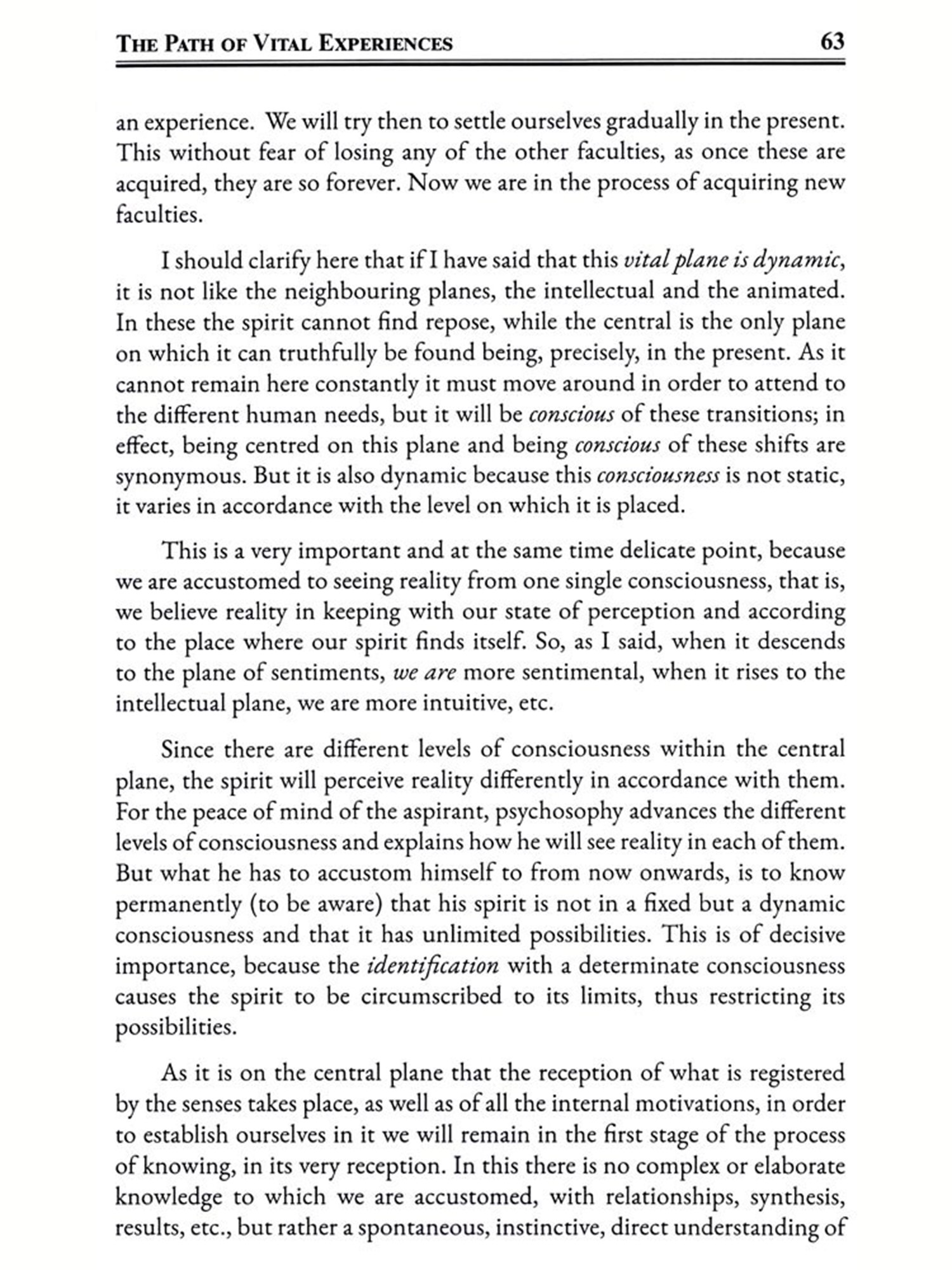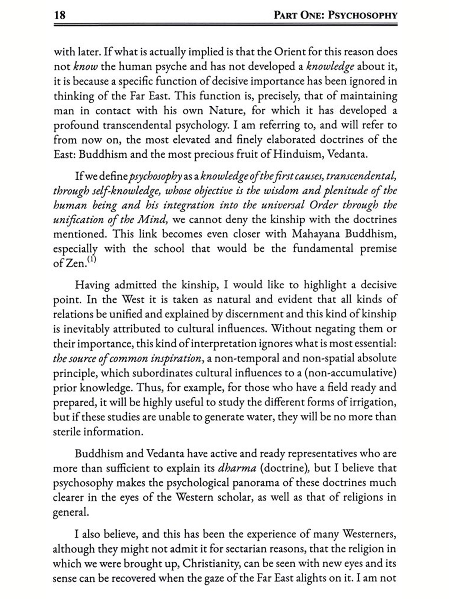 This work is one more call to spiritual life. By this I understand an artistic, ethical, contemplative, creative and harmonious life. In order to understand psychosophy it is indispensable to have an open and receptive spirit that is open to appreciating nuances. All fundamentalisms, religious and irreligious, including every fixed creed, will constitute an impediment to its understanding. This discipline is part of the direct knowledge of the essence of particular religions, and it maintains that the misuse and errors of the latter are a consequence of the lack of this knowledge. It is to avoid the deviations to which ignorance of this essence has led, that psychosophy induces wisdom.