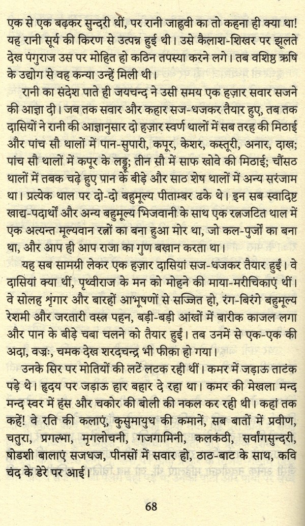 वीर क्षत्राणी संयोगिता, कन्नौज के राजा जयचंद की बेटी थीं। संयोगिता जब यौवन को प्राप्त हुई, उस समय सम्पूर्ण भारत में पृथ्वीराज की वीरता की चर्चाएँ हो रही थी। संयोगिता ने जब पृथ्वीराज की वीरता की कथा सुनी, तब वह पृथ्वीराज के प्रेम पाश में बंध गई। प्रेमशास्त्र में ऐसी कन्याओं को मुग्धा कहा गया है।