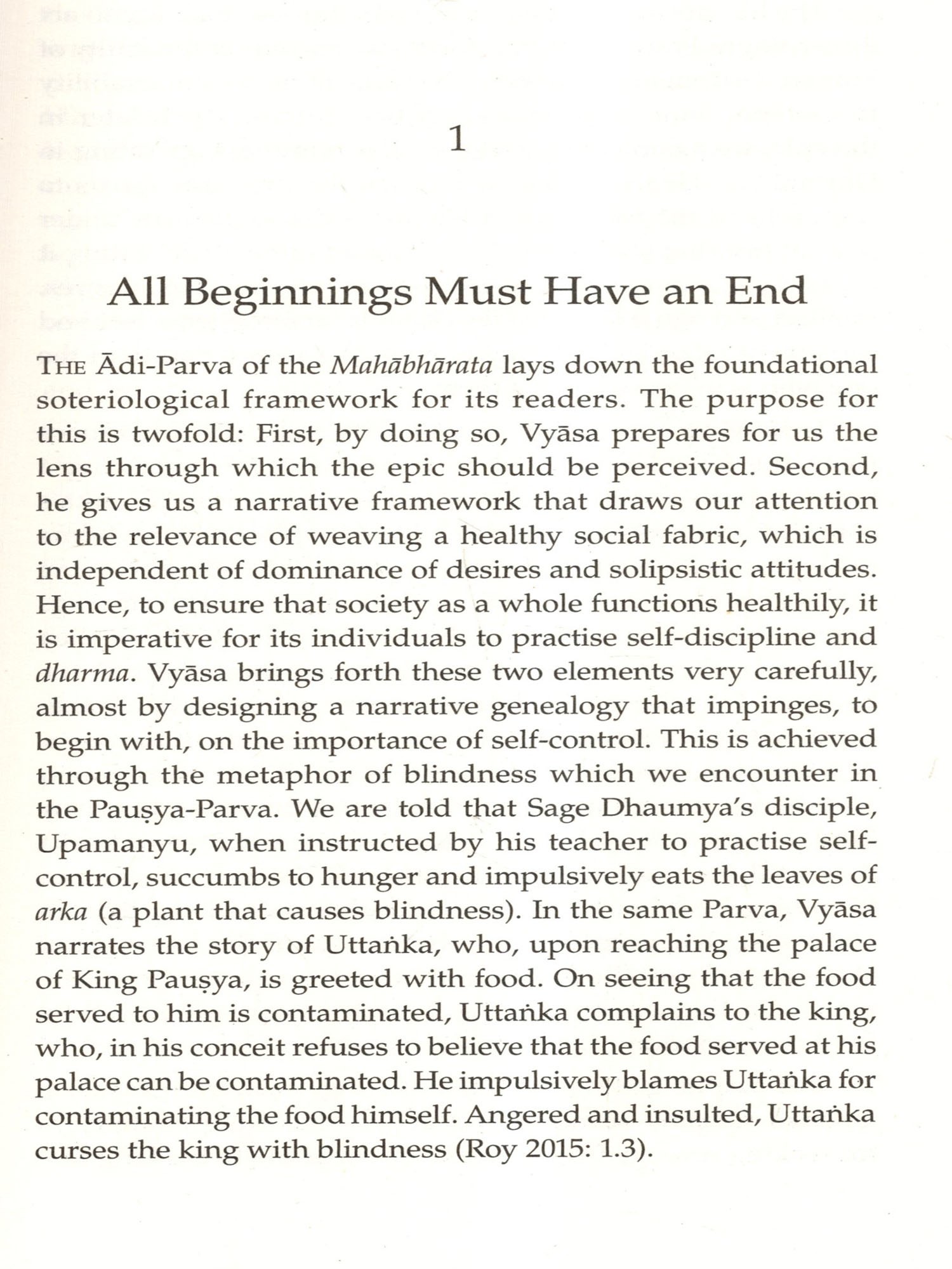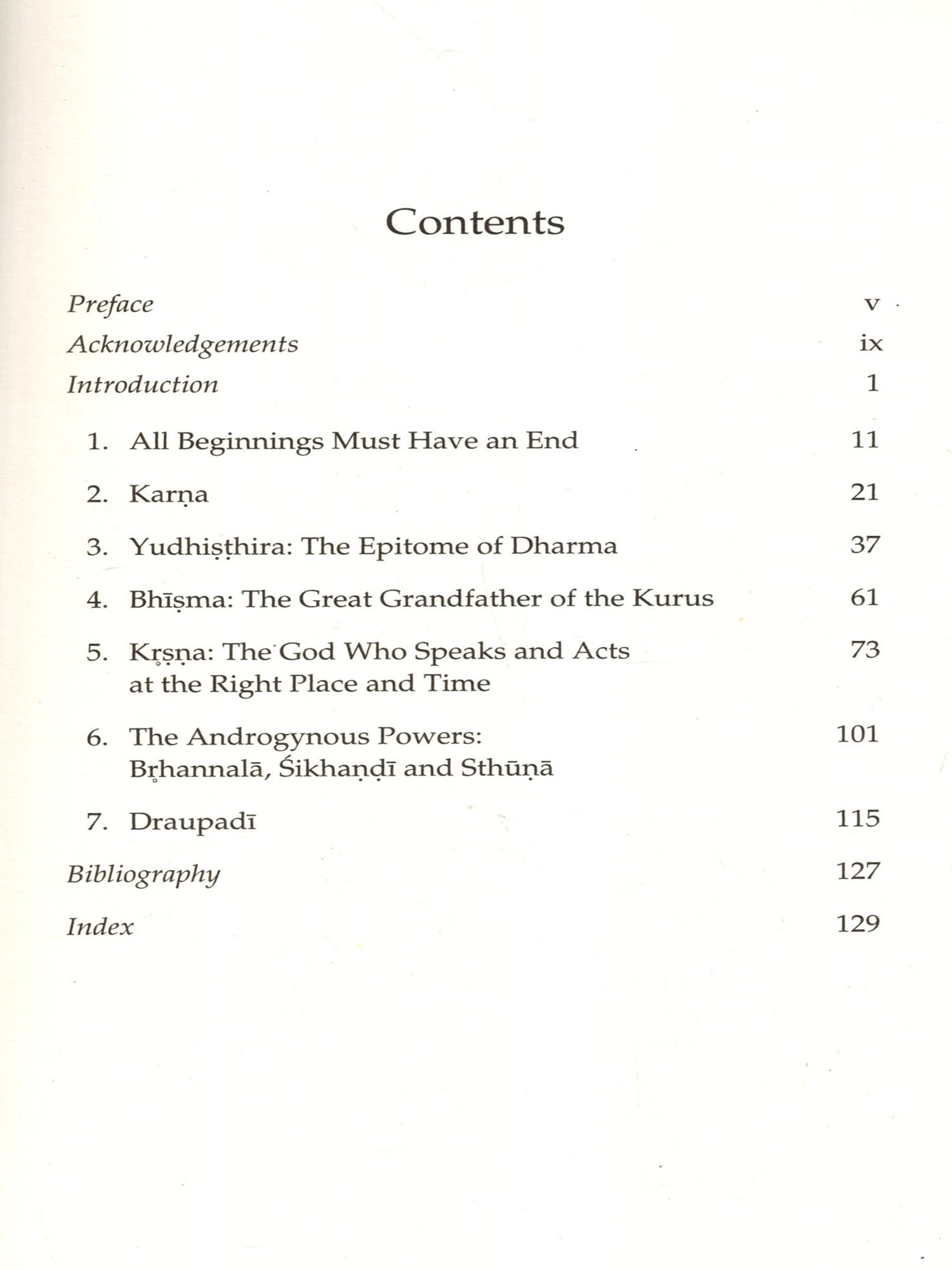 Four years ago, when I began my journey of writing on one of the greatest Indian epics, the Mahabharata, I had little idea on the theme or subject I would choose for my writings. The works of Chitra Banerjee Divakaruni's The Palace of Illusion, (2008) and Irawati Karve's Yuganta (2007) unfolded before me the sensitive and emotional face of the characters and their struggles. This inspired me to further explore and understand the characters and come closer to the truths of their conducts and situations. While I was still in the process of reading the Mahabharata, I was recommended Ramdhari Singh Dinkar's poetic composition, Rashmirathi (1952). Dinkar's masterpiece greatly moved me and I commenced my journey as a writer by seeking reasons and answers for Karņa's tragic projection in the epic. I observed that despite a plethora of essays written on him, there were still lacunae which needed representation and voice. In the process, I was acquainted with scholarship that helped me in developing more ideas and drawing connections with the Mahabharata. Michael Sandel's Justice: What's the Right Thing to Do?' (2009) paved way for the second chapter on Yudhisthira. The proceeding chapters were an effort of my four years of reading and re-reading of the epic and reflecting on the why and how of circuitous stories, situations and actions. The final addition to the book was the chapter, "All Beginning Must Come to an End". While I wrote this chapter at the end, I gauged it best to place it in the book's beginning as it lays important foundation for understanding the epic and the manner in which I have perceived the characters.