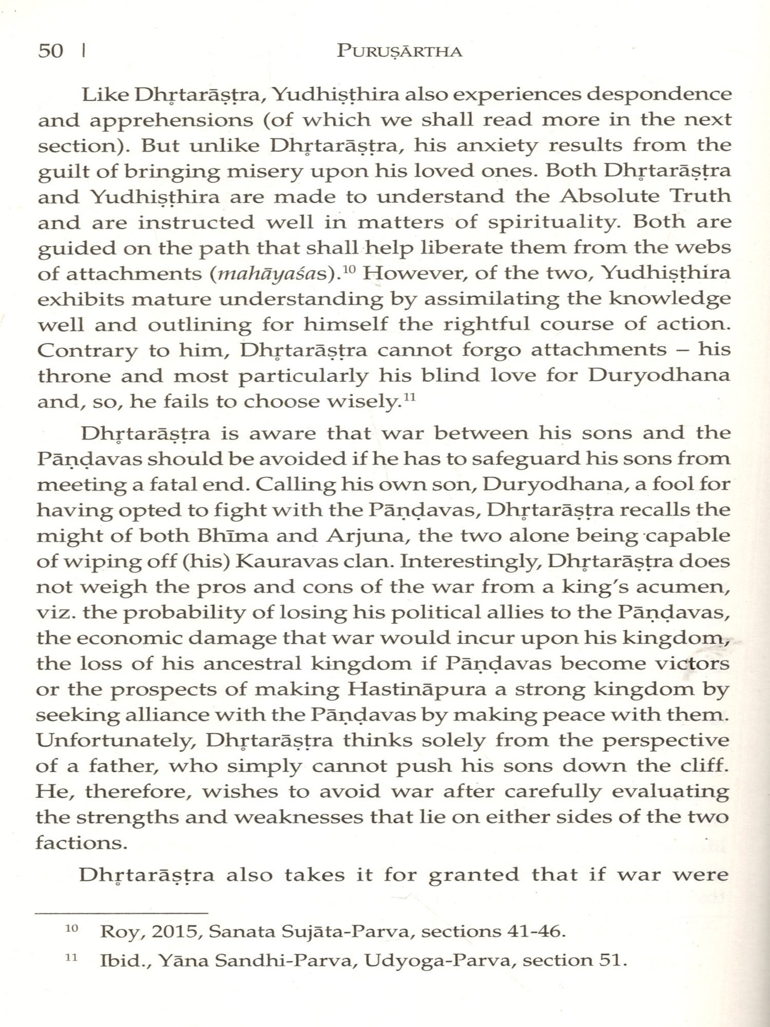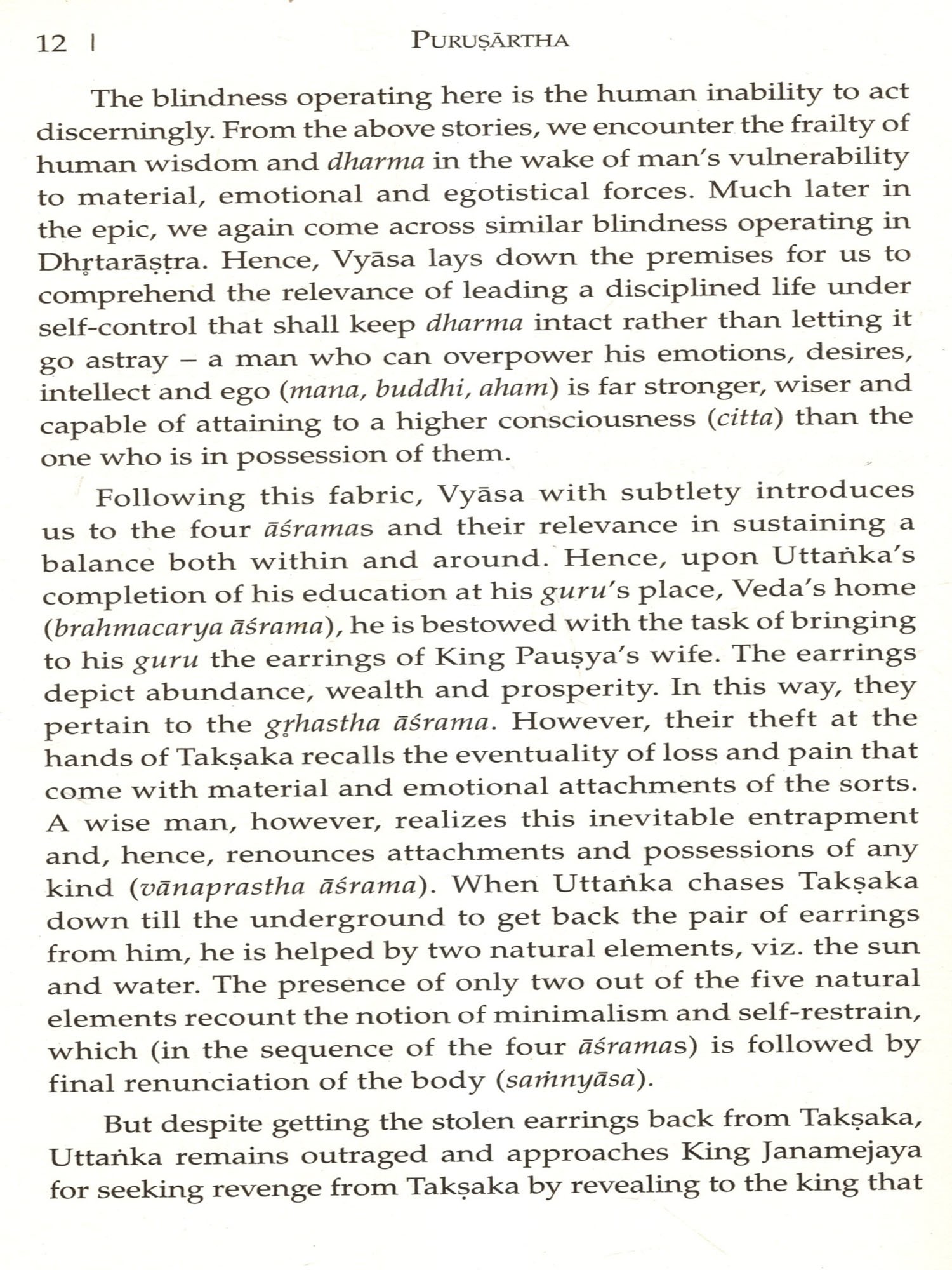 The purpose of writing the book Purusartha is to carefully study characters from the epic and through them redefine the concept of dharma, polity, heroism, androgyny and liberation The book directly connects the readers and their social settings to these concepts, offering unique perspectives through which they can reflect upon their lives and acquire clearer, more prudent insights into their individual and socio-political attitudes and conduct. In the process, many stereotypical beliefs concerning these characters have been demythified and controversial yet pertinent questions that have centred around them, their actions and decisions have been answered. Unlike previous scholarships that have stressed on the susceptibility of characters (in the epic) towards committing humanly mistakes and erroneous judgements, puruşārtha argues that despite their human-like fallacies, these characters delineate brilliance and extraordinariness in dealing with challenges and struggles that come their way. Their struggles are commonplace but the choices made and actions taken to deal with them offer significant and universal life lessons.