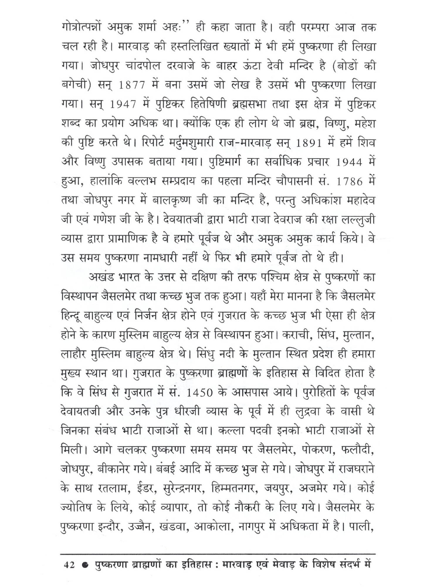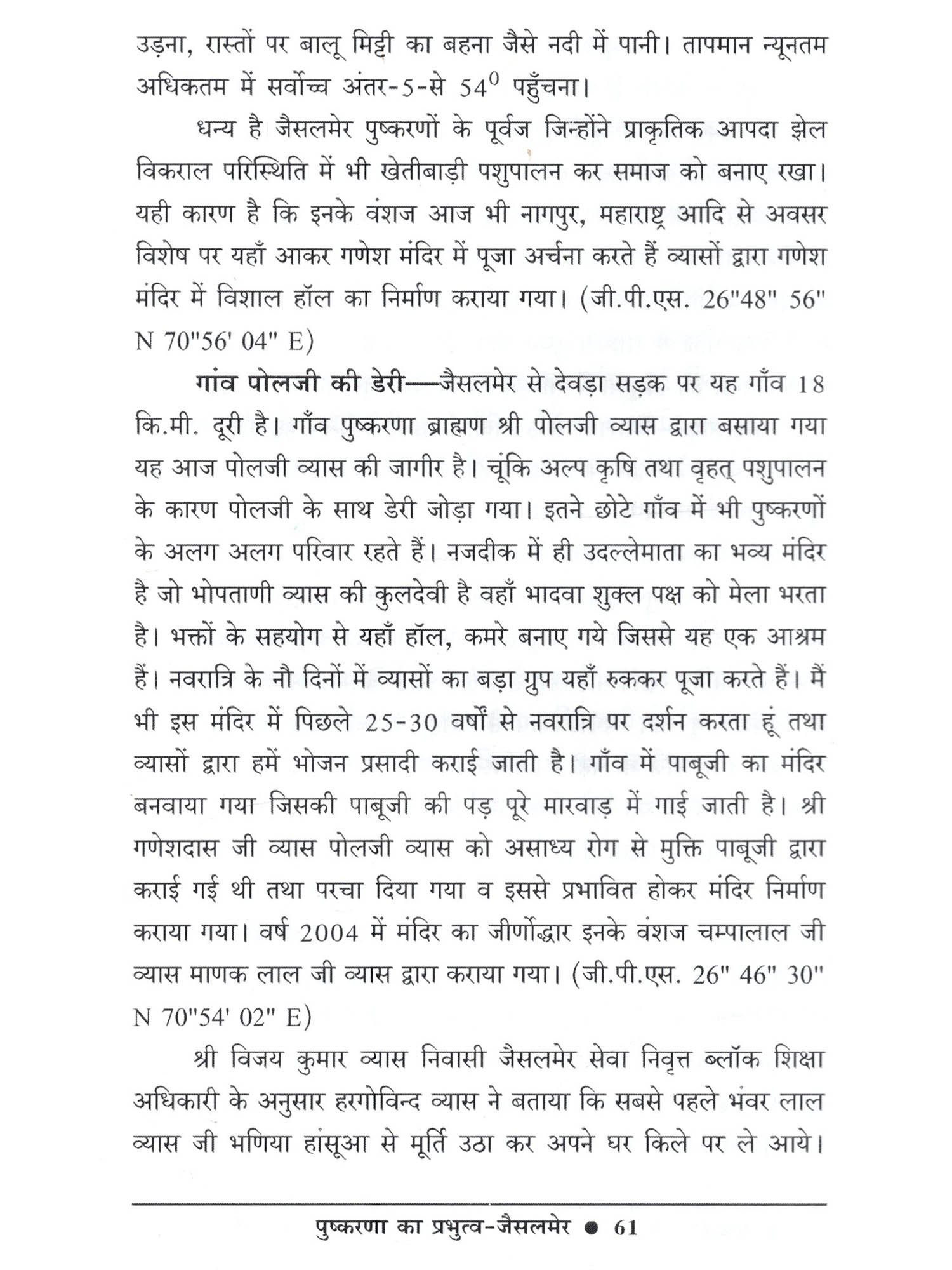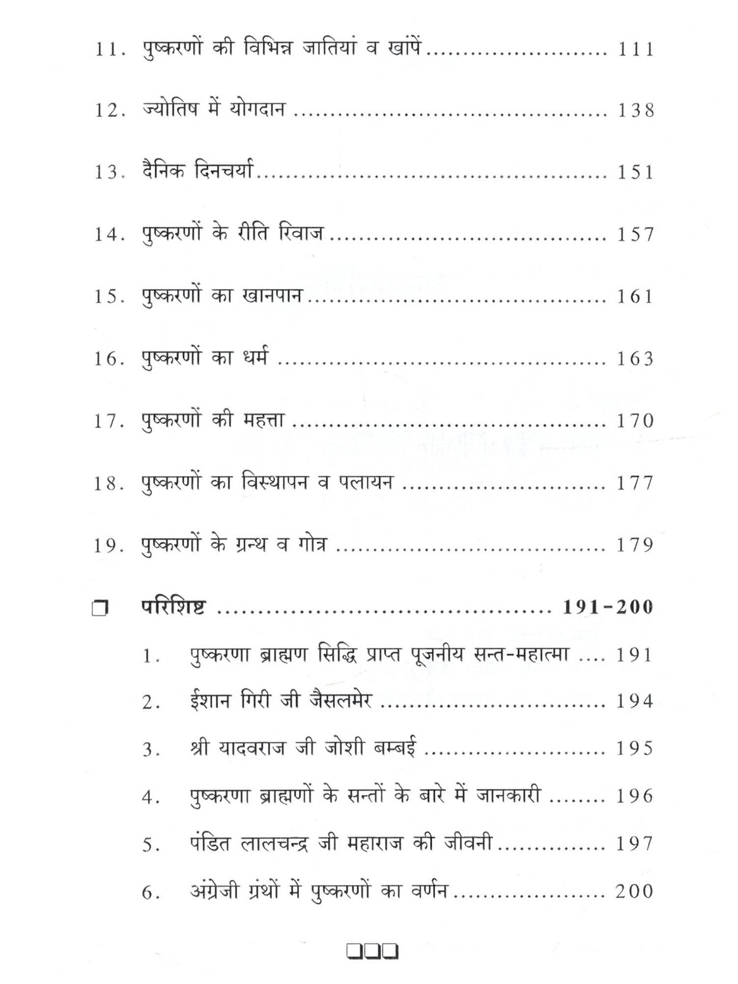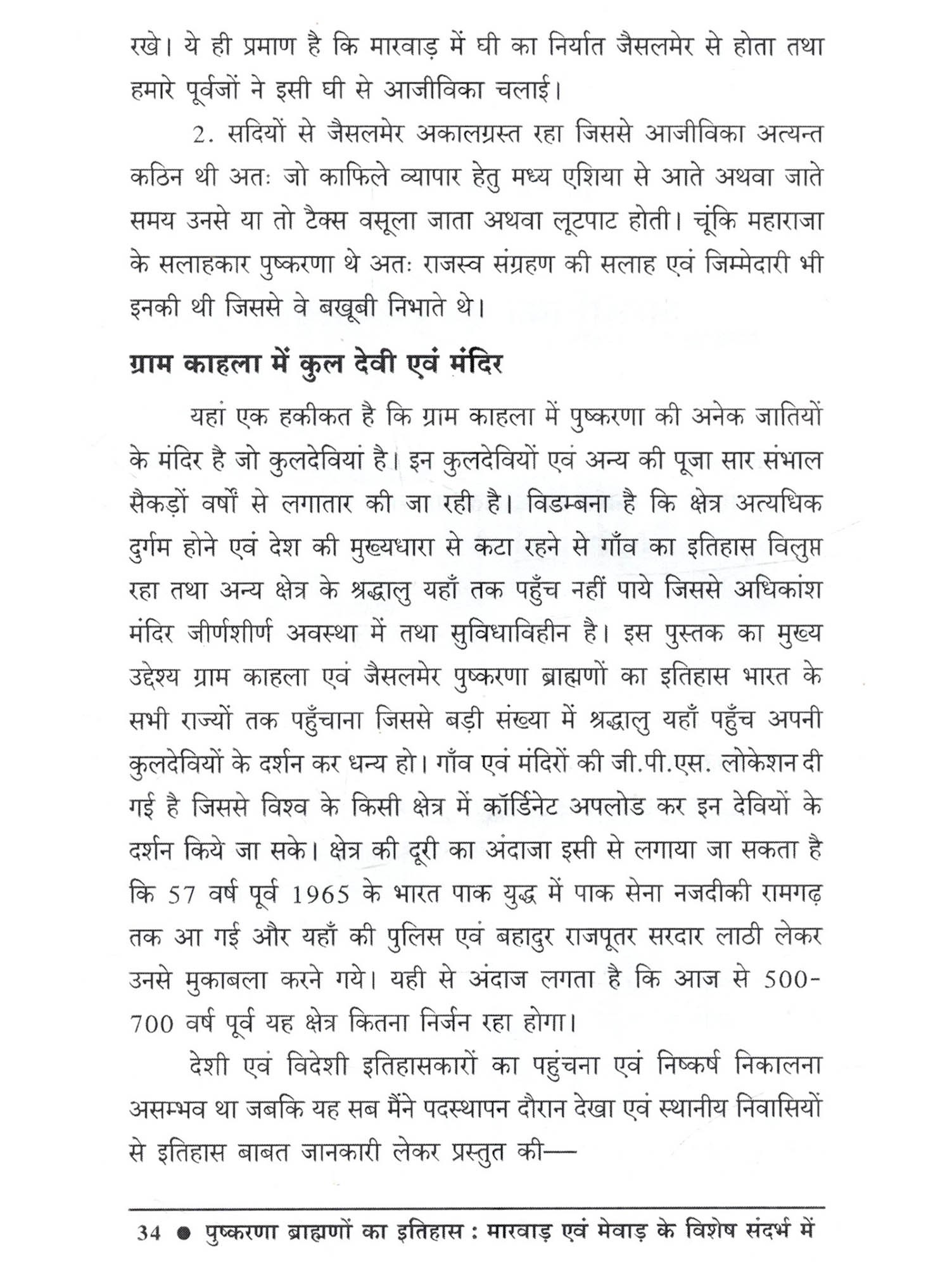 पुष्करणा ब्राह्मण समुदाय के बारे में अनेक बातें समाज में प्रचलित है लेकिन सत्यता की पुष्टि के लिए दस्तावेज उपलब्ध नहीं है। श्री जुगल किशोर गज्जा की अनेक वर्षों की शोध के बाद यह पुस्तक बहुत कुछ बातें सारगर्भित एवं तथ्य सहित बताती है। प्रातःकाल ब्रह्ममुहूर्त में उठने की परम्परा एवं आध्यात्मिक संत कबीर के ब्रह्म मुहूर्त के प्रयाग के बारे में विस्तार से वर्णन बेहद रोचक है। पुस्तक में पुरातन मंत्रोच्चार एवं त्रिकाल संध्या के बारे में भी विस्तार से बताया गया है जो ब्रह्म मुहूर्त के महत्त्व को दर्शाती है। पुष्करणा ब्राह्मण समुदाय की जातियों के बारे में अत्यन्त गहन एवं सूक्ष्म अध्ययन, आने वाली विचारशील पीढ़ी के लिए अत्यन्त महत्त्वपूर्ण जानकारी साबित होगा। इस पुस्तक में श्री गज्जा का जातियों के सम्बन्ध में गहन अध्ययन स्पष्ट रूप से नजर आता है। जाति विशेष की परम्परा उत्पत्ति एवं इतिहास दुर्लभ है। आने वाली पीढ़ियों के लिए एक अत्यन्त आवश्यक दस्तावेज के रूप में यह पुस्तक महत्त्वपूर्ण है। जब हम यह पुस्तक पढ़ते हैं तब लगता है पुष्करणा ब्राह्मण समुदाय कितना विशिष्ट एवं बुद्धिजीवी है, हमारी हर बात रंग एवं विचारों से पूर्ण है। श्री गज्जा प्रख्यात पक्षी विज्ञानी डॉ. सलीम अली के साथ भी कार्य कर चुके हैं तथा वर्तमान में डॉ. असद रफी रहमानी, विश्व के प्रसिद्ध वरिष्ठ पक्षी विज्ञानी है एवं श्री गज्जा ने उनके साथ भी कार्य किया है। पुस्तक में हमारे धार्मिक एवं सांस्कृतिक धरोहर स्थलों का विस्तृत वर्णन जी.पी.एस. विवरण सहित दर्ज किए गया है। श्री गज्जा की वर्षों की तपस्या का परिणाम यह पुस्तक एक ऐतिहासिक दस्तावेज है।