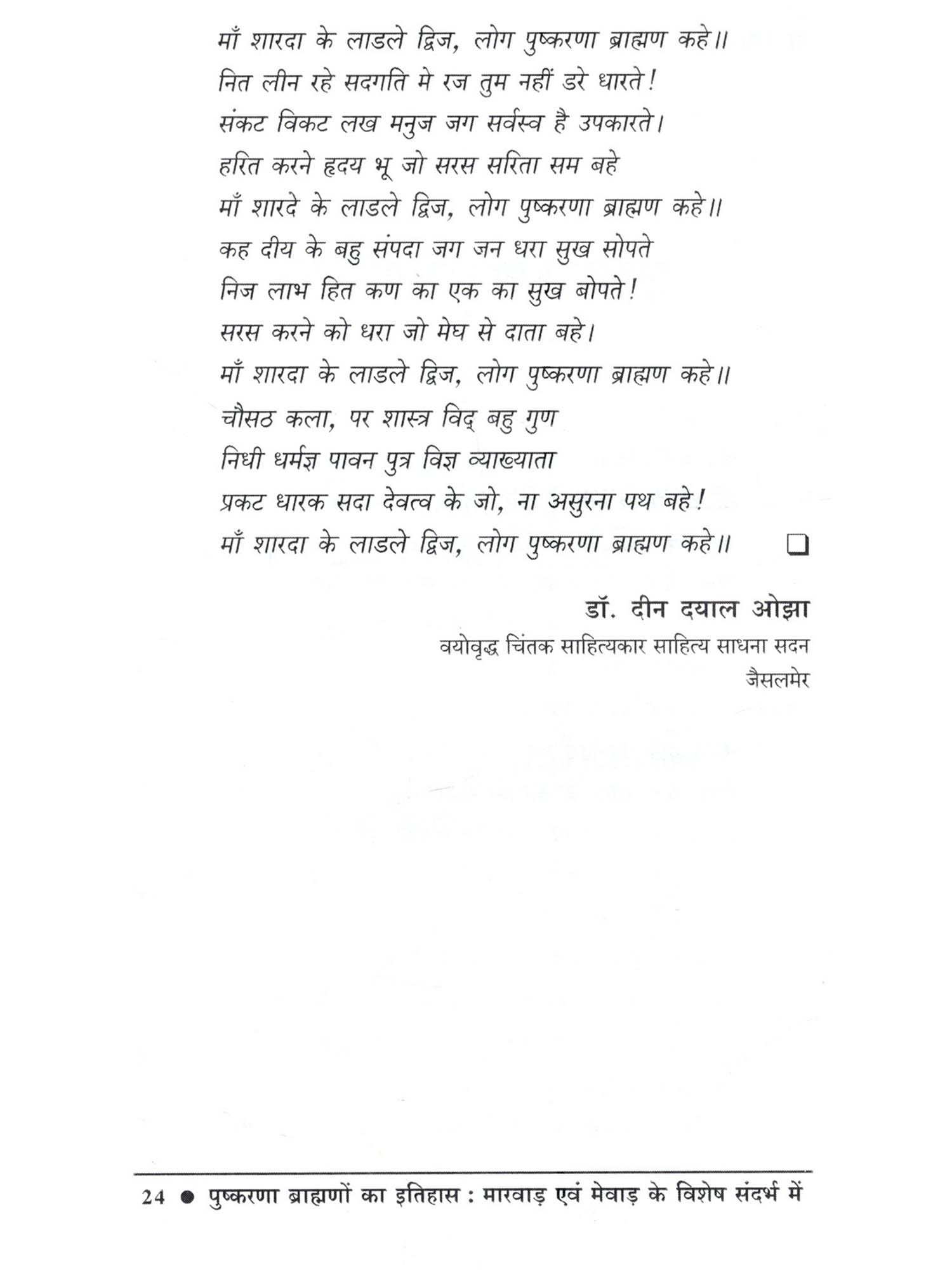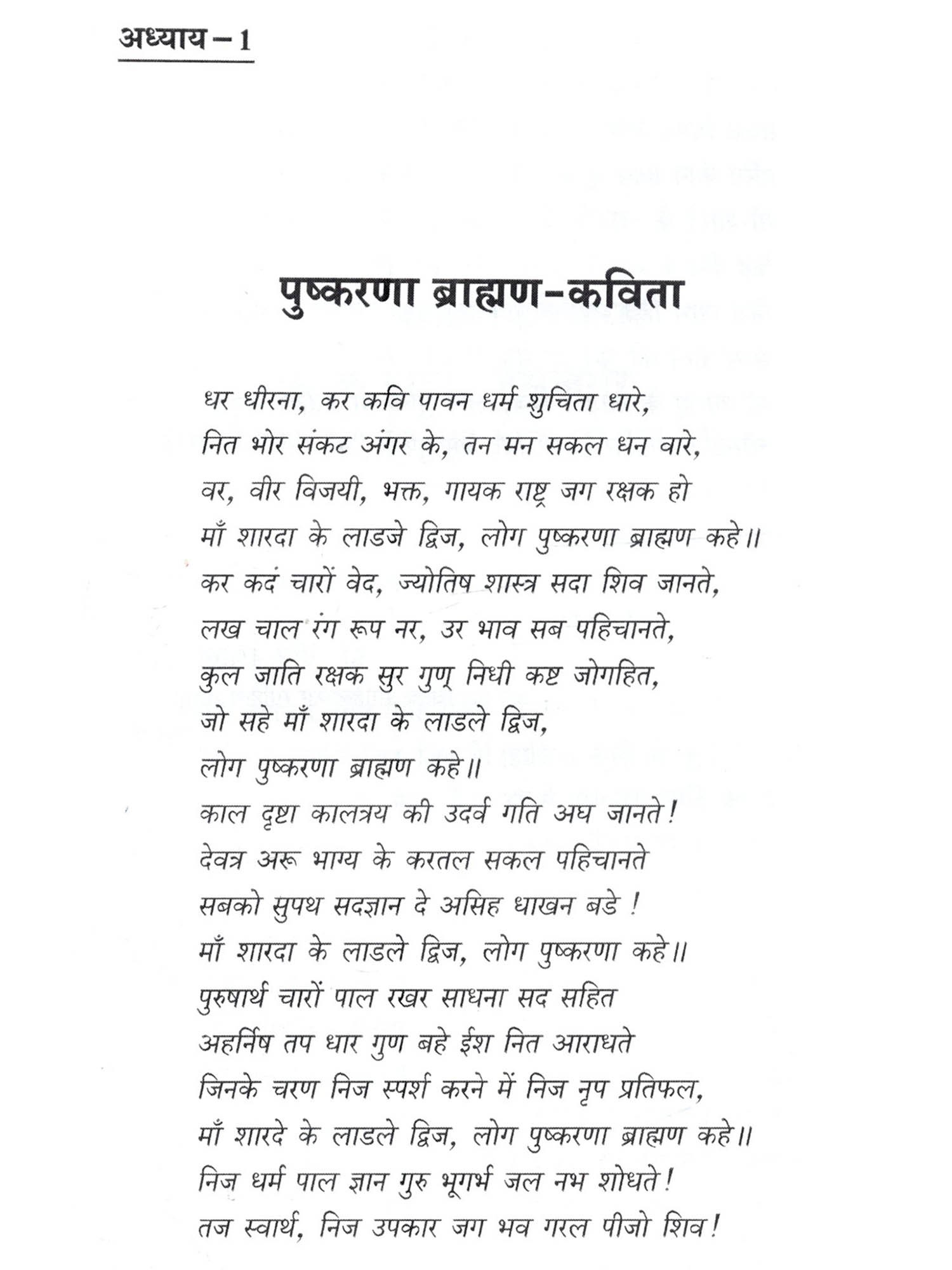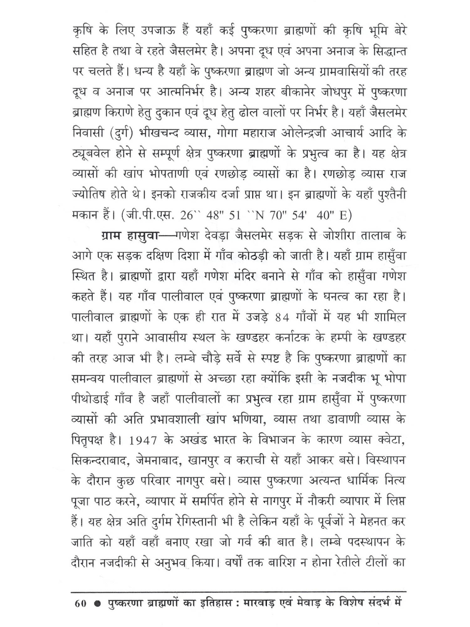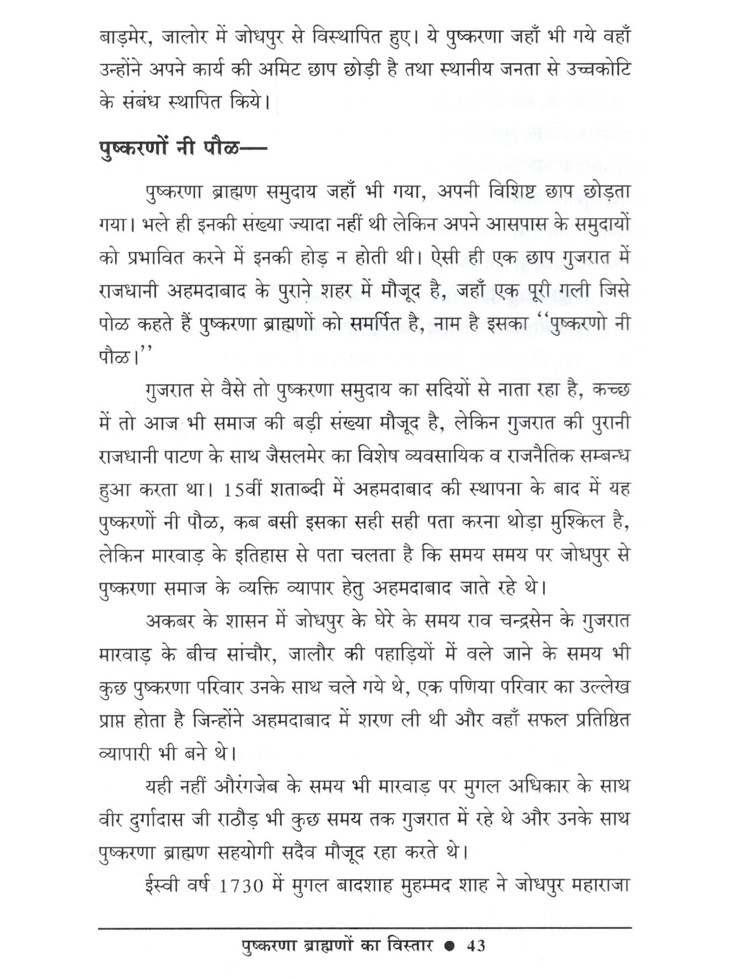 पुष्करणा ब्राह्मण समुदाय के बारे में अनेक बातें समाज में प्रचलित है लेकिन सत्यता की पुष्टि के लिए दस्तावेज उपलब्ध नहीं है। श्री जुगल किशोर गज्जा की अनेक वर्षों की शोध के बाद यह पुस्तक बहुत कुछ बातें सारगर्भित एवं तथ्य सहित बताती है। प्रातःकाल ब्रह्ममुहूर्त में उठने की परम्परा एवं आध्यात्मिक संत कबीर के ब्रह्म मुहूर्त के प्रयाग के बारे में विस्तार से वर्णन बेहद रोचक है। पुस्तक में पुरातन मंत्रोच्चार एवं त्रिकाल संध्या के बारे में भी विस्तार से बताया गया है जो ब्रह्म मुहूर्त के महत्त्व को दर्शाती है। पुष्करणा ब्राह्मण समुदाय की जातियों के बारे में अत्यन्त गहन एवं सूक्ष्म अध्ययन, आने वाली विचारशील पीढ़ी के लिए अत्यन्त महत्त्वपूर्ण जानकारी साबित होगा। इस पुस्तक में श्री गज्जा का जातियों के सम्बन्ध में गहन अध्ययन स्पष्ट रूप से नजर आता है। जाति विशेष की परम्परा उत्पत्ति एवं इतिहास दुर्लभ है। आने वाली पीढ़ियों के लिए एक अत्यन्त आवश्यक दस्तावेज के रूप में यह पुस्तक महत्त्वपूर्ण है। जब हम यह पुस्तक पढ़ते हैं तब लगता है पुष्करणा ब्राह्मण समुदाय कितना विशिष्ट एवं बुद्धिजीवी है, हमारी हर बात रंग एवं विचारों से पूर्ण है। श्री गज्जा प्रख्यात पक्षी विज्ञानी डॉ. सलीम अली के साथ भी कार्य कर चुके हैं तथा वर्तमान में डॉ. असद रफी रहमानी, विश्व के प्रसिद्ध वरिष्ठ पक्षी विज्ञानी है एवं श्री गज्जा ने उनके साथ भी कार्य किया है। पुस्तक में हमारे धार्मिक एवं सांस्कृतिक धरोहर स्थलों का विस्तृत वर्णन जी.पी.एस. विवरण सहित दर्ज किए गया है। श्री गज्जा की वर्षों की तपस्या का परिणाम यह पुस्तक एक ऐतिहासिक दस्तावेज है।