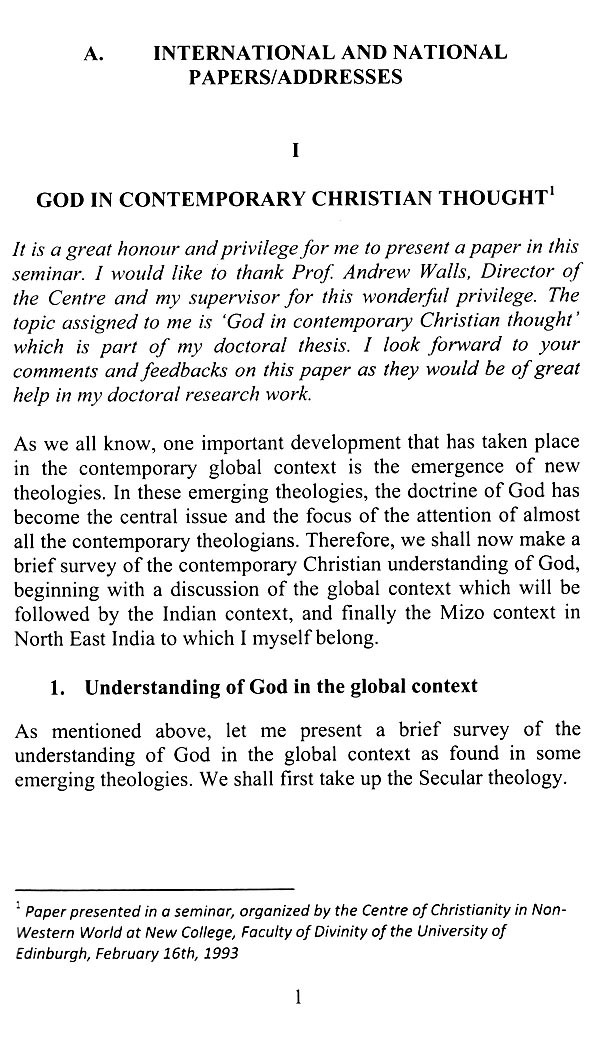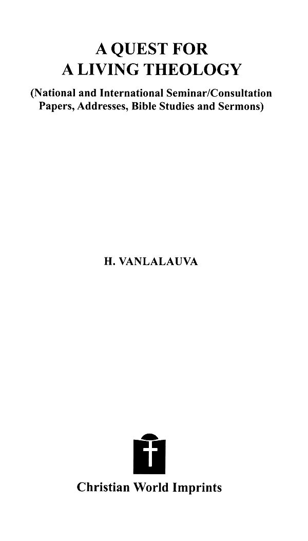 It gives me an immense joy to see that this book entitled, A QUEST FOR A LIVING THEOLOGY is now published by the Christian World Imprints, Delhi. It is dedicated to the sweet memory of my beloved wife, Lallianpuii who had left for eternal glory on July 6th., 2016.