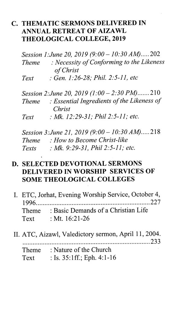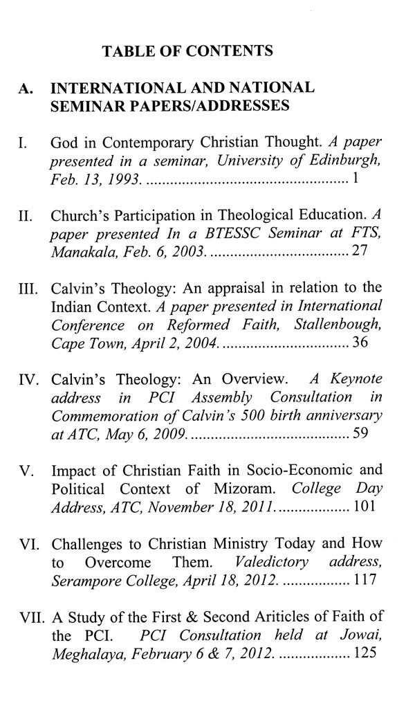 The book contains my theological works, such as, National and International seminar papers, addresses, Bible studies on selected themes both in the Biennial Assemblies of the Presbyterian Church of India (PCI) and North East India Christian Council (NEICC), thematic sermons which were delivered in the Annual Retreat in Aizawl Theological College (ATC) and selected devotional sermons preached in the worship services of some Theological Colleges, during the last thirty years of my theological journey.