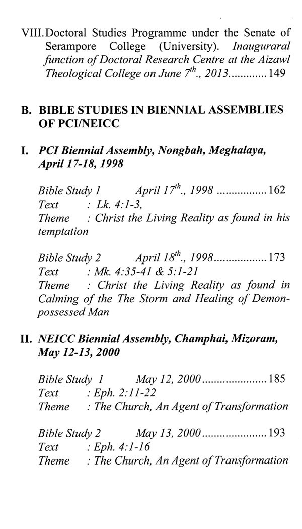 In the Biennial Assemblies of the Presbyterian Church of India held at Nongpoh, Meghalaya on April 16-19, 1998 and of the North East Indian Christian Council held at Champhai, Mizoram on May 11-14, 2000, I had the privilege to lead Bible Studies on the selected themes, 'Christ the Living Reality' and 'The Church, An Agent of Transformation.'