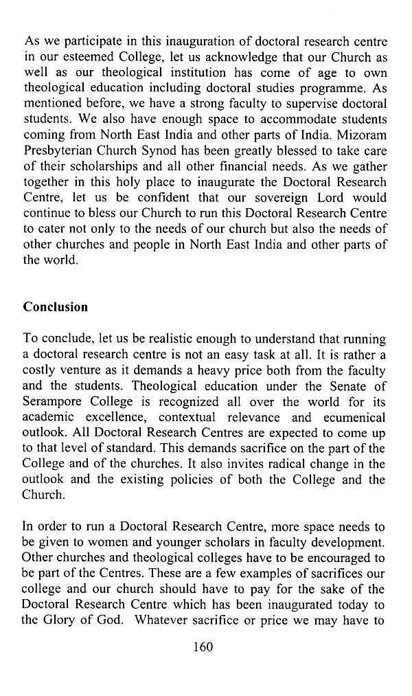 During my tenure as the Dean of SATHRI from 2010-2014, I had the privilege to address two auspicious occasions, namely, the College Day of ATC in November, 2011 and Serampore College Graduation Day in April, 2012. I was also given the chance to participate as resource person in the PCI consultation held at Jowai on November, 2012 and as Guest of honour in the inaugural function of Doctoral Studies Programme at ATC on June., 2013.