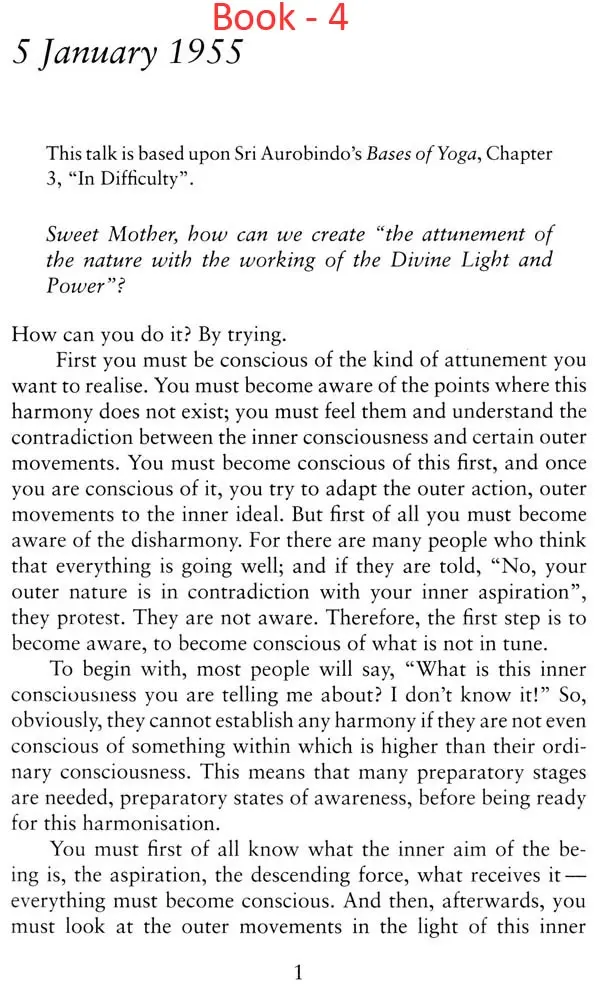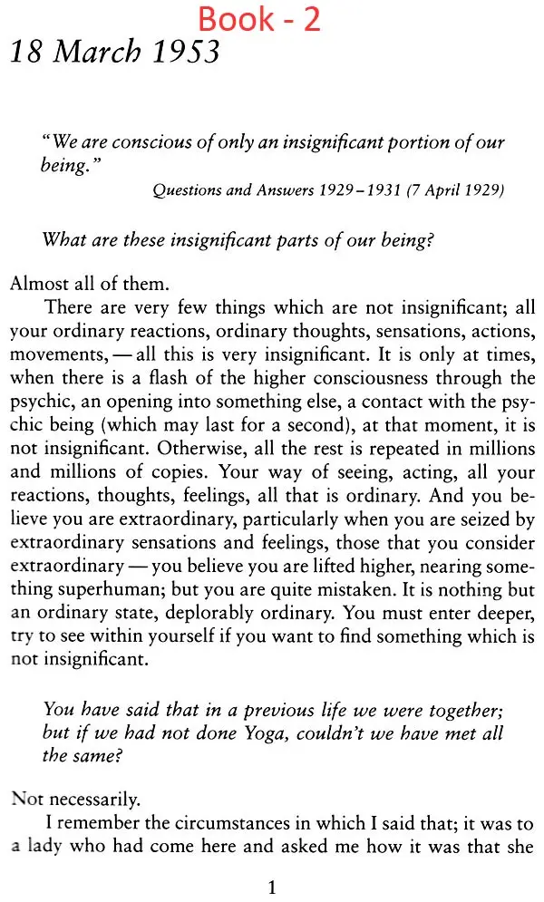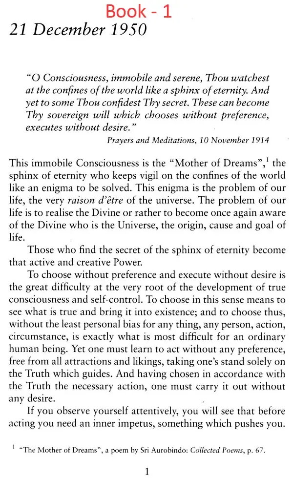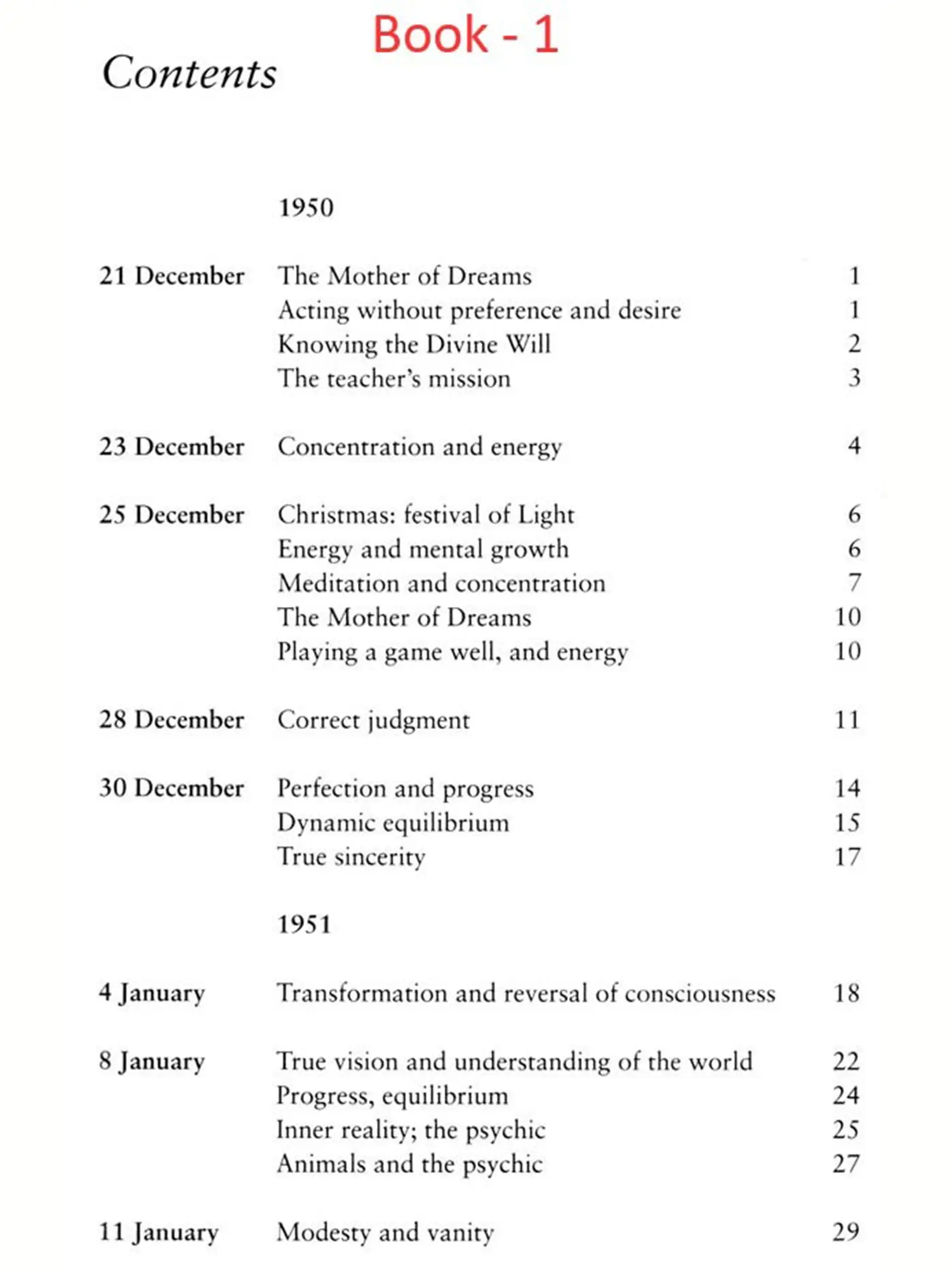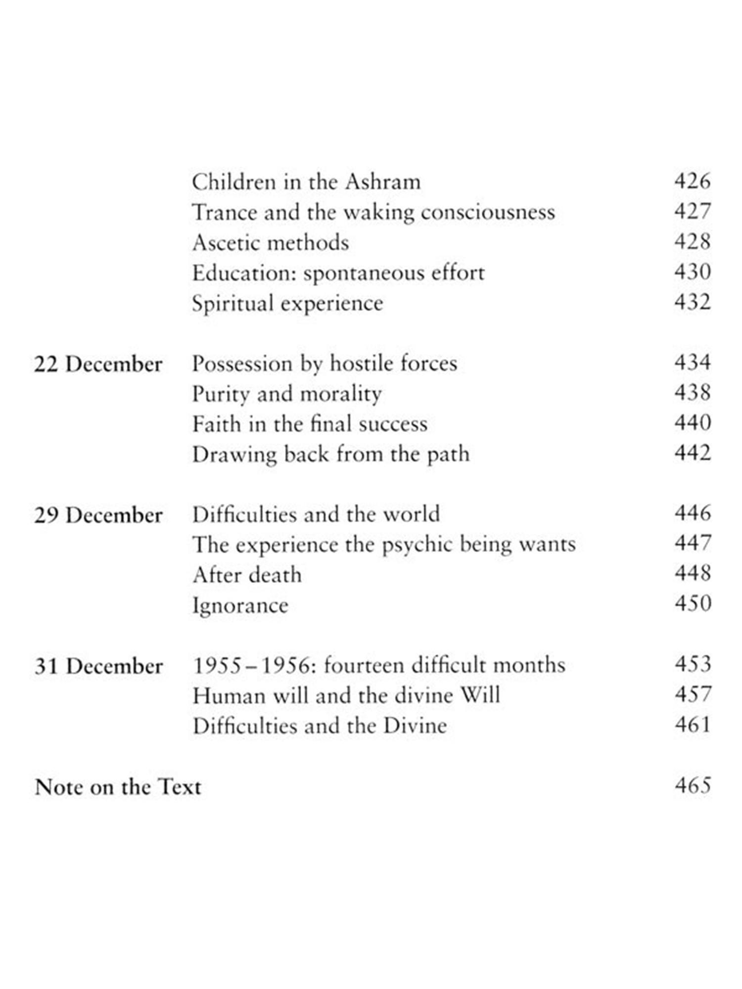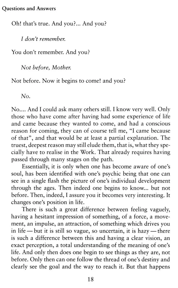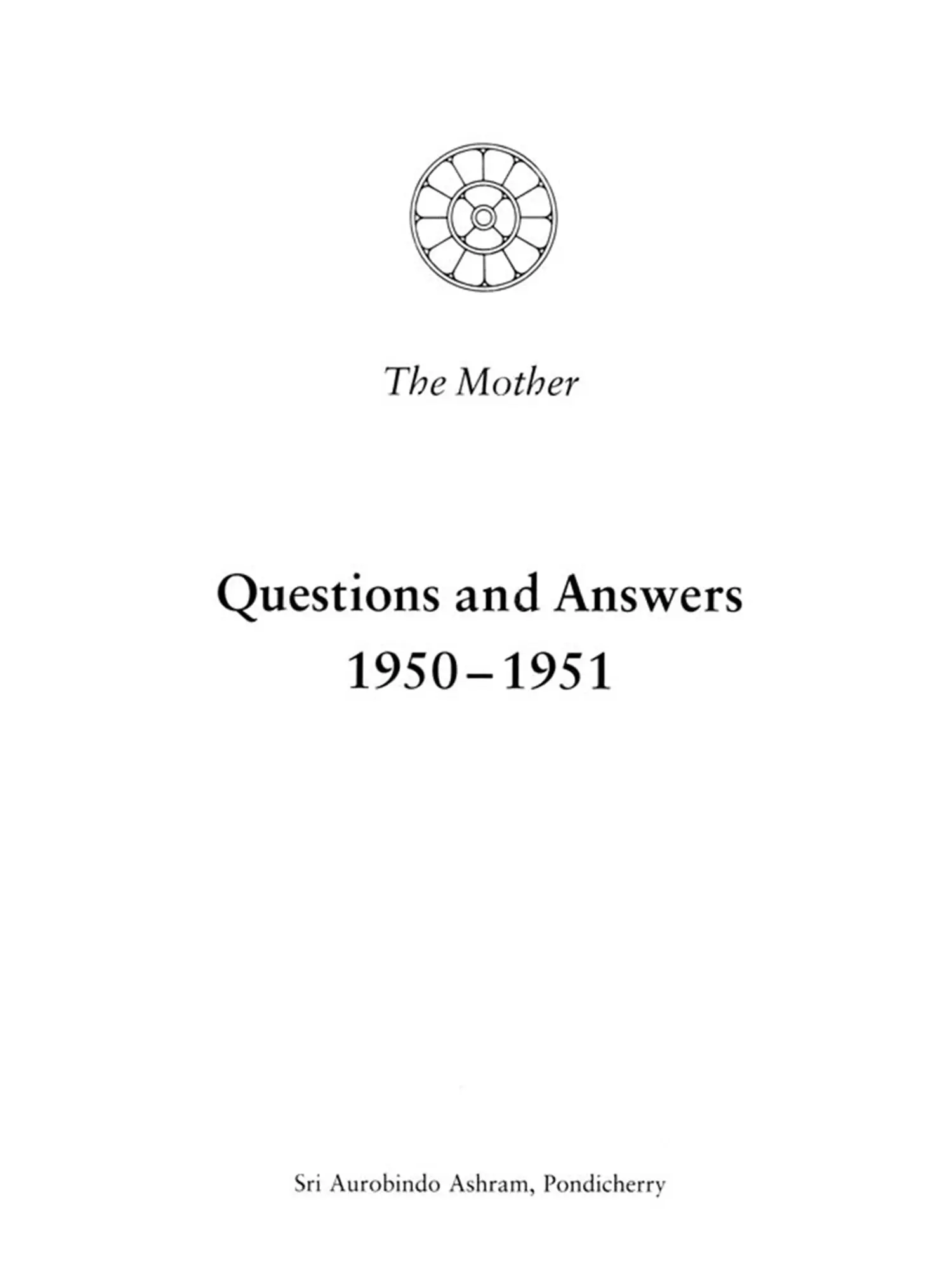 Questions and Answers 1950-1951 contains conversations of the Mother with members of the Sri Aurobindo Ashram and students of the Ashram's school. For most of this period the Mother answered questions about some of her essays on education and her conversations of 1929, which deal with various aspects of spiritual life. Towards the end she discussed some letters of Sri Aurobindo and his book The Mother.