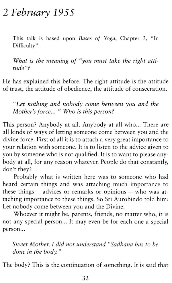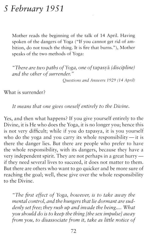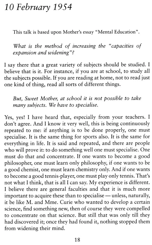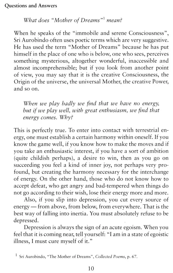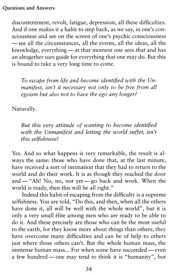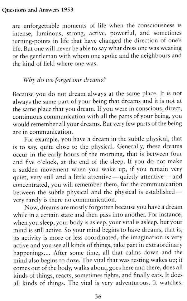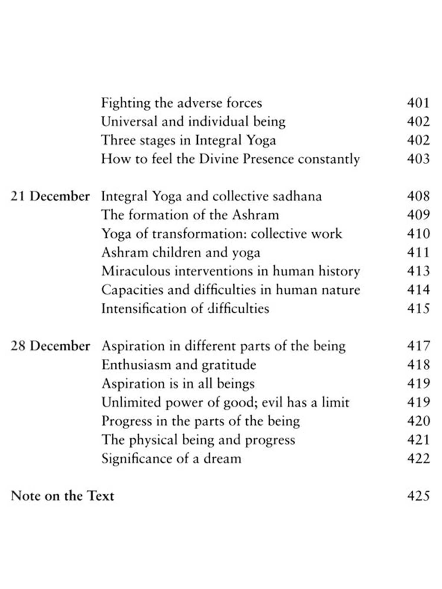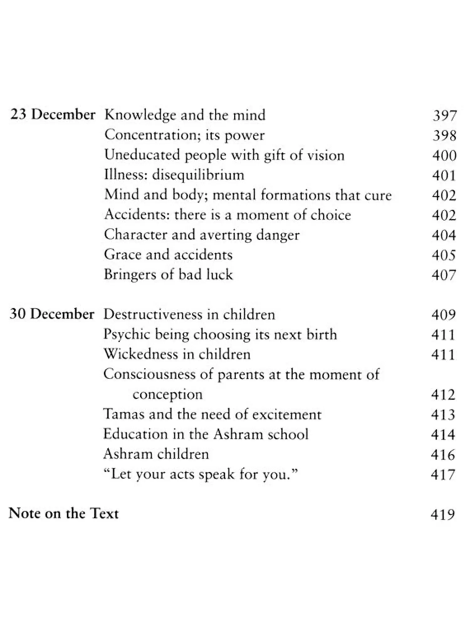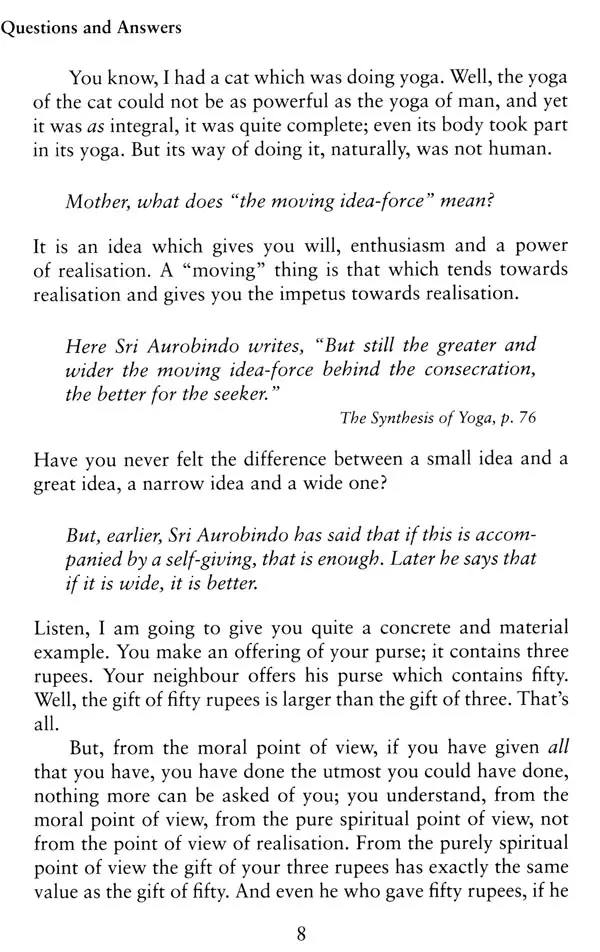 Questions and Answers 1950-1951 contains conversations of the Mother with members of the Sri Aurobindo Ashram and students of the Ashram's school. For most of this period the Mother answered questions about some of her essays on education and her conversations of 1929, which deal with various aspects of spiritual life. Towards the end she discussed some letters of Sri Aurobindo and his book The Mother.