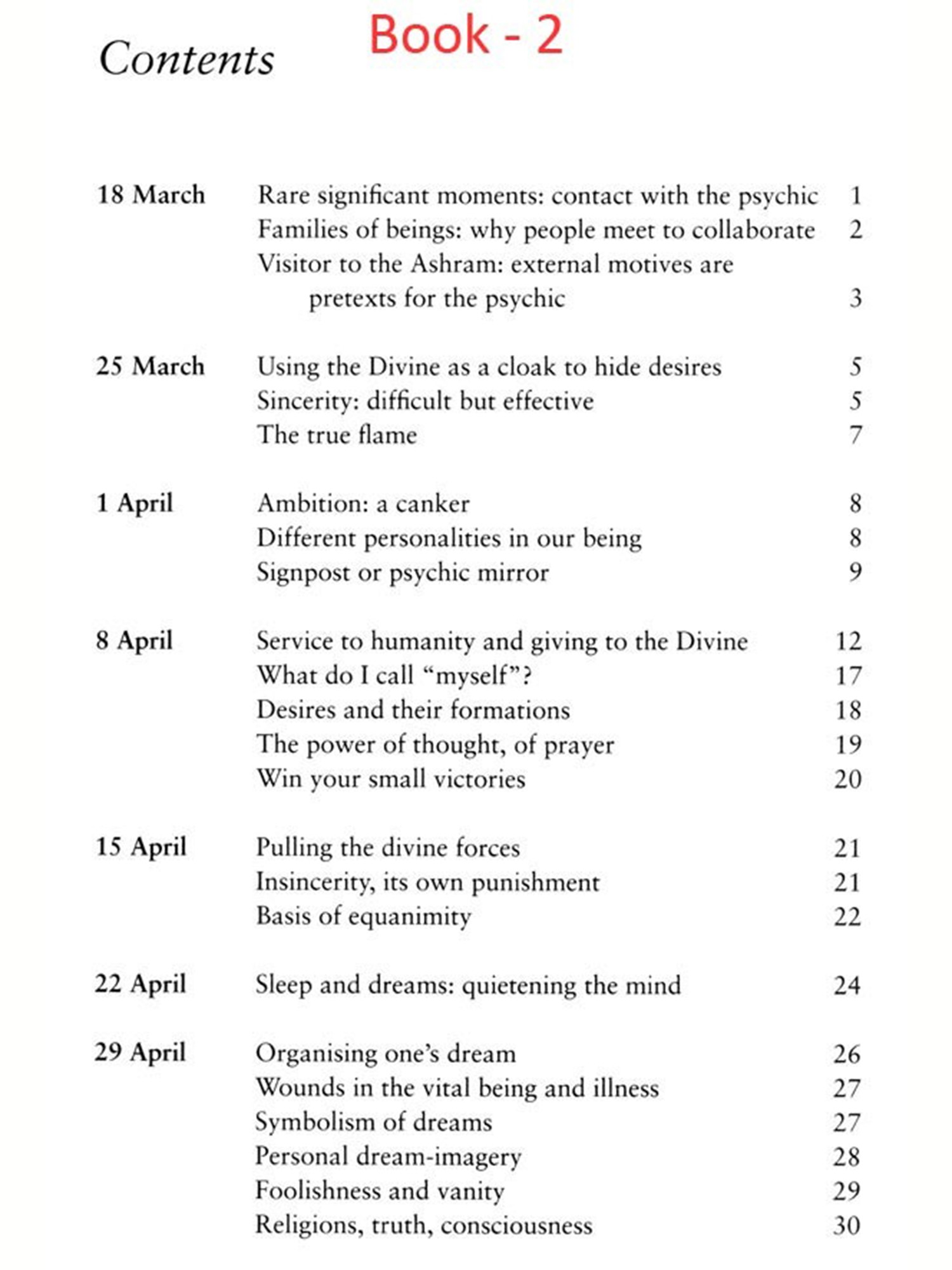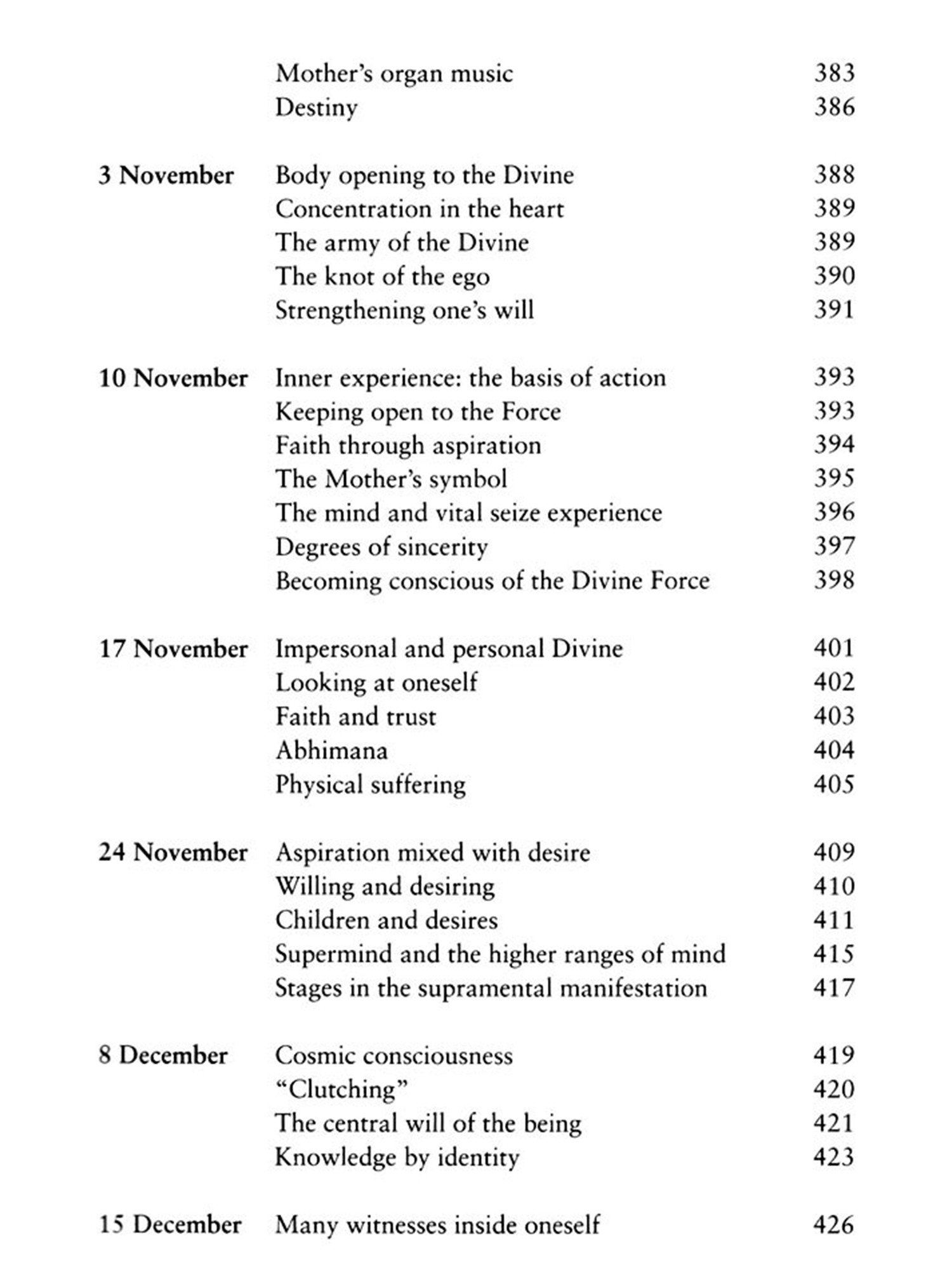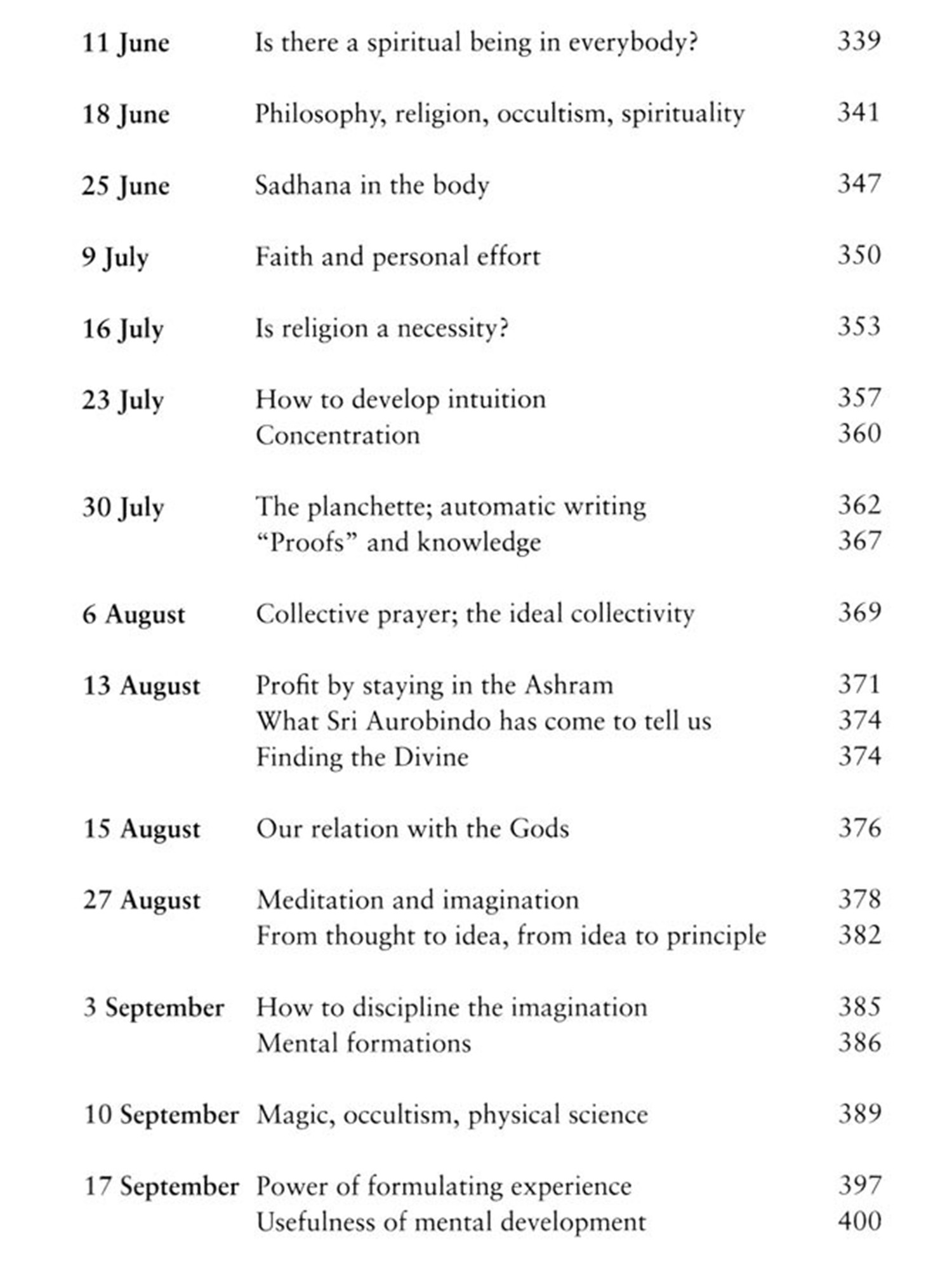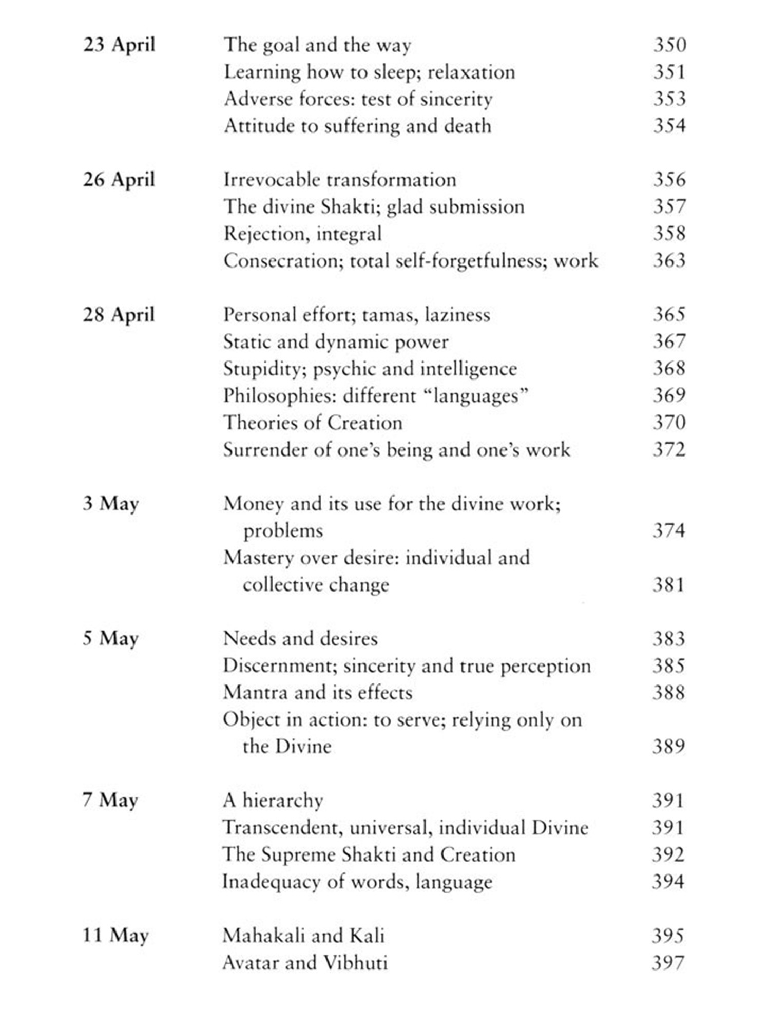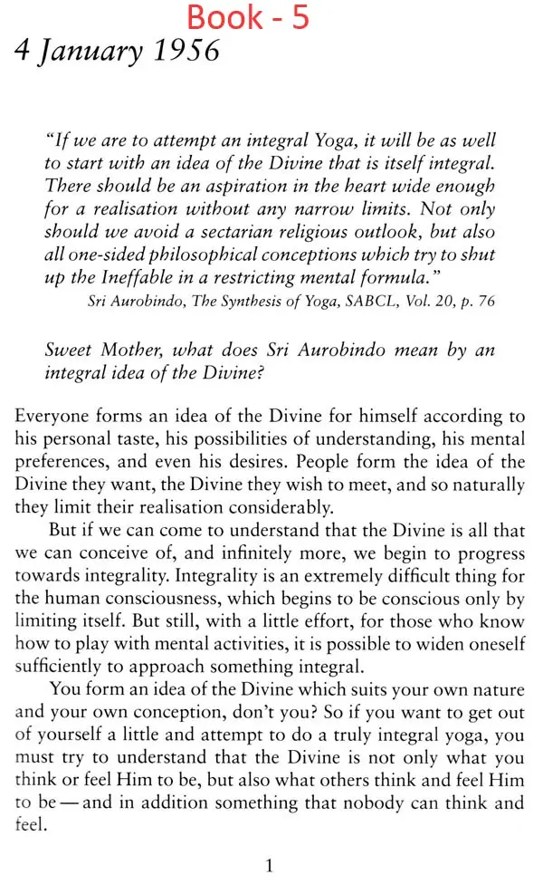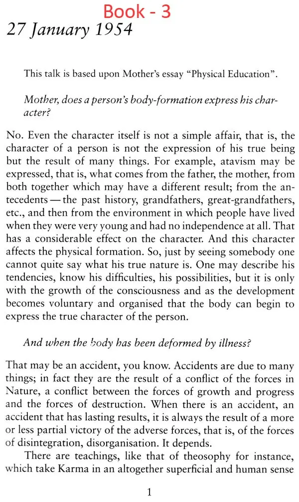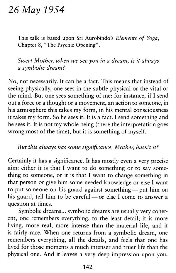 Questions and Answers 1950-1951 contains conversations of the Mother with members of the Sri Aurobindo Ashram and students of the Ashram's school. For most of this period the Mother answered questions about some of her essays on education and her conversations of 1929, which deal with various aspects of spiritual life. Towards the end she discussed some letters of Sri Aurobindo and his book The Mother.