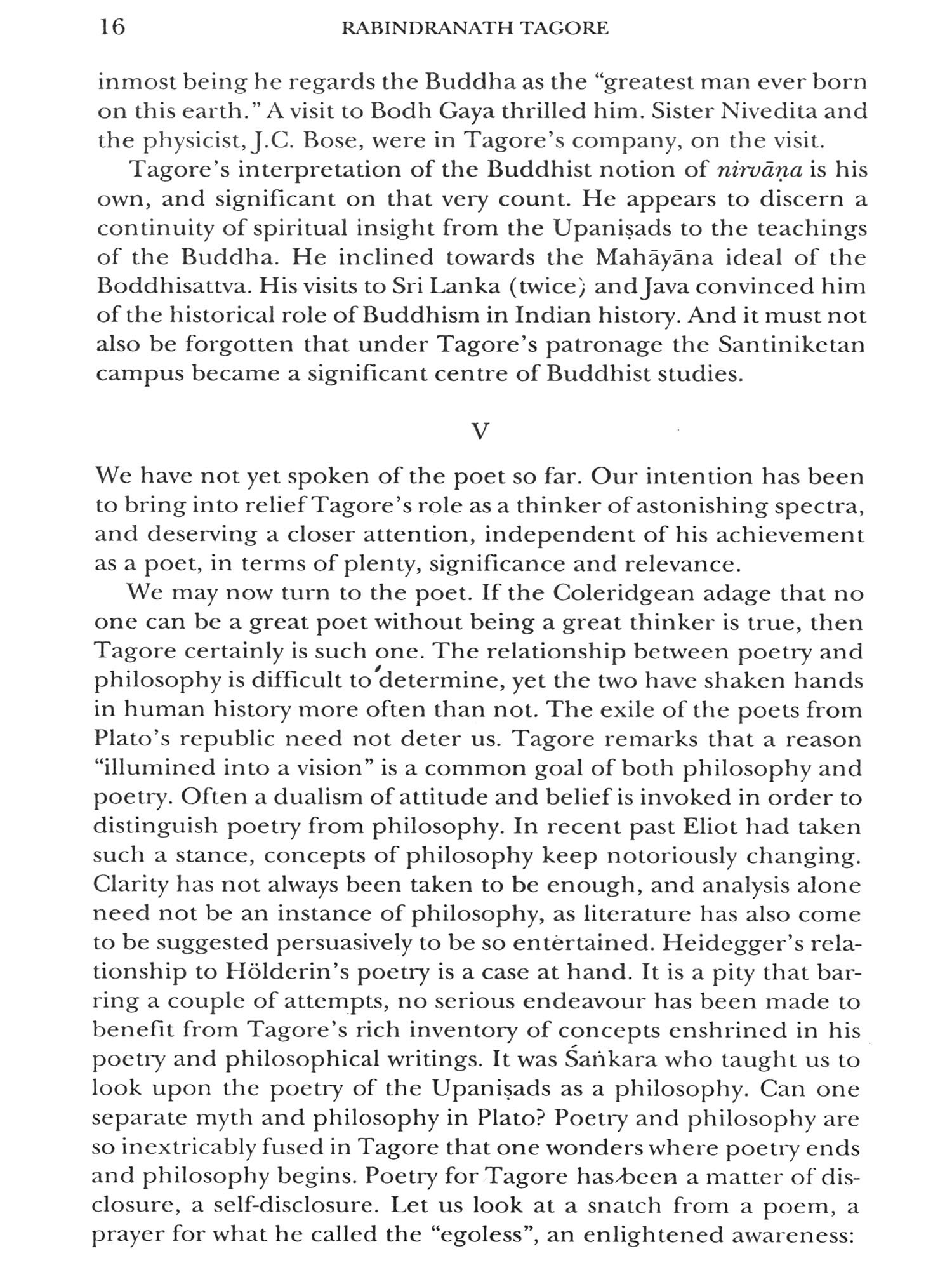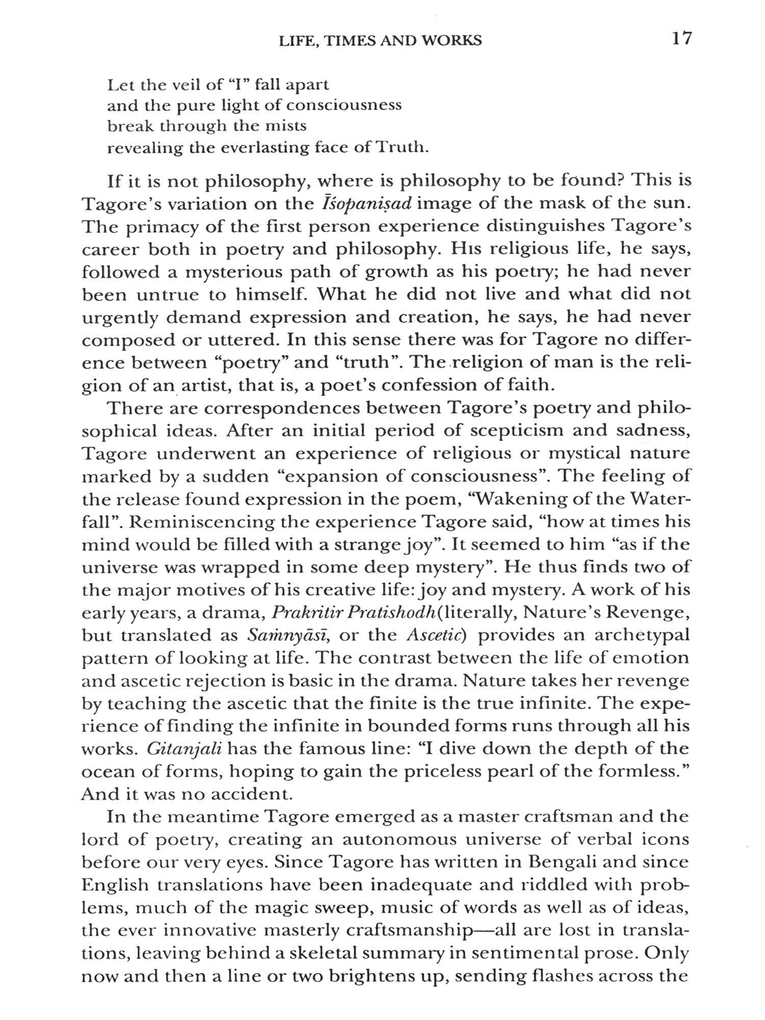 This book studies and explicates Tagore's central vision and fertile concept of man, his relation to life and world, knowledge and imagination vis-à-vis truth, religious life and goodness, love and beauty, society and state, and finally a philosophy of language. It will be noticed that everywhere Tagore breaks through to a deeper insight. It is no wonder Sir Isiah Berlin comments in The Sense of Reality that with Kant and Goethe the world still belongs to Tagore. As one cannot alienate myth from logic in Plato, or metaphor from analysis in Wittgenstein, so would one see that poetry and philosophy are intertwined in Tagore. It is not so because he is a poet. A poet indeed is he, but no less a philosophizer, challenging the antagonism of art and science, the logico-mathematical paradigm of thought, and viewing philosophical knowledge in a closer relationship to what art insight reveals about Being and human existence. Tagore thinks on an astonishing diversity of themes. To read him is also to linger before this or that idea, and risk thinking on one's own account. And, above all, Tagore's message is important at a time when everything is being undermined by a suicidal hedonism and dazed by the ranting of demagogues. He calls for a new evaluation of life, an awareness of life as transcendence into the affirmation of a free relationship to the world. This is liberation, not from, but to the world perceived as the laughter of Siva. May be, this is what we need most today.