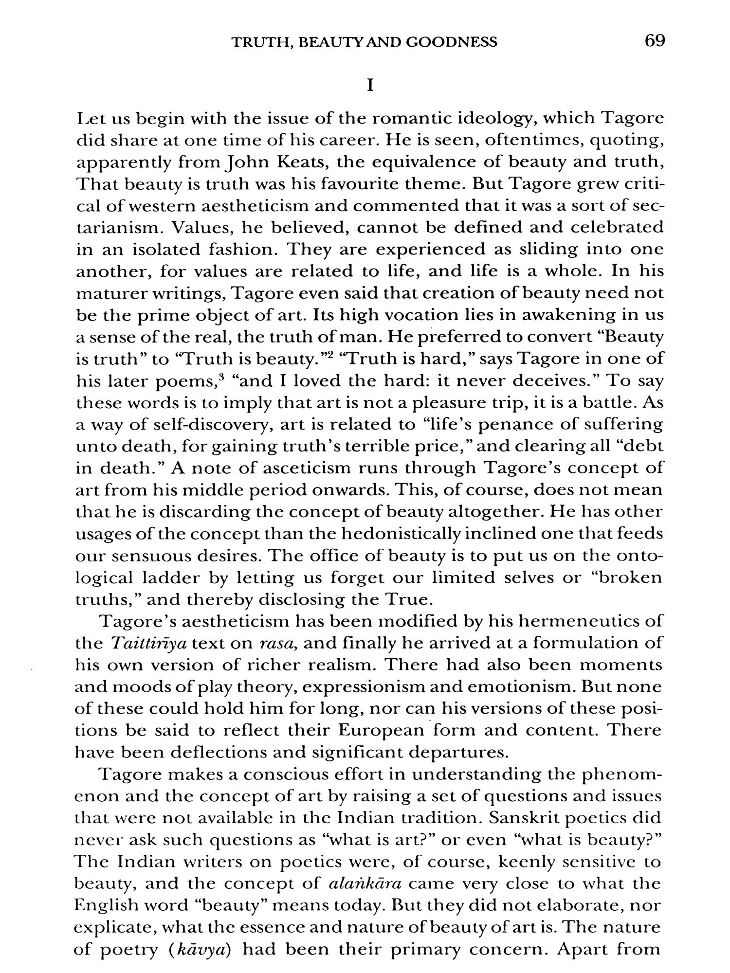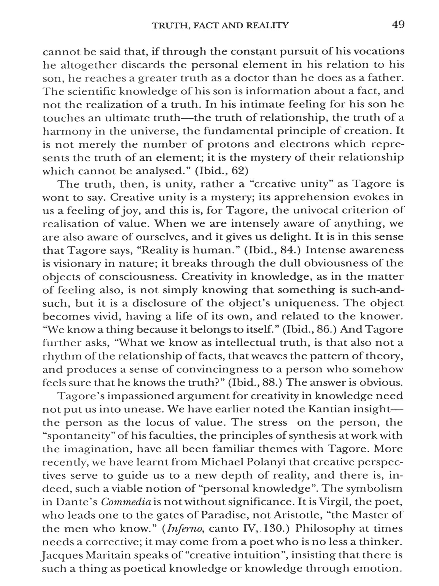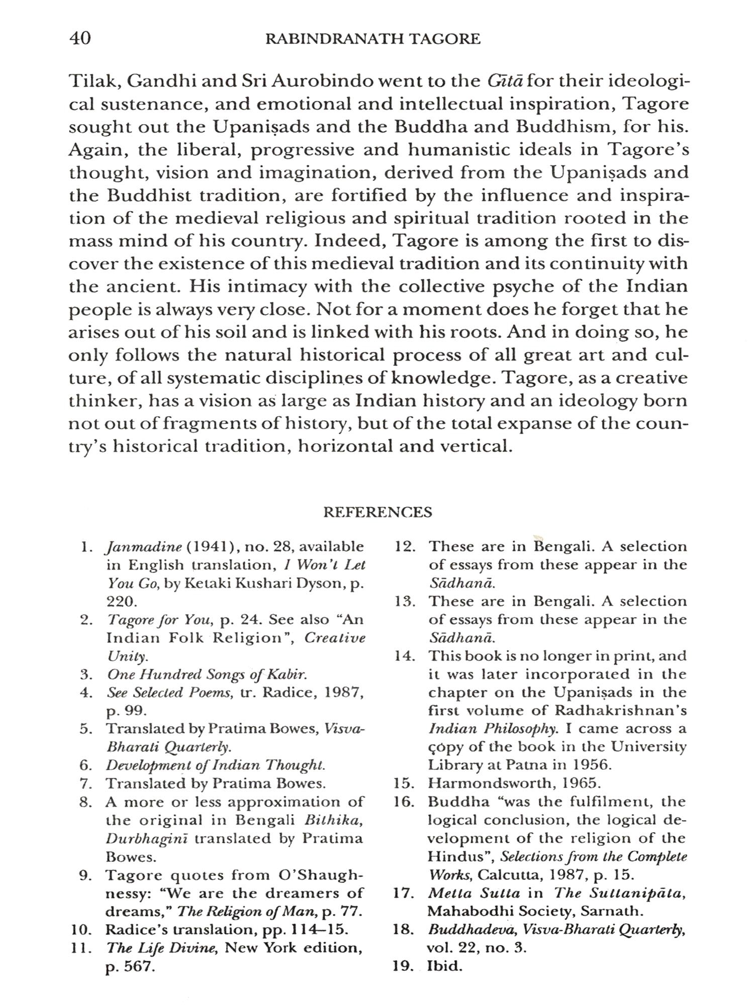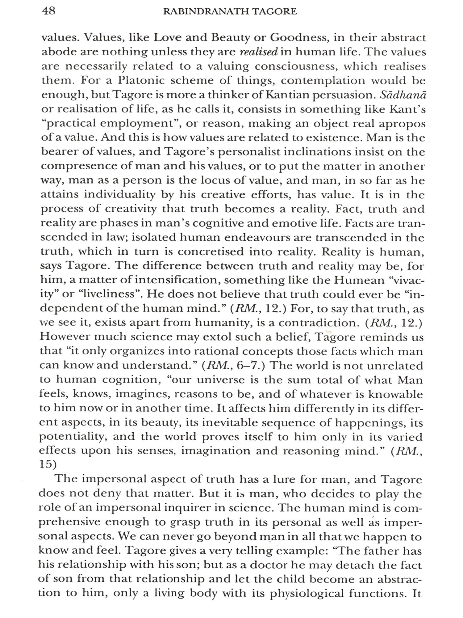 A Renaissance figure and marvel that Rabindranath Tagore has been, an analytical predilection of philosophy is hardly enough for comprehending his phenomenal creativity and expression of the highest values of will and feeling. Often the question whether Tagore is a philosopher is quite idle, as idle as whether Nietzsche is a philosopher, or the author of Philosophical Investigations is a philosopher. It is easier to deride the high and naked peaks of synoptic insight and opt for the worship of little gods. If one cares for unfreezing habits of thinking, and is ready to see things from a new angle of vision and open widows into the not-yet-seen, then one will have to agree that Tagore is a significant philosophizer and that he compels assent.