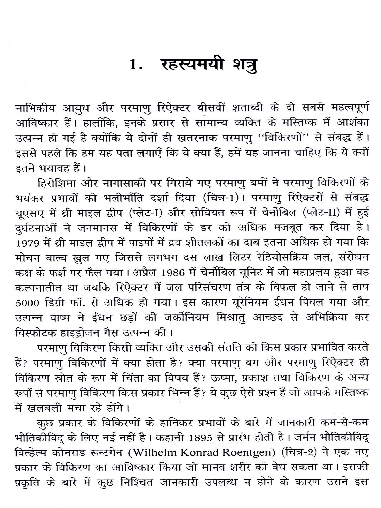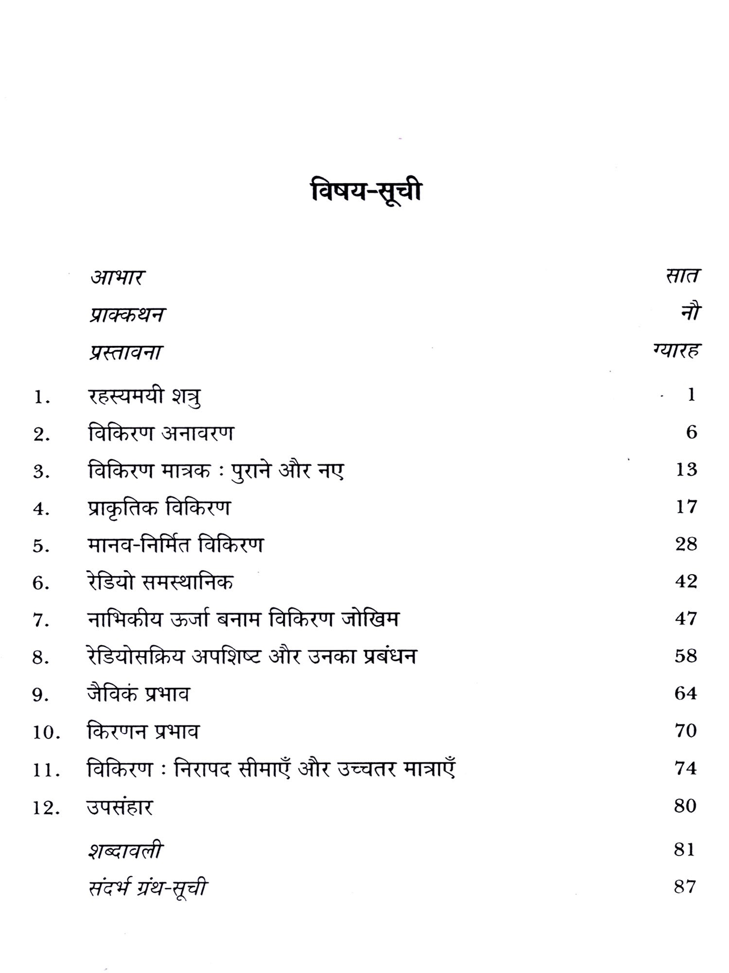 विकिरण एक ऐसा क्षेत्र है जो पिछले कुछ दशकों से वैज्ञानिकों, प्रौद्योगिकीविदों तथा जनता का ध्यान आकर्षित कर रहा है। एक ओर तो यह वरदान है और यदि इसका विवेक से प्रयोग नहीं किया जाए तो दूसरी ओर यह अभिशाप है। इस विषय पर विशेषज्ञों के लिए तो यथेष्ट वैज्ञानिक साहित्य उपलब्ध है, परंतु सामान्य प्रबुद्धवर्ग को इस क्षेत्र में प्रामाणिक, लोकप्रिय साहित्य उपलब्ध न होने के कारण इस विषय की जानकारी नहीं है। अतः डा. जैन ने ठीक ही लोकप्रिय शैली में सरल भाषा का प्रयोग करते हुए, चित्रों तथा आरेखों के माध्यम से इस पुस्तक को लिखने का साहस किया है।