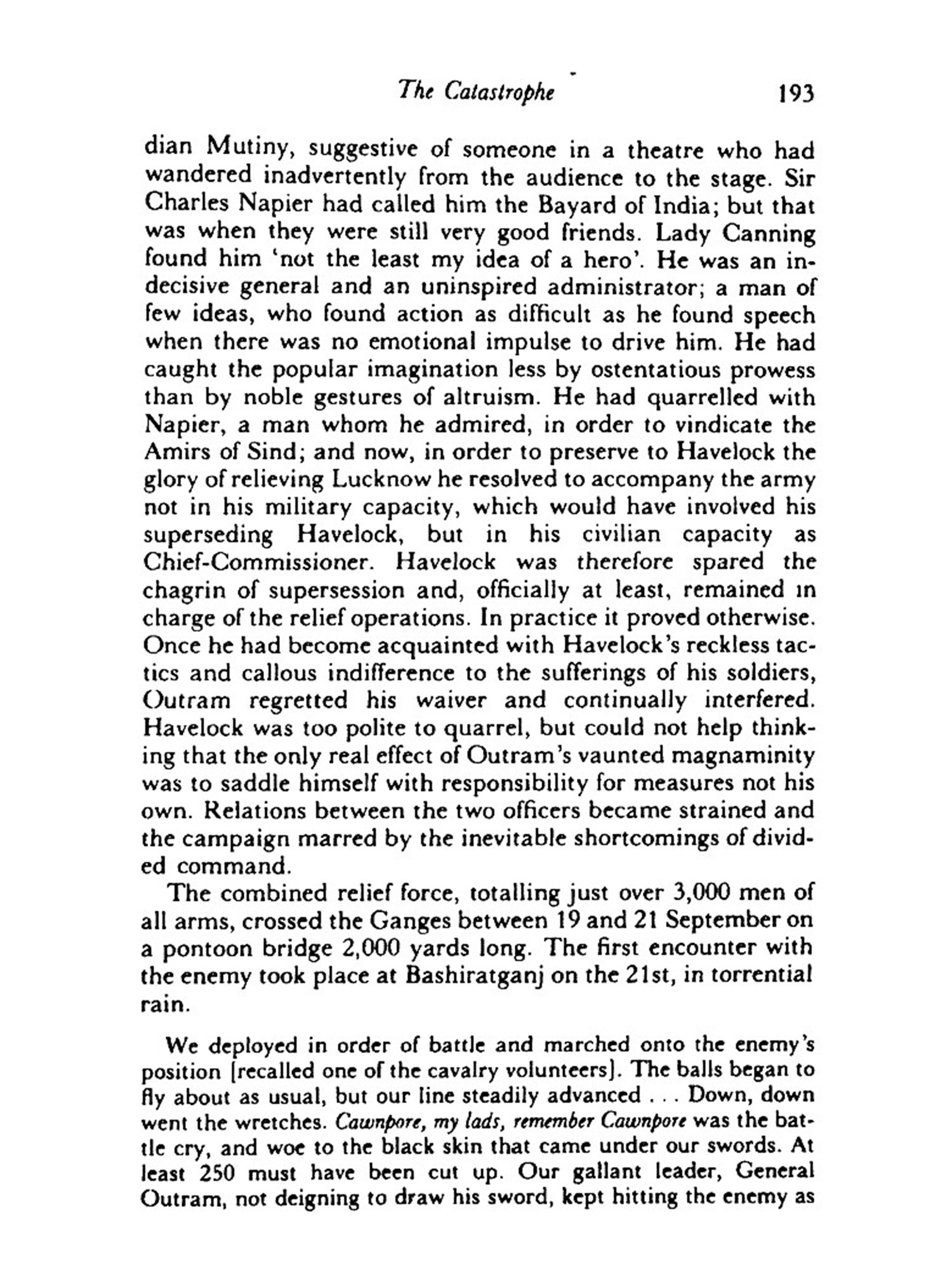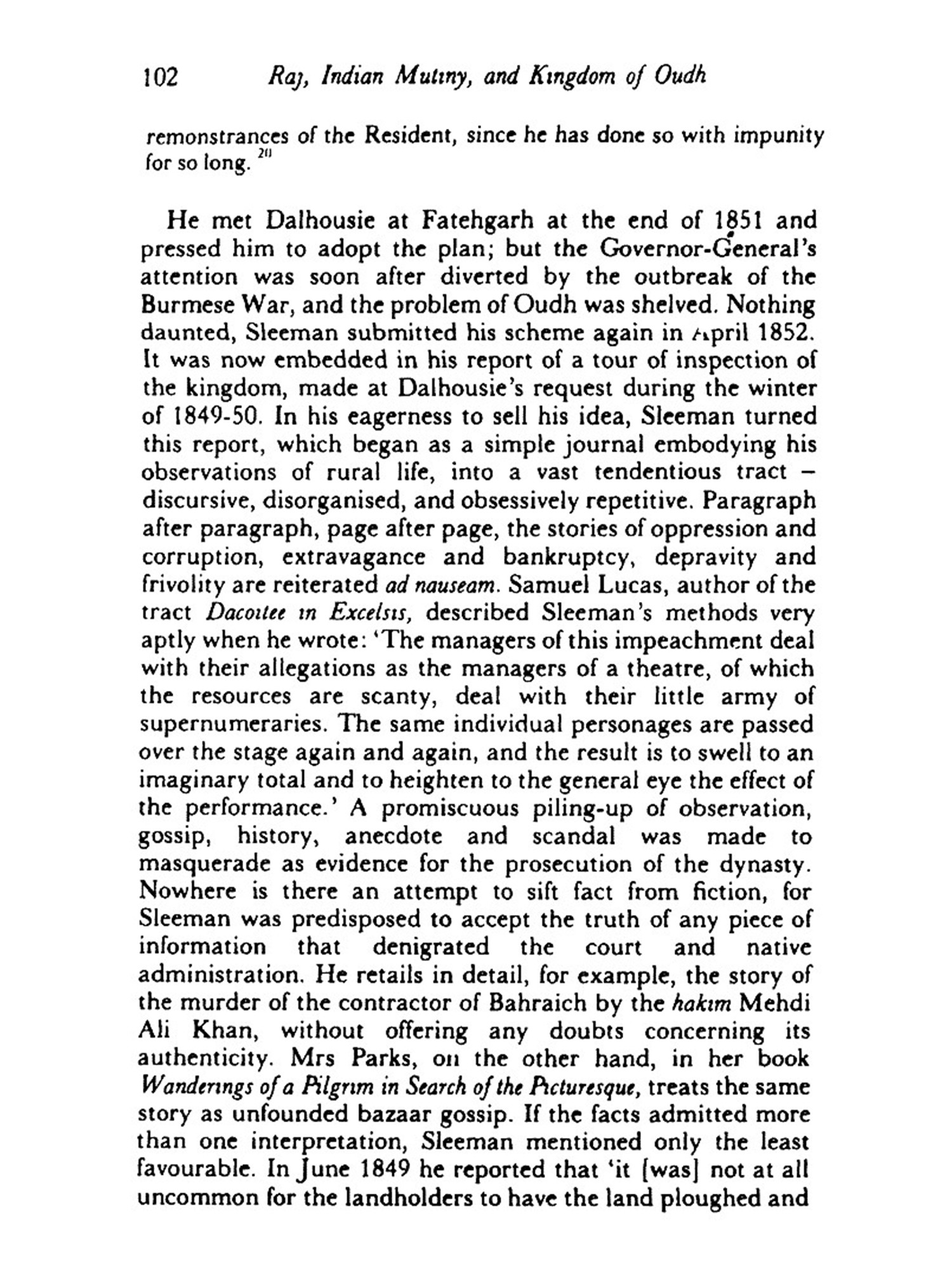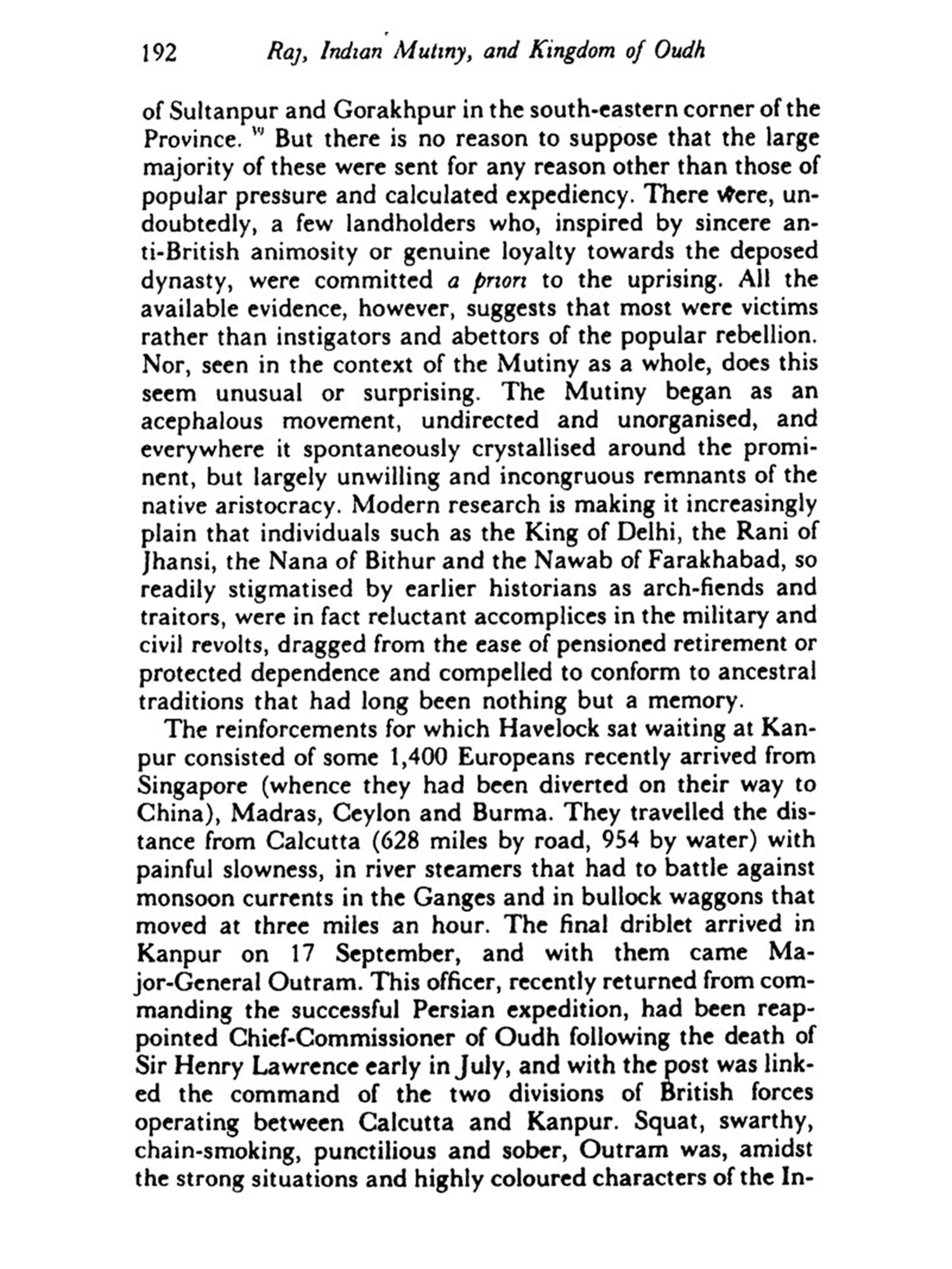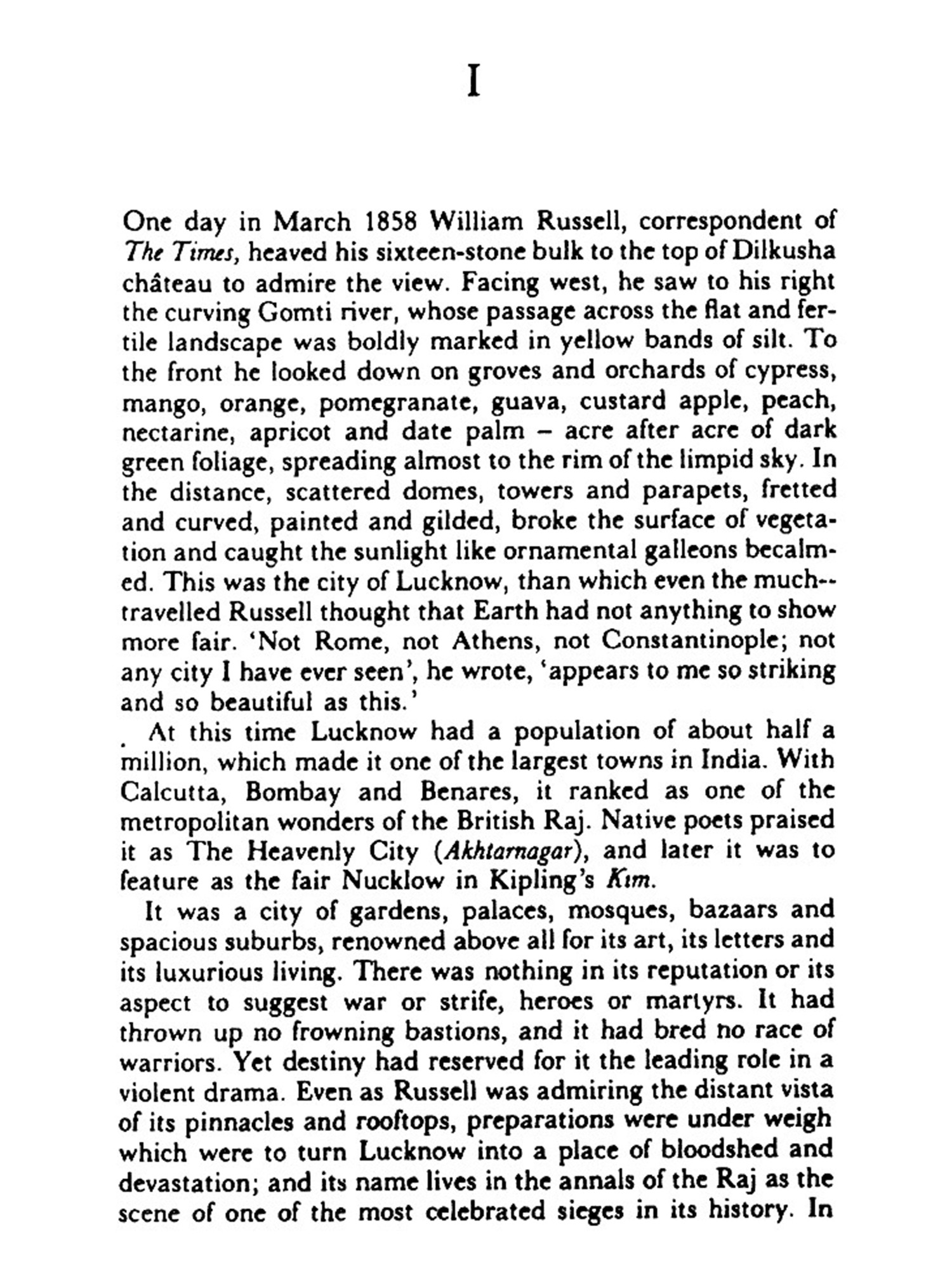 This book falls neatly into four sections. In the first part of the book the author describes the society and culture of Lucknow city, the development of British policies towards the Awadh Court and the reasons for the annexation of the province in 1856. In the second part of the book, he turns to the Awadh countryside and examines rural society the Rajput lineages, the rising taluqdari magnates, the religious topography and the impact of annexation in 1856. In the third part of the book, he tells the tale of the outbreak of the rebellion in Awadh, the siege of the Residency, the tribulations of the relieving forces, something of the character of the support for the rebel cause, of trimming taluqdars and of the reconquest of the Awadh country-side.