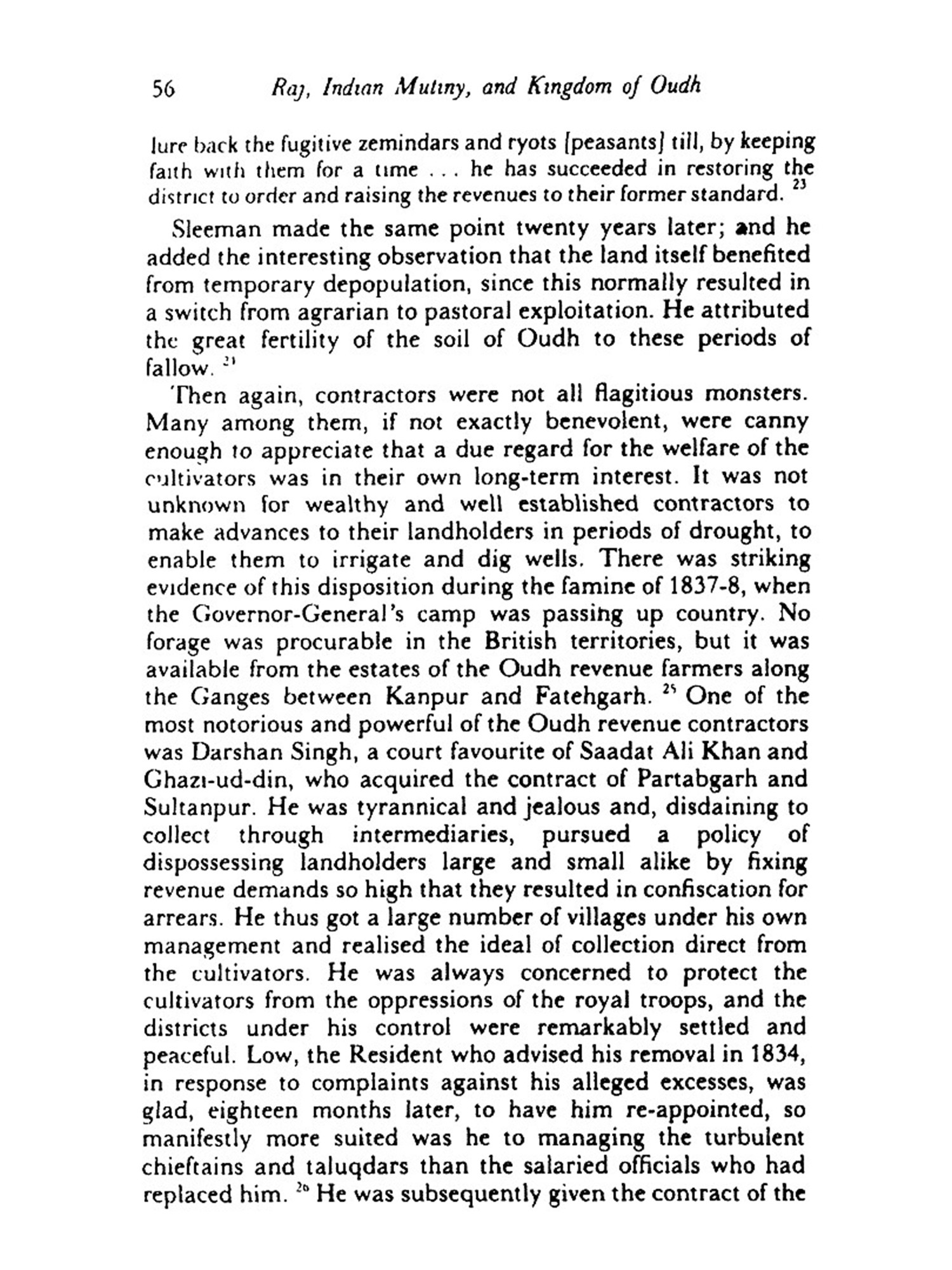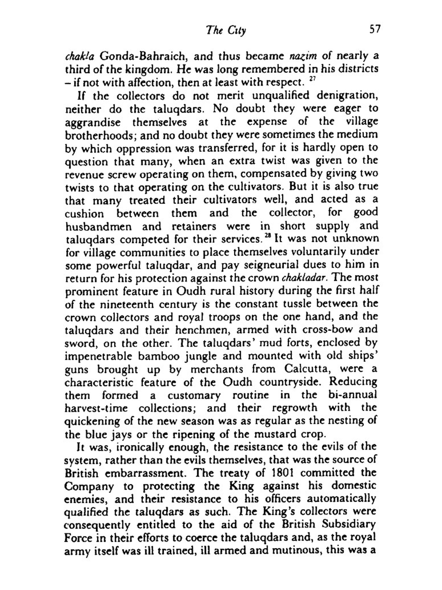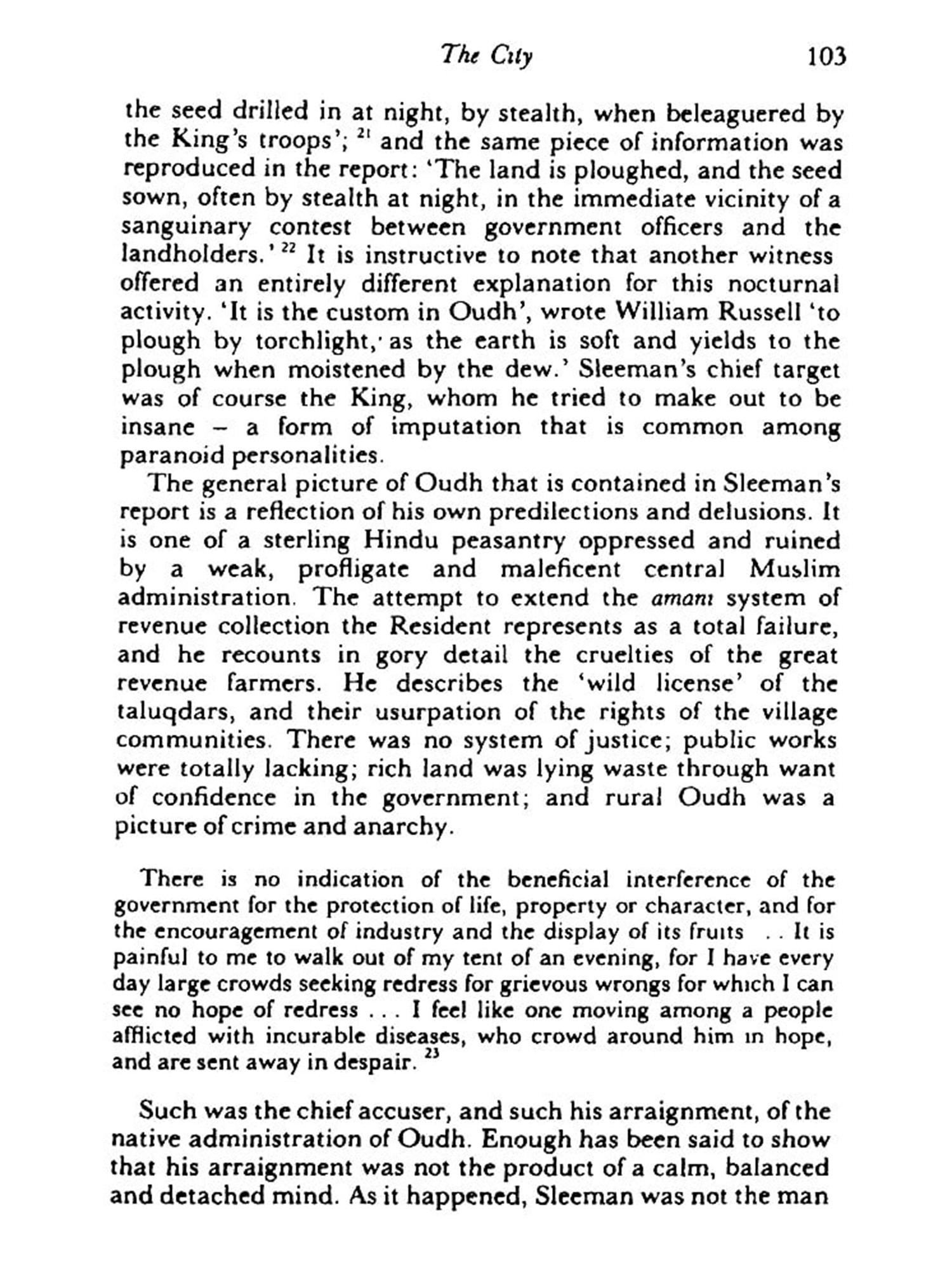 In the fourth part of the book, he sketches the metamorphosis of the taluqdar into the image of the English country gentleman, bemoans the careless neglect of the many buildings raised by the Awadh Court, and deplores the presence of the 'new Hindu rulers.