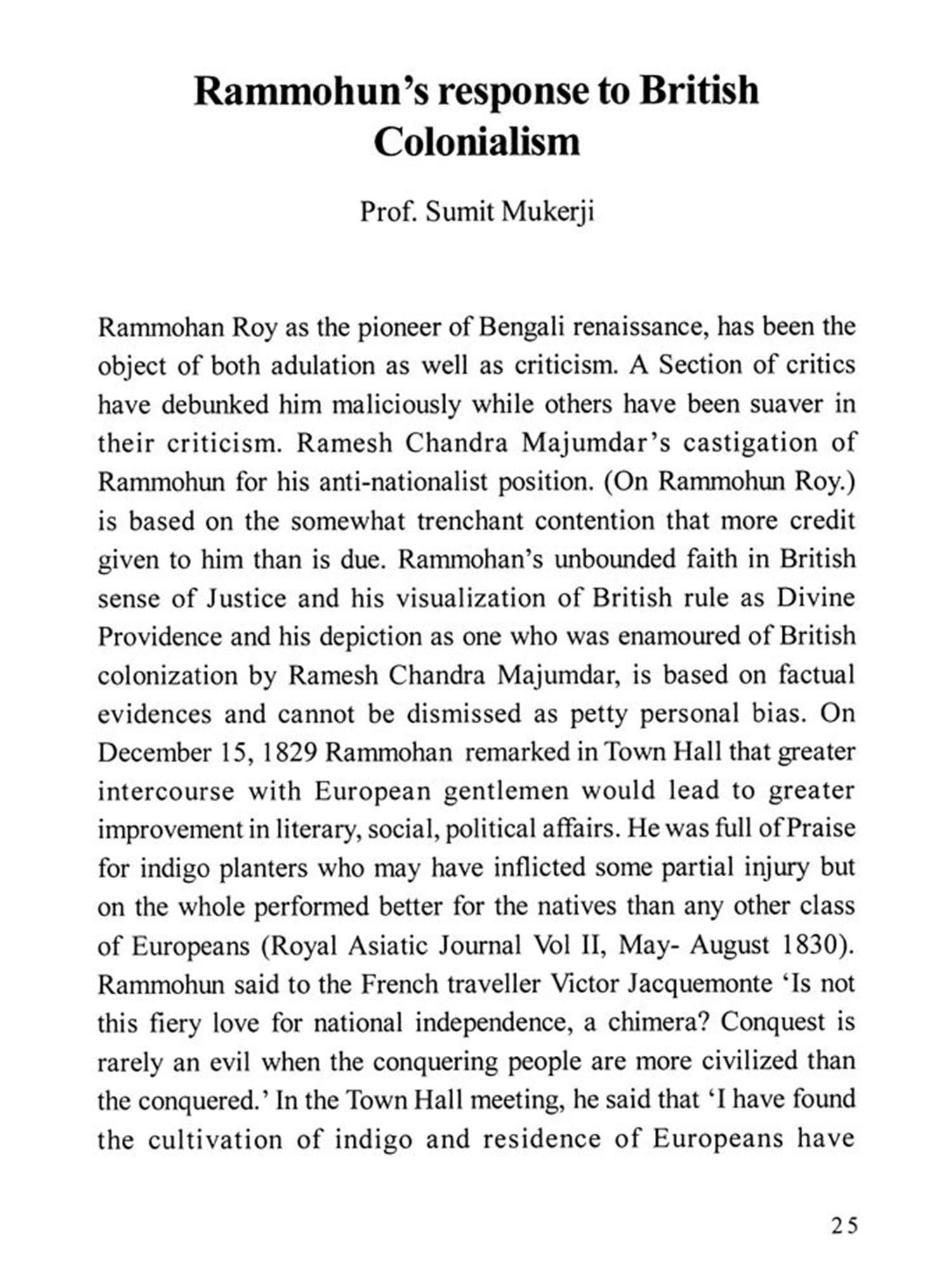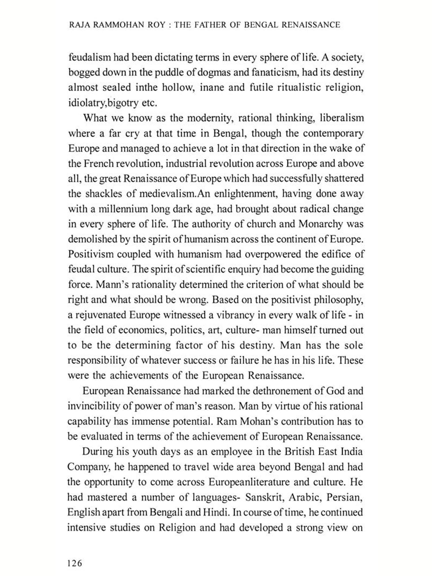 Rammohan Roy (17721833) was the pioneers of Bengal Renaissance. He was born in Radhanagar in the Hooghly district of British-ruled Bengal to a prosperous family of the Brahman class (varna). Little is known of his early life and education, but he seems to have developed unorthodox religious ideas at an early age. As a youth, he traveled widely outside Bengal and mastered several languages Sanskrit, Persian, Arabic, and English, in addition to his native Bengali and Hindi.