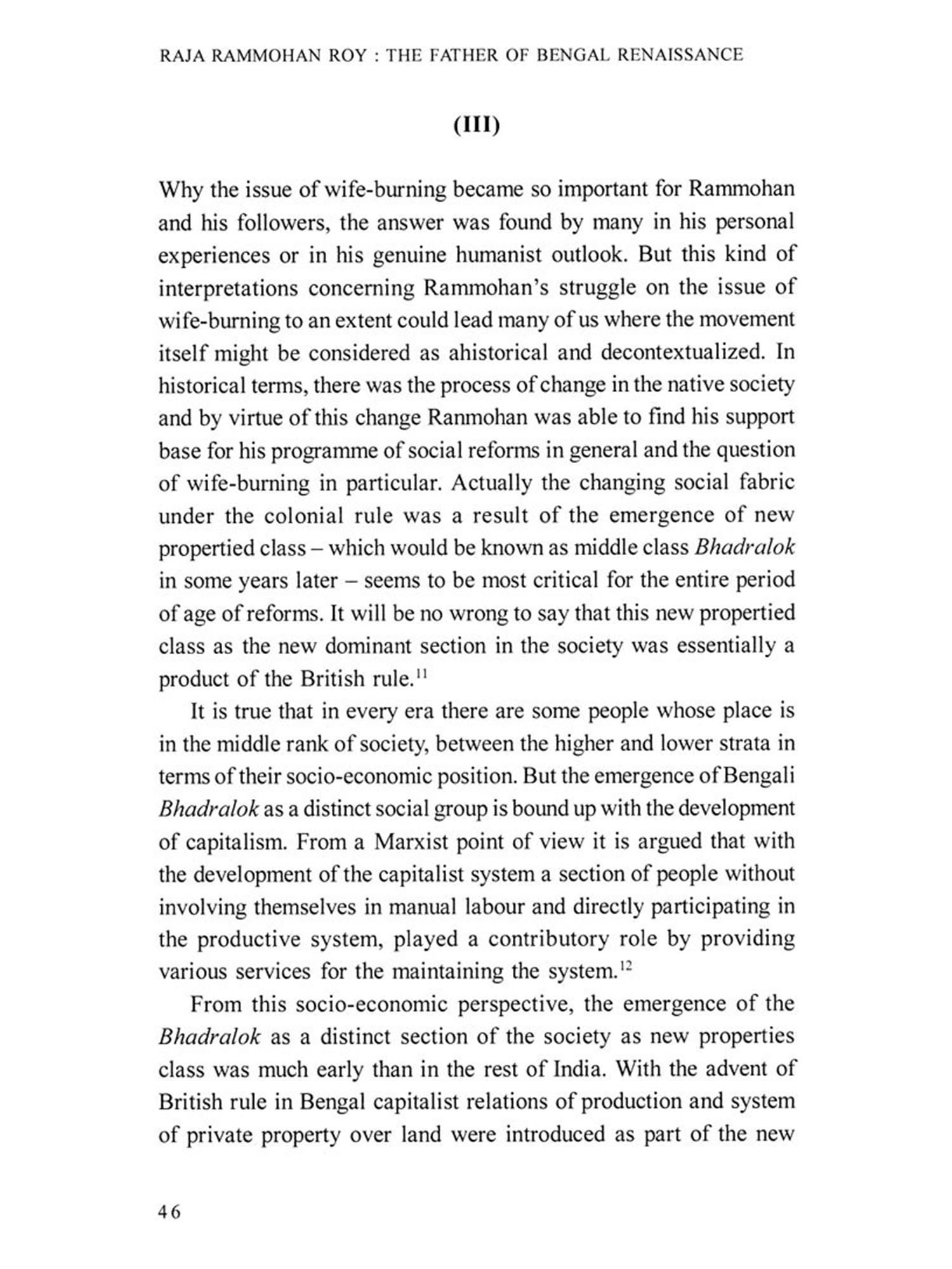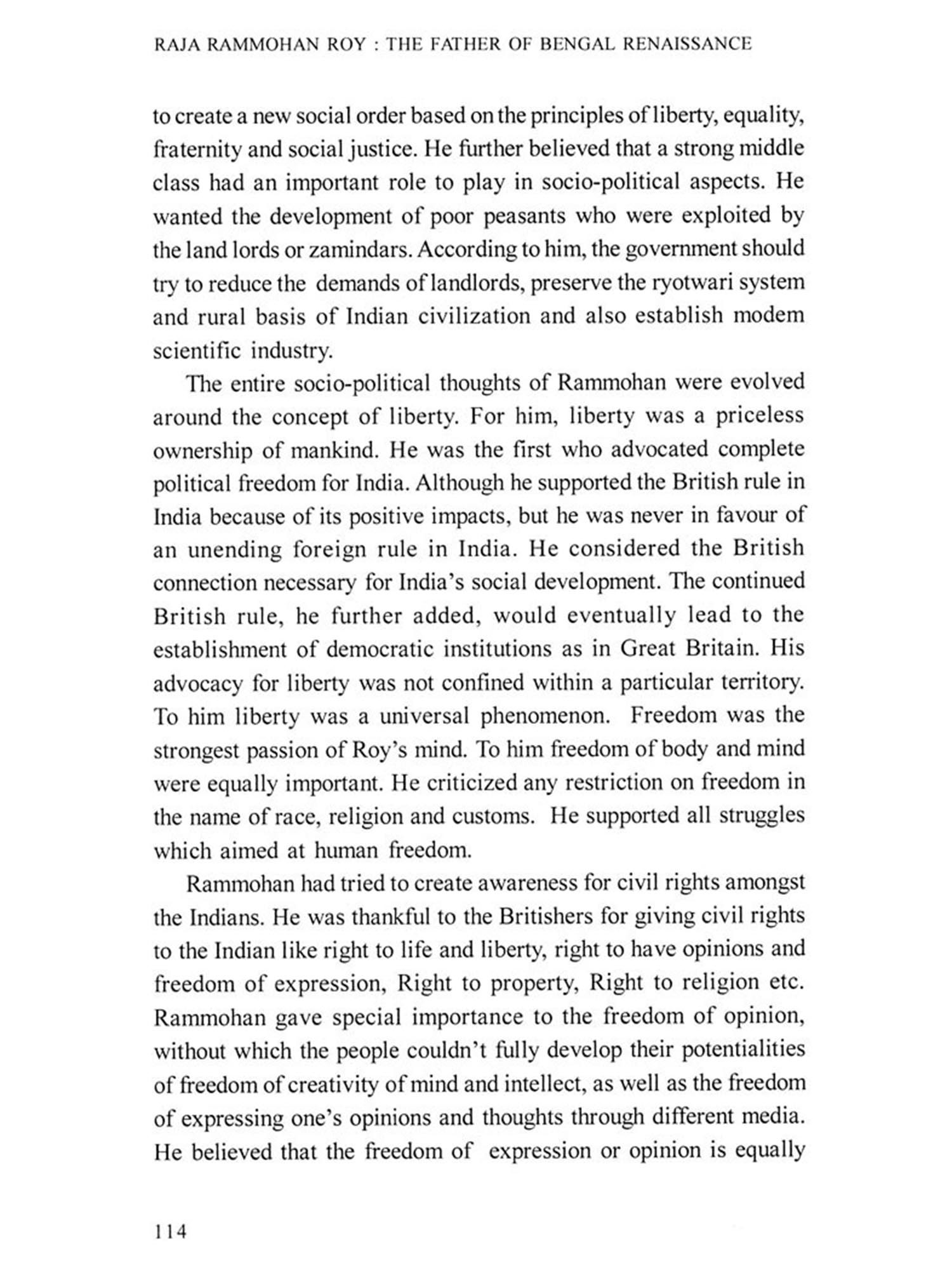 The present book is on Raja Rammohan Roy: The Father of Bengal Renaissance. It is an effort to explore the ideas of social thinker of modern India, who wrote and worked in the early years of the 19th century. Rammohan Roy's thoughts is centrally concerned with issues of freedom, social equality of all human beings. He opposed superstitious practices, customs such as Sati, polygamy, child marriage, idolatry and the rigidity of the caste system. This book is interesting and new discourse on Roy's struggle and ideas on social equality in the Indian context and it finally explores the relevance of his mission for social equality in the present times. As such the book gains importance in academic circles and hopefully shall benefit students and academicians alike.
