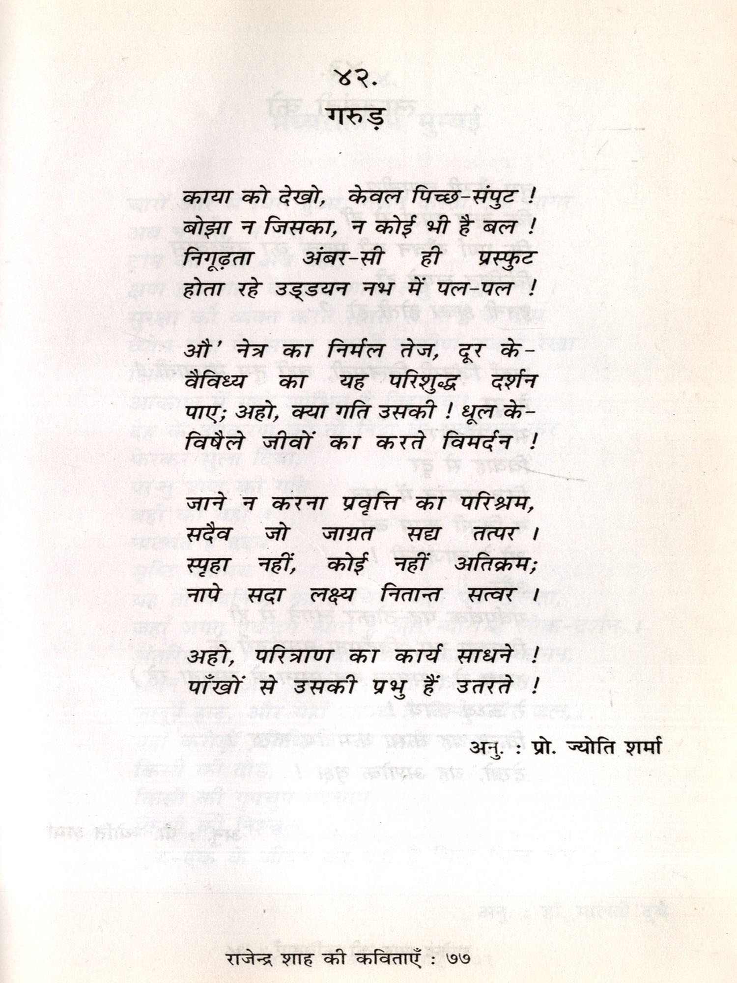 कविश्री राजेन्द्र शाह स्वातंत्र्योत्तर गुजराती कविता के प्रमुख कवि हैं । उनका प्रथम काव्य-संग्रह 'ध्वनि' १९३१ में प्रकाशित हुआ था। तब से लेकर आज तक वे निरंतर लिख रहे हैं। उनके दो दर्जन से अधिक काव्य-संग्रह प्रकाशित हो चुके हैं। इस प्रकार उनका काव्य विपुल एवं वैविध्यपूर्ण है । प्रकृति, प्रणय और अध्यात्म उनकी कविता के मुख्य विषय हैं। शब्द-शिल्प और लयात्मकता उनकी कविता की प्रमुख विशेषताएँ हैं। आज ९१ वर्ष की आयु में भी वे सृजन-रत हैं। ऐसे मूर्धन्य कवि की गुजराती कविताओं को हिन्दी-पाठकों के सामने रखते हुए हमें गौरव का अनुभव हो रहा है।