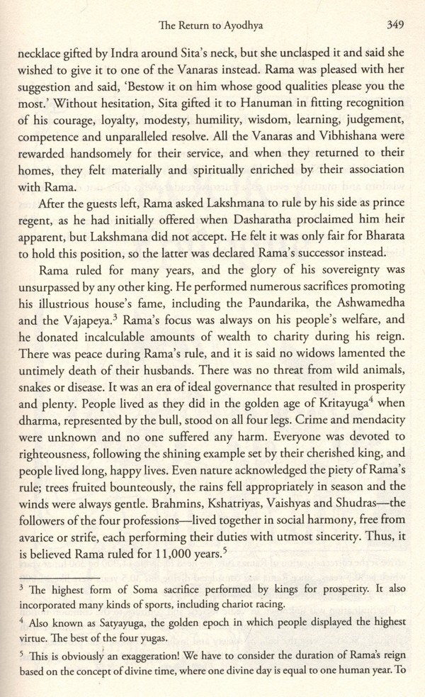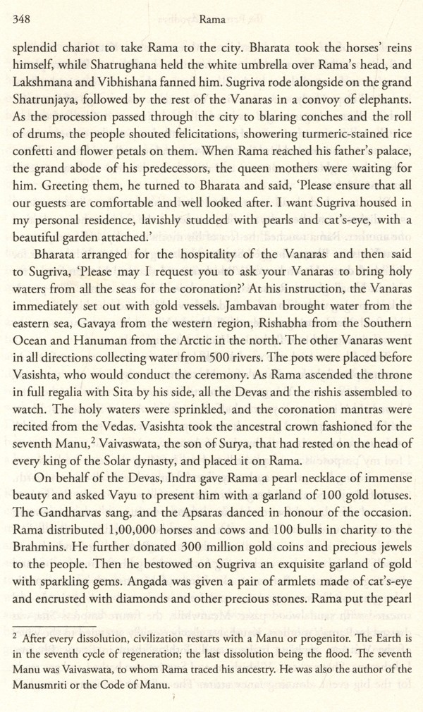I am not detracting from the godliness of Rama or his worship by those who deify him. After all, I am a devotee myself, but I see his life as a shining example of righteousness, as therein lies his greatness. Valmiki's Ramayana is about a historical character, who lived in ancient times and ruled from Ayodhya, a great king whose reign was marked by peace and prosperity, still remembered today as the golden age of Ramrajya. His monarchy left such a lasting impression that Deepavali, the festival of lights, is still observed every year, commemorating Rama's return home when his people celebrated his victory over evil by lighting oil lamps throughout the city. I have elaborated on Rama's historicity at the end of the book, which readers can refer to for more information, so I will not repeat the details here.