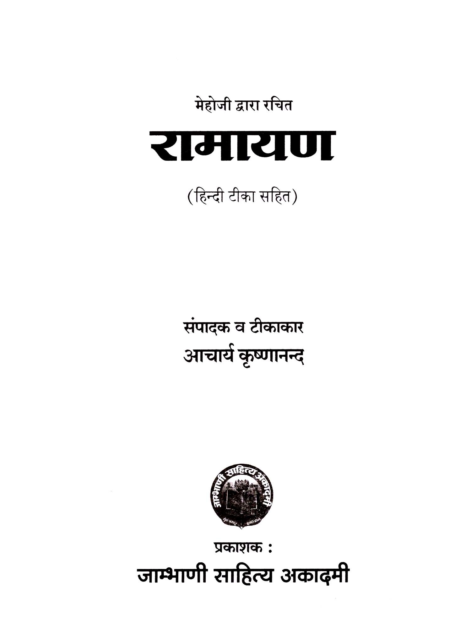 भगवान राम भारत के जन-जन के मन में बसते हैं। राम जीवन का आधार हैं। परस्पर अभिवादन, आदर्श जीवन शैली, सर्वहितकारी शासन की बात आती है तो राम ही याद आते हैं। राम भारतीय संस्कृति के तो प्राण है ही इसके साथ उनके विलक्षण व्यक्तित्व ने भारत की सीमाओं को लांघकर सुदूर देशों की सांस्कृतिक चेतना को भी गहरे तक प्रभावित किया है। भारत के विभिन्न मत-पंथों के साहित्यकारों ने राम पर भरपूर लिखा है। जाम्भाणी साहित्य भी रामगाथा की अजस्र धारा में आप्लावित हुए बिना नहीं रह सका। जाम्भाणी साहित्य के मूलाधार ग्रंथ गुरु जाम्भोजी के श्रीमुख से निसृत 'सबदवाणी' में विभिन्न प्रसंगों में श्रीराम के उदात्त चरित्र का वर्णन मिलता है तो वहीं इस साहित्य में रामचरित्र पर स्वतंत्र रचनाएं भी मिलती है, जिसमें मेहोजी द्वारा रचित रामायण उत्कृष्ट कोटि की रचना है। संवत 1575 (सन् 1518) के आसपास रचित यह रामायण गोस्वामी तुलसीदास कृत श्रीरामचरितमानस से लगभग साठ वर्ष पूर्व की रचना है और साहित्य जगत की अमूल्य धरोहर है। जाम्भाणी साहित्य के मूर्धन्य विद्वान डॉ हीरालाल माहेश्वरी ने सन् 1984 में इस पर टीका लिखी थी जो रामकथा अनुरागियों द्वारा बहुत पसंद की गई परन्तु वह पुस्तक बहुत वर्षों से अप्राप्य है। पाठकों की हार्दिक इच्छा को देखते हुए अकादमी ने जाम्भाणी साहित्य ऋषि आचार्य कृष्णानंदजी से इस पर टीका लिखने का आग्रह किया, जिसे आचार्यश्री ने सहर्ष स्वीकार करते हुए बहुत सुंदर टीका पाठकों के समक्ष प्रस्तुत की है। जाम्भाणी साहित्य अकादमी इस कार्य के लिए पूज्य स्वामी कृष्णानंदजी के प्रति कृतज्ञता ज्ञापित करती है।