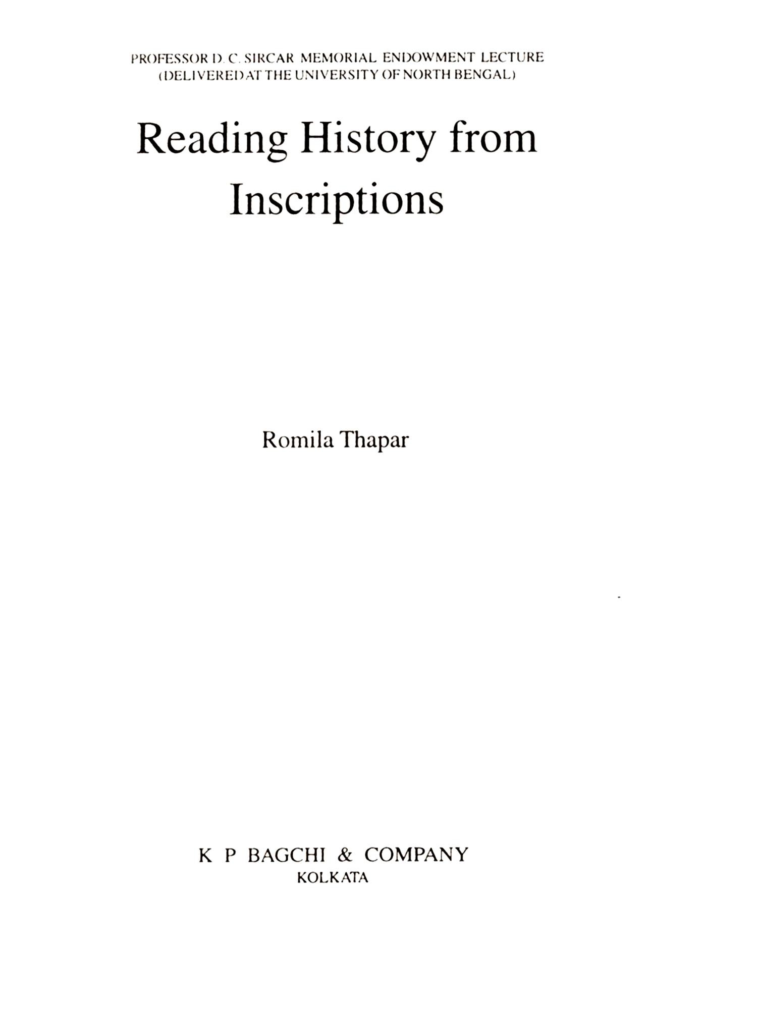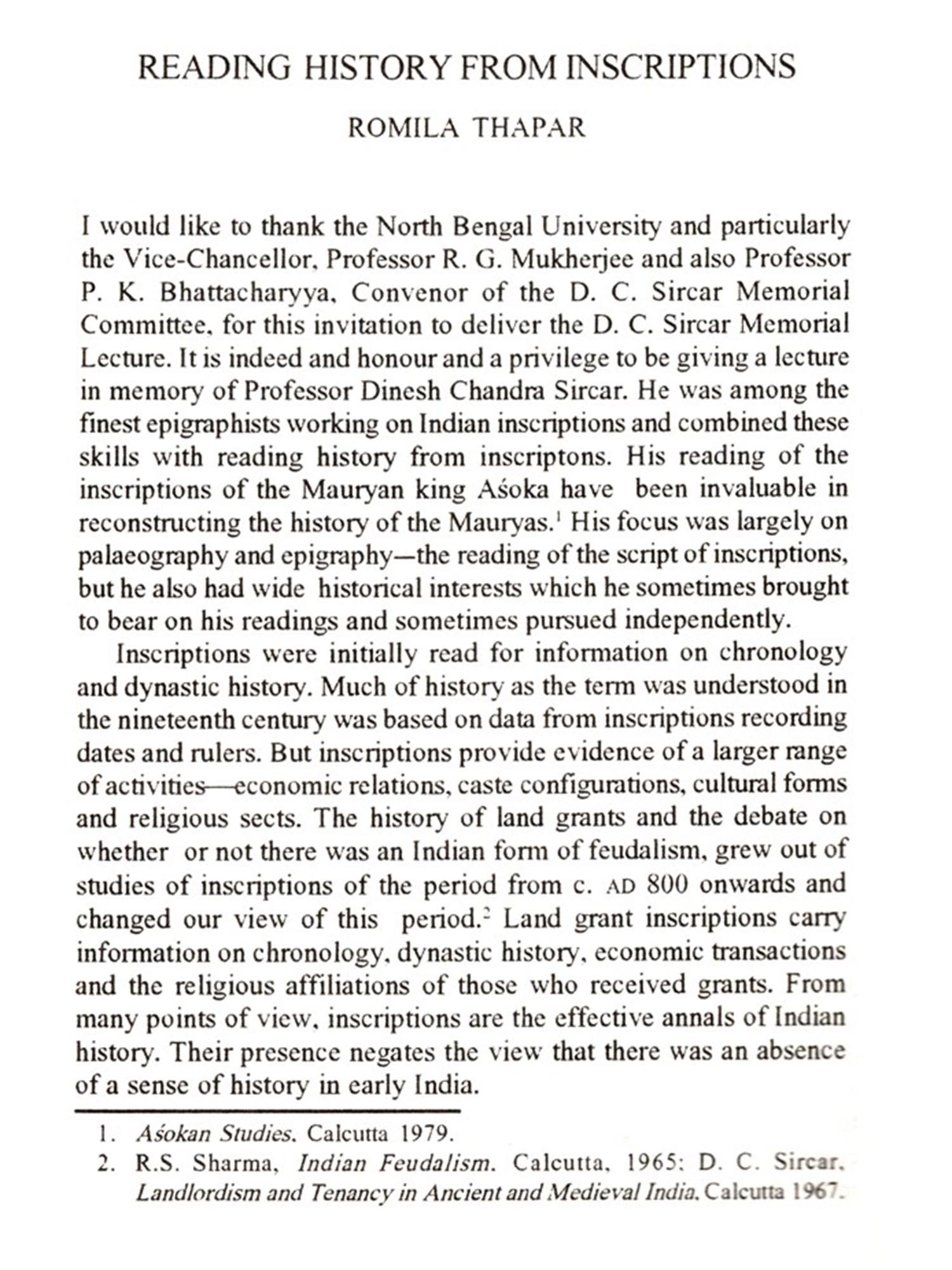 It was in the year 1996 in the month of November 21-23, a Na tional Seminar on Indian History was organised by the Lalit Chandra Bharali College, Maligaon, Guwahati on the occasion of the Silver Jubilee of the college. The organisers kindly invited me to be present on the occasion. Three other eminent scholars from Jawaharlal Nehru University including Professor Romila Thapar and one from Aligarh Muslim University were also invited on this occasion. Professor Thapar's name was though not un-familiar to me, but the Guwahati Seminar gave me an opportunity of ex-changing our ideas on a number of knotty problems of Ancient Indian History. During this period I proposed Professor Thapar if she could deliver the First Dr. D. C. Sircar Endowment Lecture at our University. She kindly gave her consent, but could not confirm the date of the lecture at that time. After going back to New Delhi. she wrote to me that in view of her pre-occupations (since dates were fixed earlier) in a number of other Universities in India and abroad, it would not be possible to come to North Bengal University in immediate future. Moreover, she also wrote to me she would require sufficient time to prepare a lecture that goes in the name of Dr. D. C. Sircar a name conjures in our mind as the symbol of precision and scholarship. We were touched at the sincerity of Professor Thapar and accepted the dates as proposed by her.