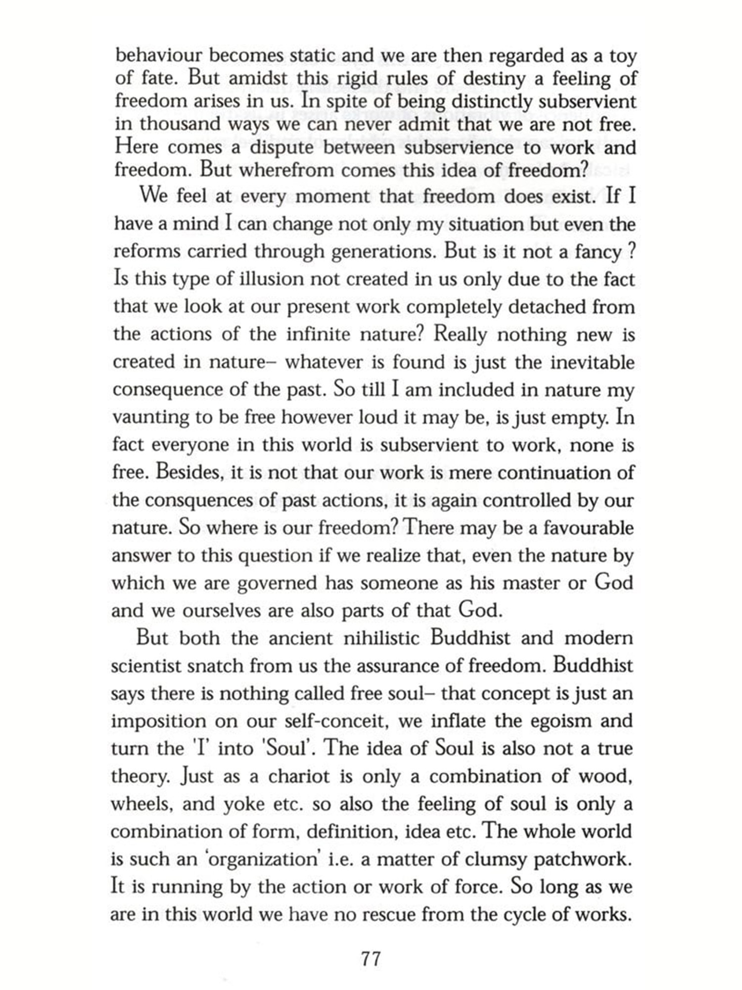 Sri Anirvan had trancreated the theme in the light of his knowledge, intelligence and wisdom endowed with Vedic and philosophical insight into the ultimate reality and consciousness. It is just like setting a lyric to music. Sri Anirvan's style is very lucid and language very sweet and comprehensible. He has not made his statements prickly with scientific terms and technical words hard to cognize. In the translation I have tried my best to keep up this style as far as practicable. Knowing fully well that my capability falls short of the requirement I have dared to take up the responsibility out of my sincerest reverence to His Nobility Sri Anirvan and a sense of duty to our posterity. I would deem my effort amply rewarded if it comes to any use to those for whom it is intended.