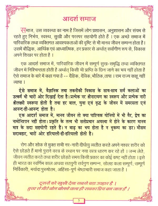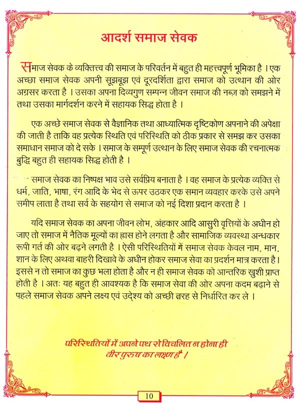 प्रस्तुत चित्र-संग्रह में यथा-स्थान यह भी बताया गया है कि समाज की प्रायः सभी समस्याओं की उत्पत्ति नैतिक मूल्यों के ह्रास के परिणामस्वरूप हुई है। आज जो मानसिक तनाव है, उस के कारण जो कई रोग हैं, लड़ाई-झगड़े और कलह-क्लेश हैं. या जो हिंसा की वारदातें हैं, वे मन को आनन्द एवं शान्ति के स्रोत परमात्मा से जोड़ने ही से निवारण हो सकते हैं। ऐसा योगाभ्यास ज़रूरी है। अतः समाज सेवक को इन अमोध उपायों का प्रयोग करना चाहिए। इस संदर्भ में कुछेक धर्म-स्थापकों या महान व्यक्तियों का भी उल्लेख किया गया है जिन्होंने नैतिक स्तर पर समाज सेवा की। आशा है कि पाठकवृन्द इस चित्रावली से सेवा की एक नई दिशा में अग्रसर होंगे और इस से स्वयं भी लाभान्वित होंगे तथा इसकी प्रतियों की भेंट अन्यान्य को भी देंगे ।