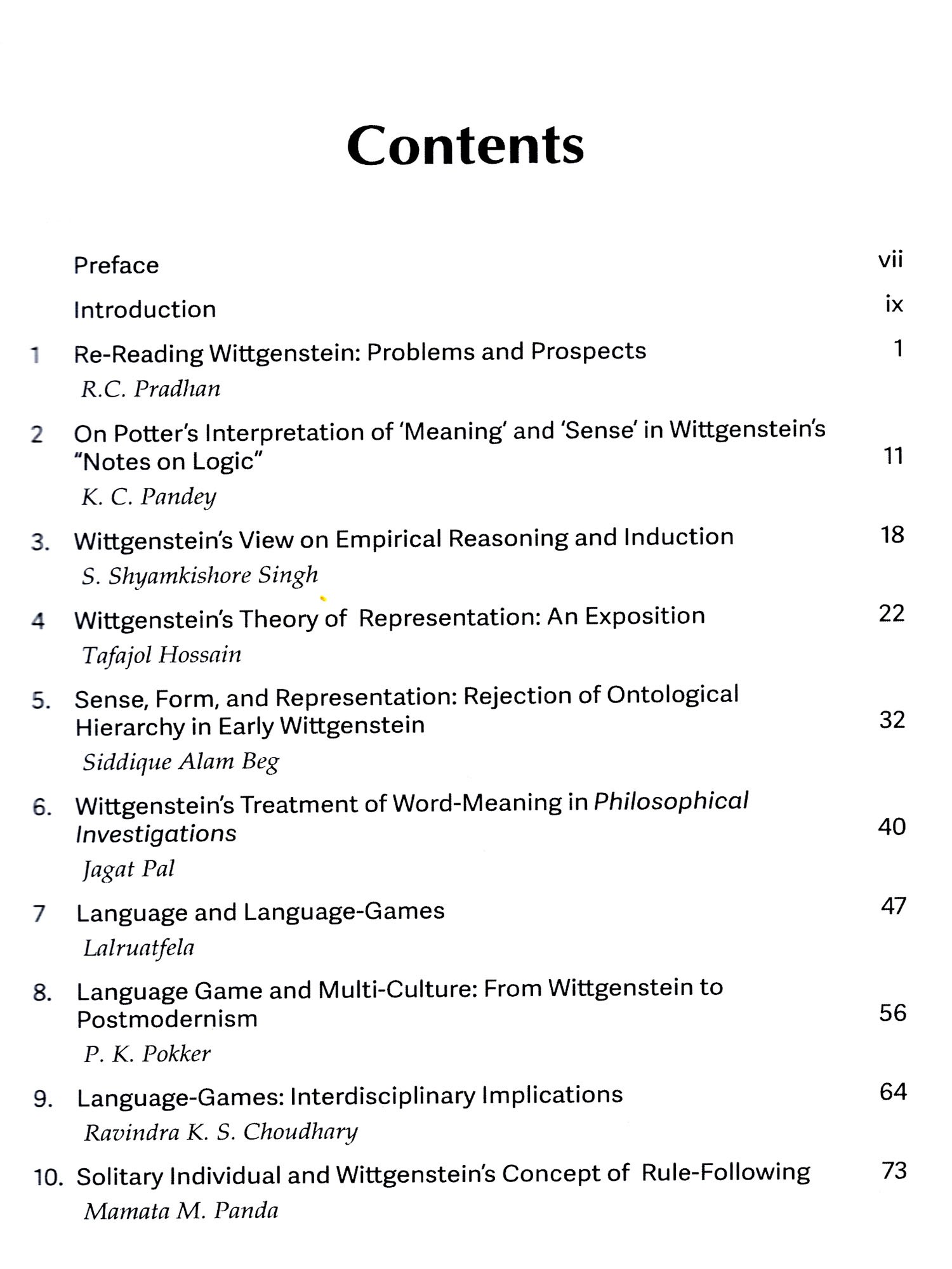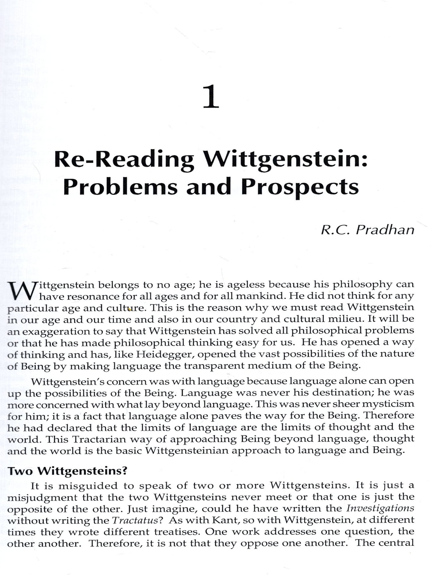 Professor R. C. Pradhan's essay, "Re-reading Wittgenstein: Problems and Prospects", which explores various dimensions of the philosophy of Wittgenstein, has been placed at the top in order to act as a foundation to the anthology. Pradhan has claimed that Wittgenstein's philosophy being rich and multi-faceted cannot be put into any strait-jacket. It is open to multiple interpretations from realism to idealism, from naturalism to transcendentalism and from modernism to post-modernism. Wittgenstein seems to be open to the ideas from all traditions with which he has been acquainted. In that sense, he does not belong to any school of philosophy; he is a philosopher of philosophers. Wittgenstein has always been an eternal explorer, a nomadic in the field of thought. That is the reason why he has explored without any bias and prejudice of thought, language and reality covering the entire domain of man's encounter with Being. This essay resists any attempt to freeze Wittgenstein's thought within the narrow confines of sectarian philosophy and the outmoded styles of interpreting philosophy.