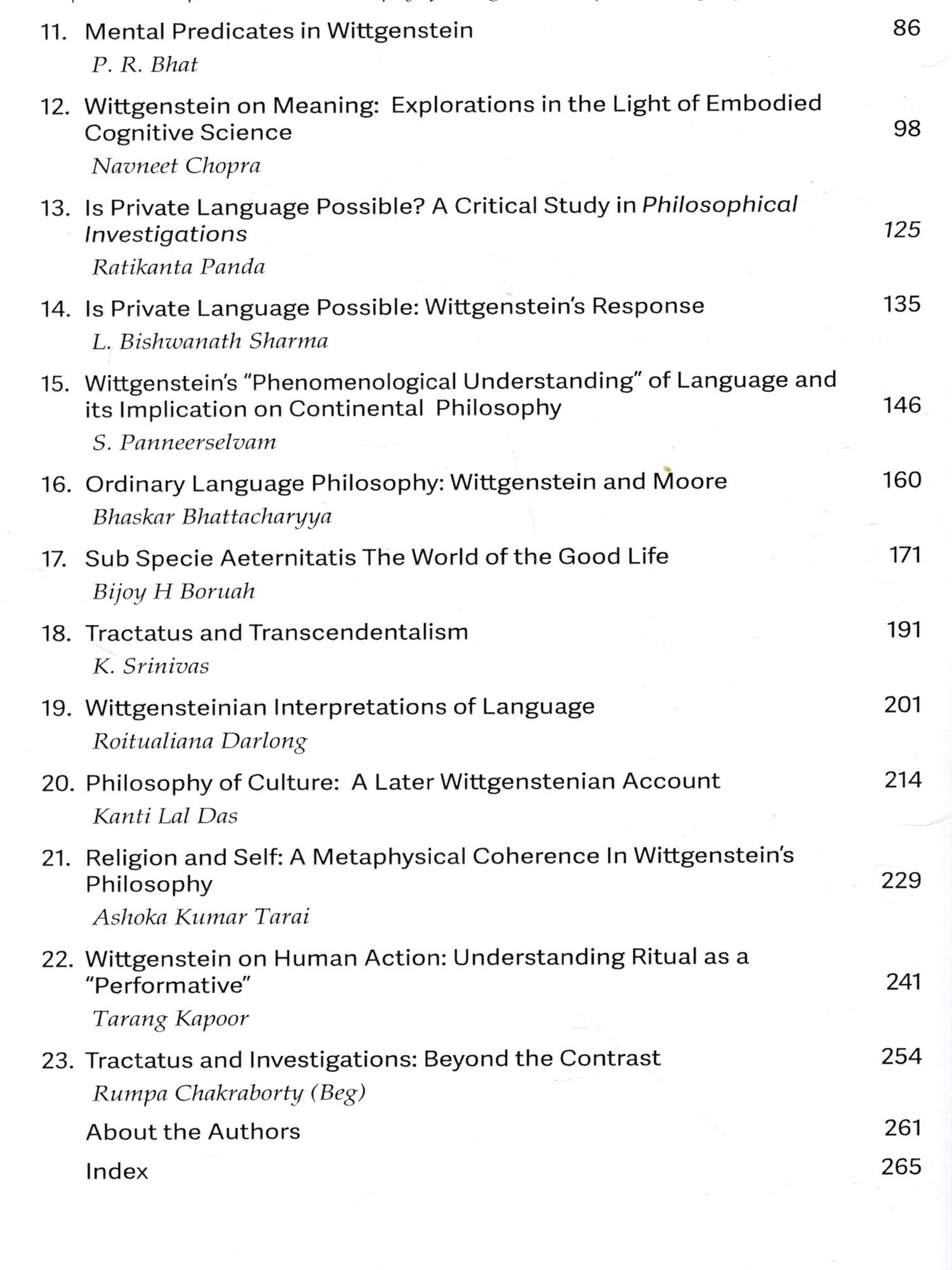Twenty three essays constitute this anthology which can be divided into two I kinds: first, essays which aim at explicating the meaning of Wittgensteinian concepts, and second, essays which use them as a tool to explore, examine, and understand further philosophical developments. These two parts of the book mutually complement each other as former provides the background for the latter. Here an attempt has been made to include the issues which have often been occurred in India during recent debates and discussions in the area of Wittgensteinian philosophy, theology, logic, ethics, religion, social science, culture studies, psychology and linguistics.