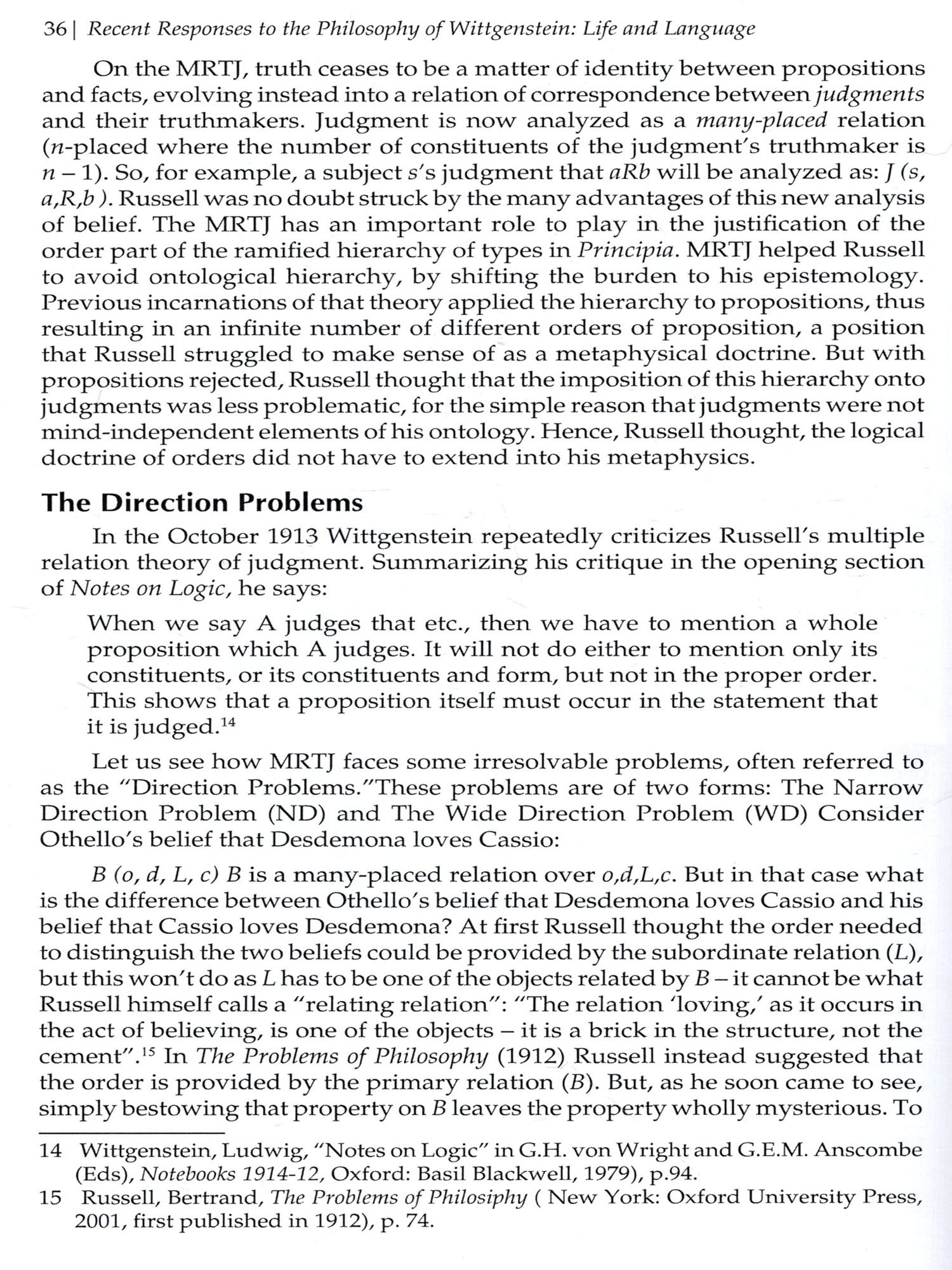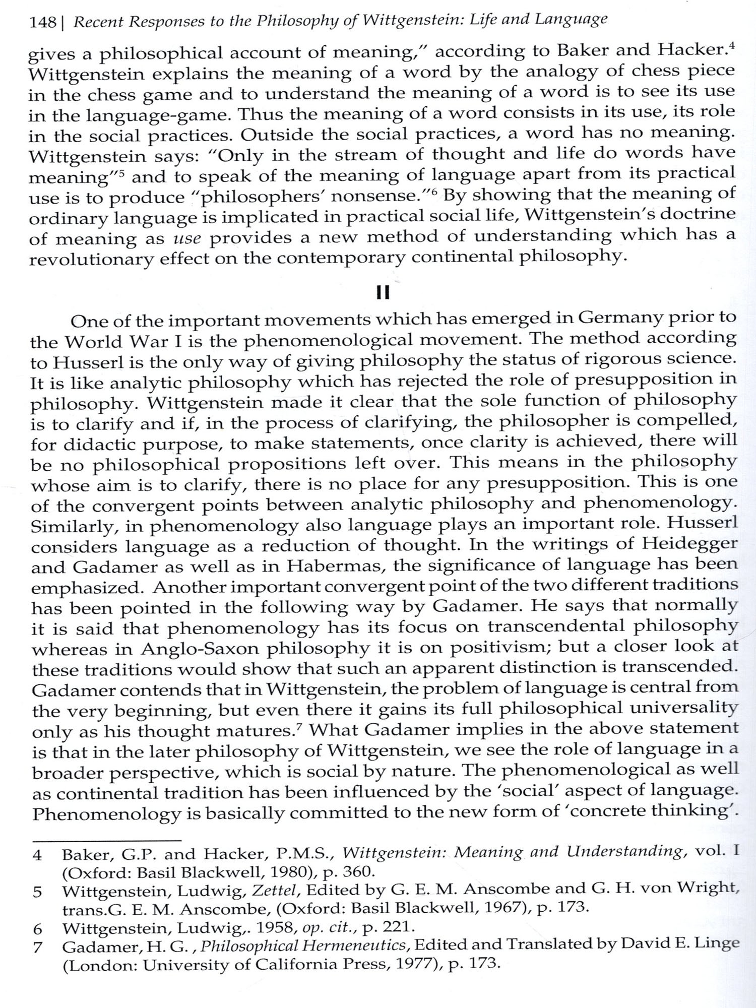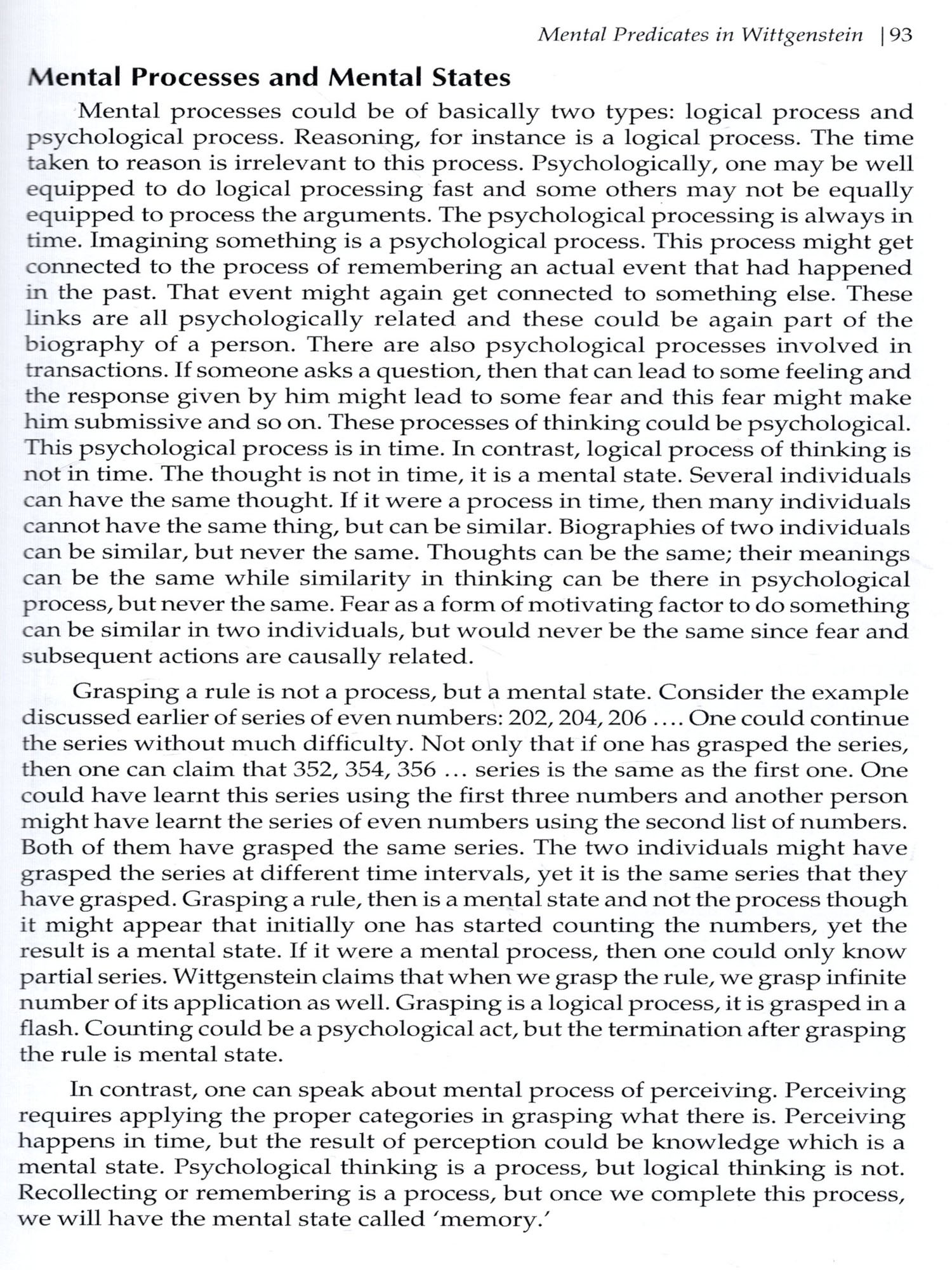 Professor Pradhan's essay sets the general background of the issues discussed in the anthology and the next four essays deal with Wittgenstein's thoughts on Logic: the first on Wittgenstein's 'Notes on Logic', the second on Wittgenstein on Induction, the third on the logical representation of the world, and the fourth on Early Wittgenstein as a critique of Russellian logic in particular and logical representation in general. The "Notes on Logic" is regarded as the first philosophical issue with which Wittgenstein engaged himself. Professor K. C. Pandey in his essay "On Potter's Interpretation of 'Meaning' and 'Sense' in Wittgenstein's 'Notes on Logic" has interpreted the notions of 'meaning' (Bedeutung) and 'sense' (Sinn) as described in Micheal Potter's insightful work Wittgenstein's Notes on Logic. He has shown that the value of this book had already been outlined in the publication of its book reviews that had specifically established that Wittgenstein's "Notes on Logic" was an independent and primordial work which acted as a catalyst at least to "Notes dictated to G.E. Moore in Norway [1914]", Notebooks 1914-16, and Tractatus Logico-Philosophicus. After analysing the positions of Frege and Russell on the notions of 'meaning' and 'sense, this essay brings out Wittgensteinian perspective as well as expositions of Potter's interpretations on multiple issues. The next essay "Wittgenstein's view on Empirical Reasoning and Induction" on the issue of Wittgenstein on logic belongs to Professor S. Shyamkishore Singh. According to him, Ludwig Wittgenstein's remarks on induction in Tractatus and Philosophical Investigations throw light on the nature of empirical reasoning and probability relations between the events. For Singh, Wittgenstein in Tractatus has maintained that the so called law of induction cannot be a law of logic. It is so because it is not possible to infer the existence of one situation from the existence of another situation, because there is no casual nexus between them. (TLP, 5.135, 5.136). Regarding the 'uniformity of nature', Wittgenstein has held that we have no ground for such a hypothesis in the light of which we may make predictions about the future from past experiences. Further, Singh has investigated that Wittgenstein in Philosophical Investigations, has maintained that one cannot justify a conclusion on the ground that the something has been found to pay (P1, 467) as any attempt to justify in this manner would be circular. Experience provides grounds for predictions. But a good ground makes the occurrence of the event only probable. On the justification of induction Wittgenstein observed that our day to day regular reactions to the contingent happenings around us constitute the framework within which we learn to give reasons for doing and believing. He has placed it within the framework of our language games, and not within the fold of any deductive reasoning. Wittgenstein, however, admitted the importance of induction from the pragmatic standpoint.