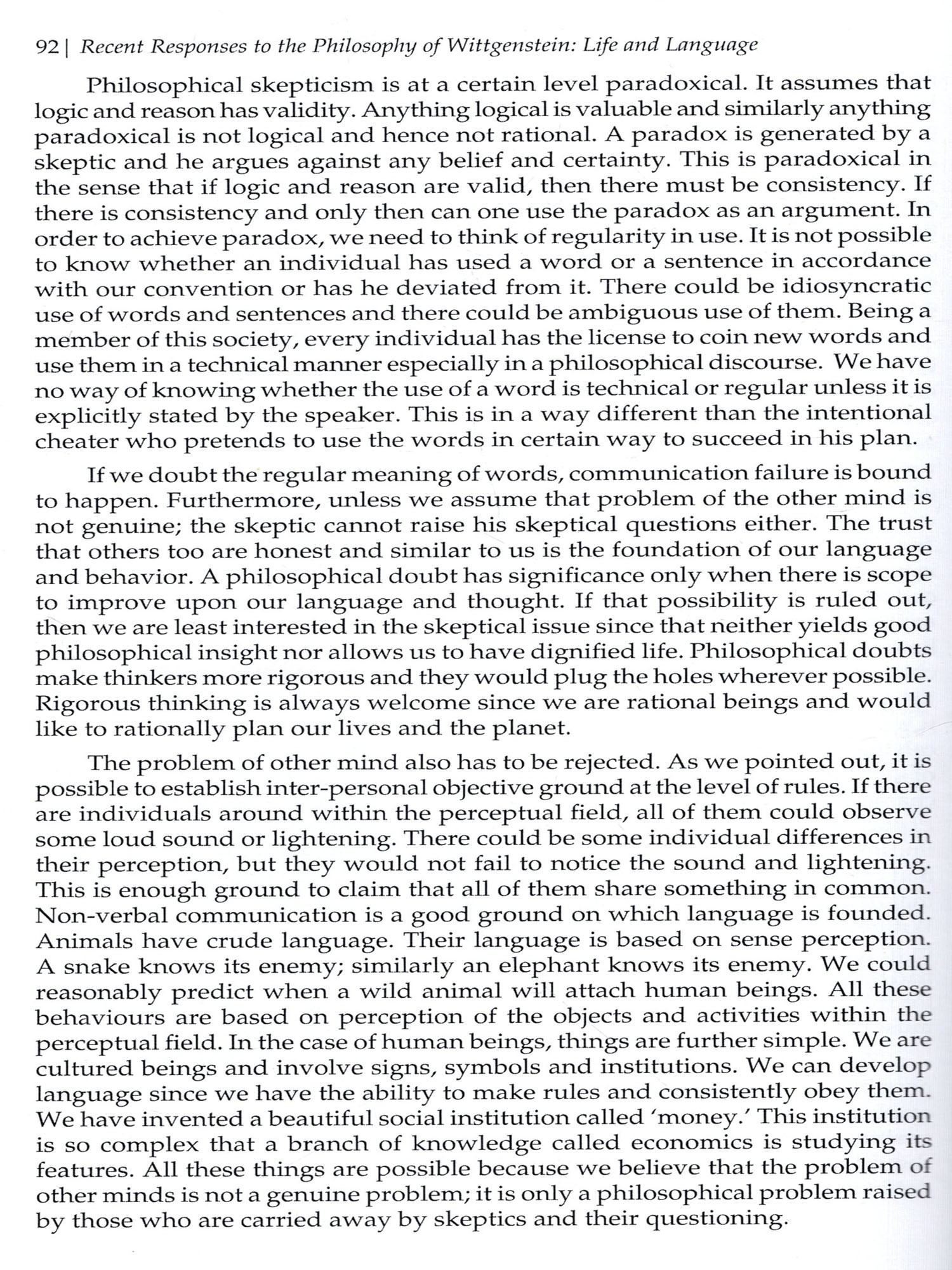 Life keeps on moving despite obstacles and Ludwig Wittgenstein Philosophical Society has had its own share of ups and downs. However, this is the time to forget the pain and thank all the life members of the society for their trusting me. I never had even an iota of doubt in success of the academic activities of the society. The members of the society contributed to this success story and so I'm grateful to them all.Dr.Ratikanta Panda always motivated me in registering the society as well as organising the conference. Prof. Tafajol Hossain, Dr. Roitualiana Darlong, Dr. Mamata Manjari Panda, and Dr. Tarang Kapoor have rendered friendly help in formatting the manuscript. Mrs Sangeeta Sinha has provided much needed professional proofreading and for this I'm grateful to her.