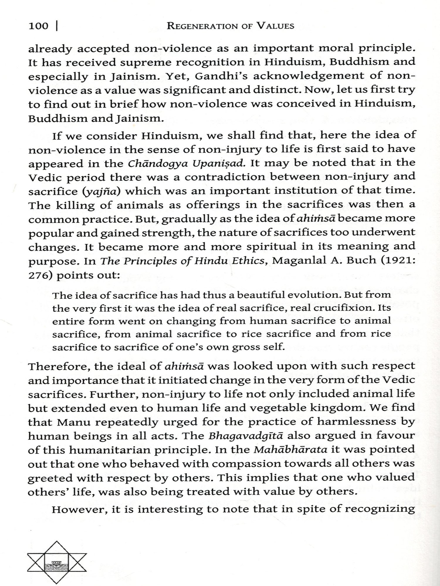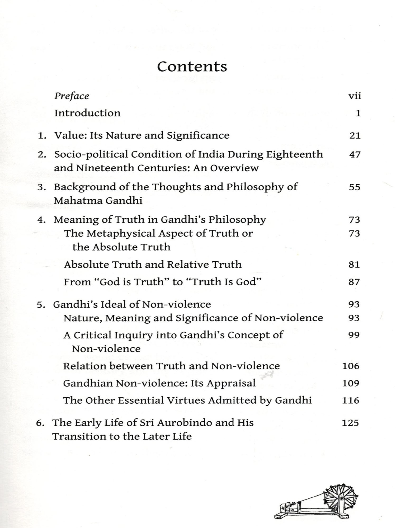 THE PRESENT book seeks to make a humble attempt to explore the nature of the different values suggested and pursued by Mahatma Gandhi and Sri Aurobindo, the two great social, moral and spiritual thinkers of late nineteenth-twentieth century India. It also attempts to find out the relevance and the possibility of regenerating those values in the contemporary lived-world.